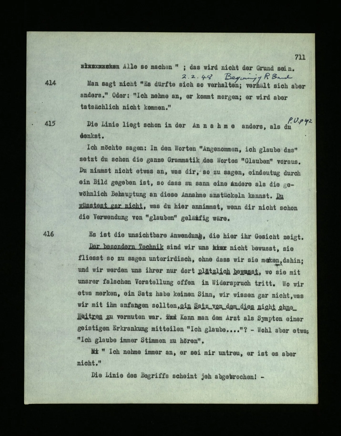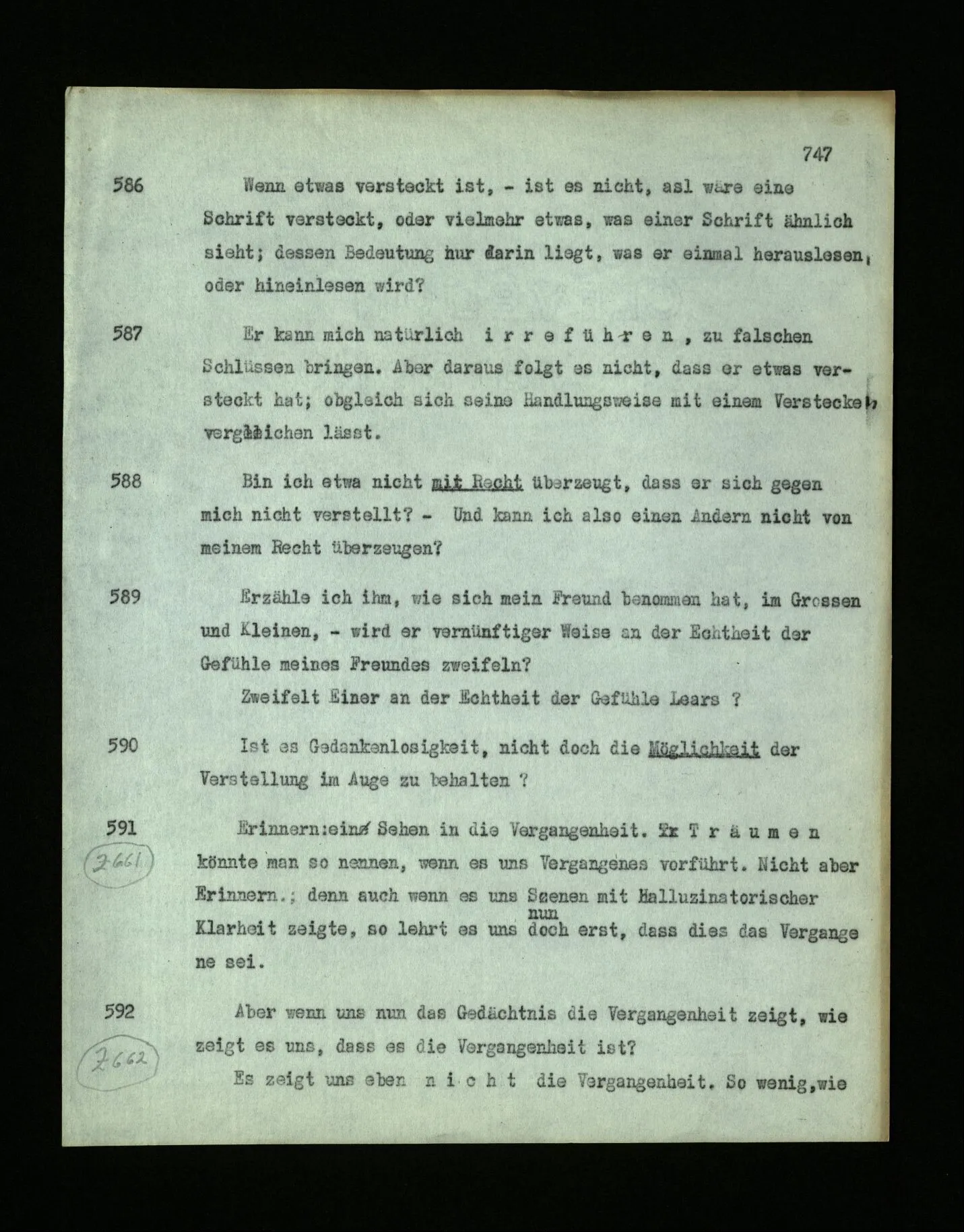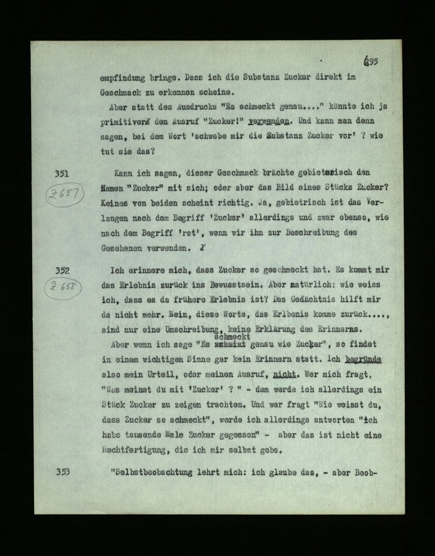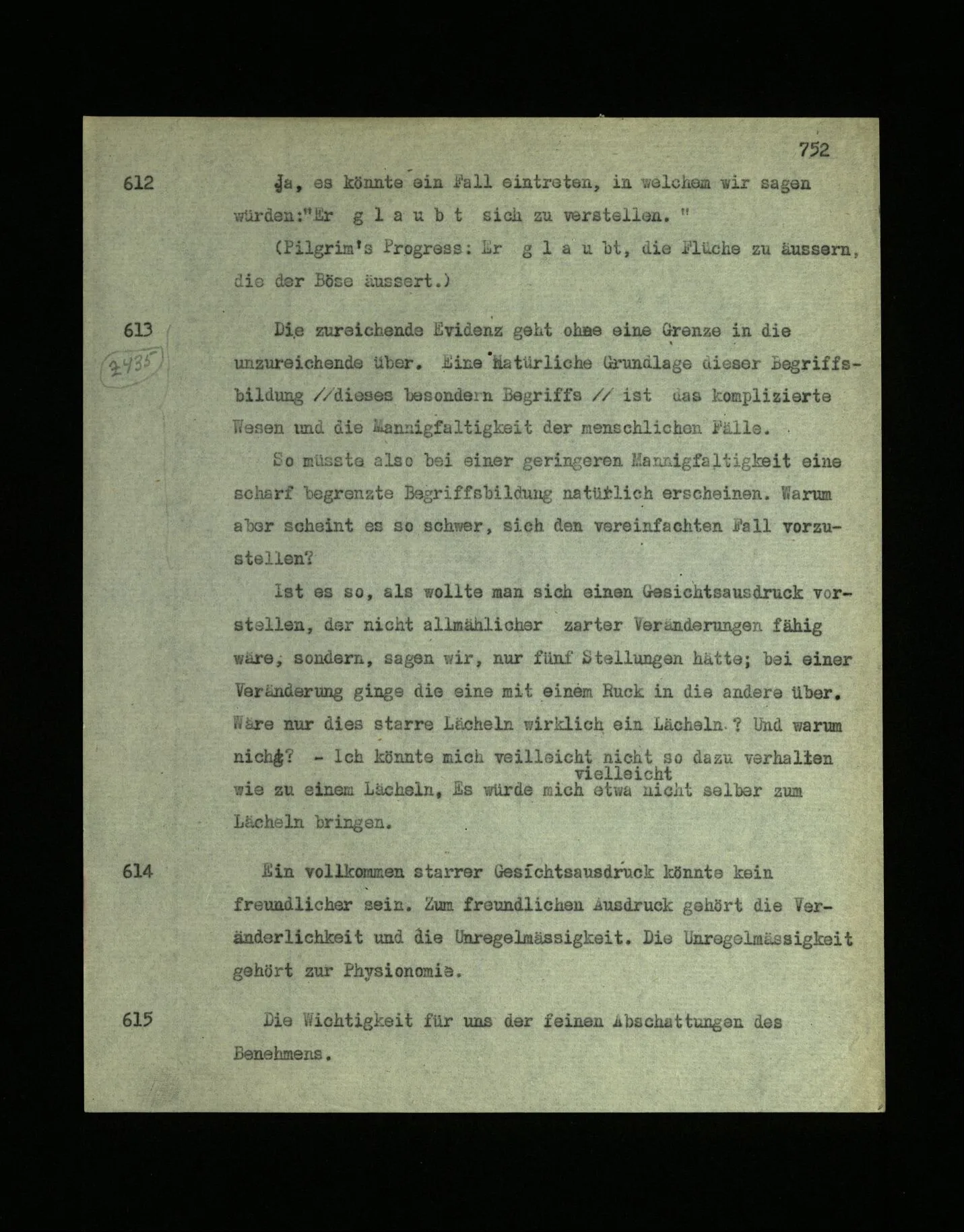 713 Es ist für unsere Betrachtung wichtig, daß es Menschen gibt von denen jemand fühlt, er werde nie wissen, was in ihnen vorgeht. Er werde sie nie verstehen.