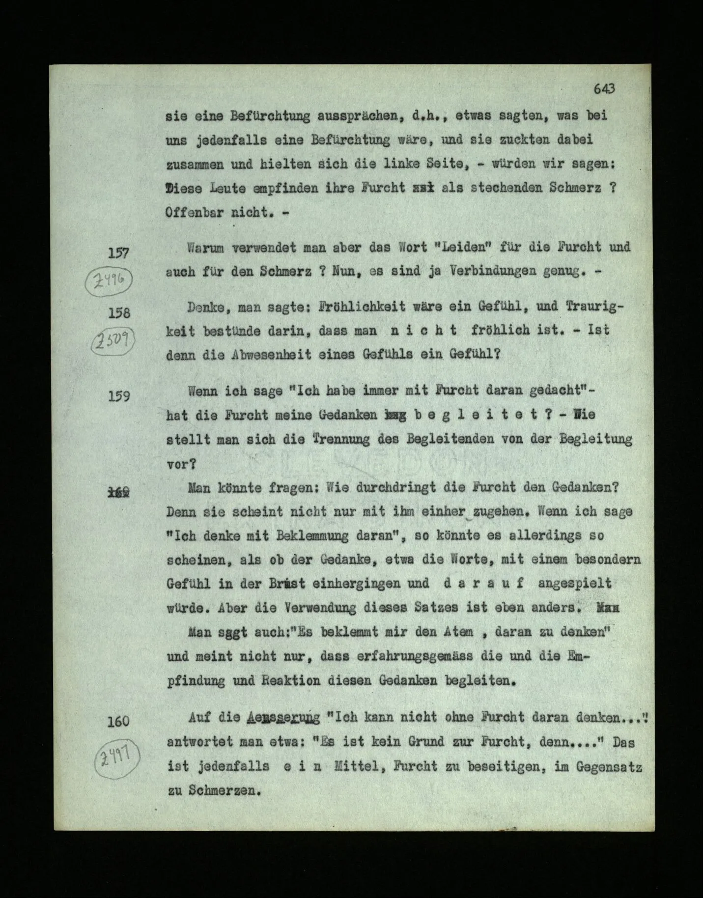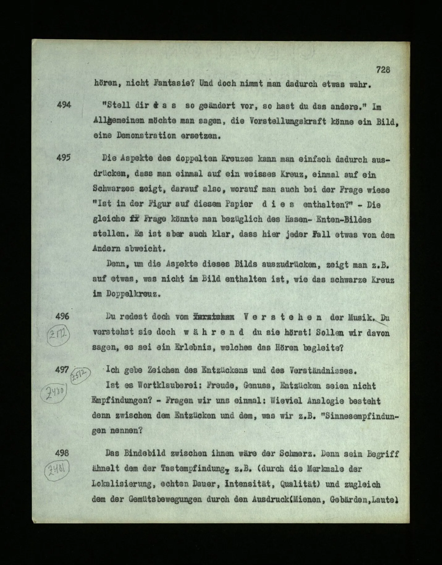 718 Du sagst, du pflegst den Stöhnenden, weil Erfahrung dich gelehrt hat, daß du selbst stöhnst, wenn du das und das fühlst. Aber da du ja doch keinen solchen Schluß ziehst, so können wir die Begründung durch Analogie weglassen.