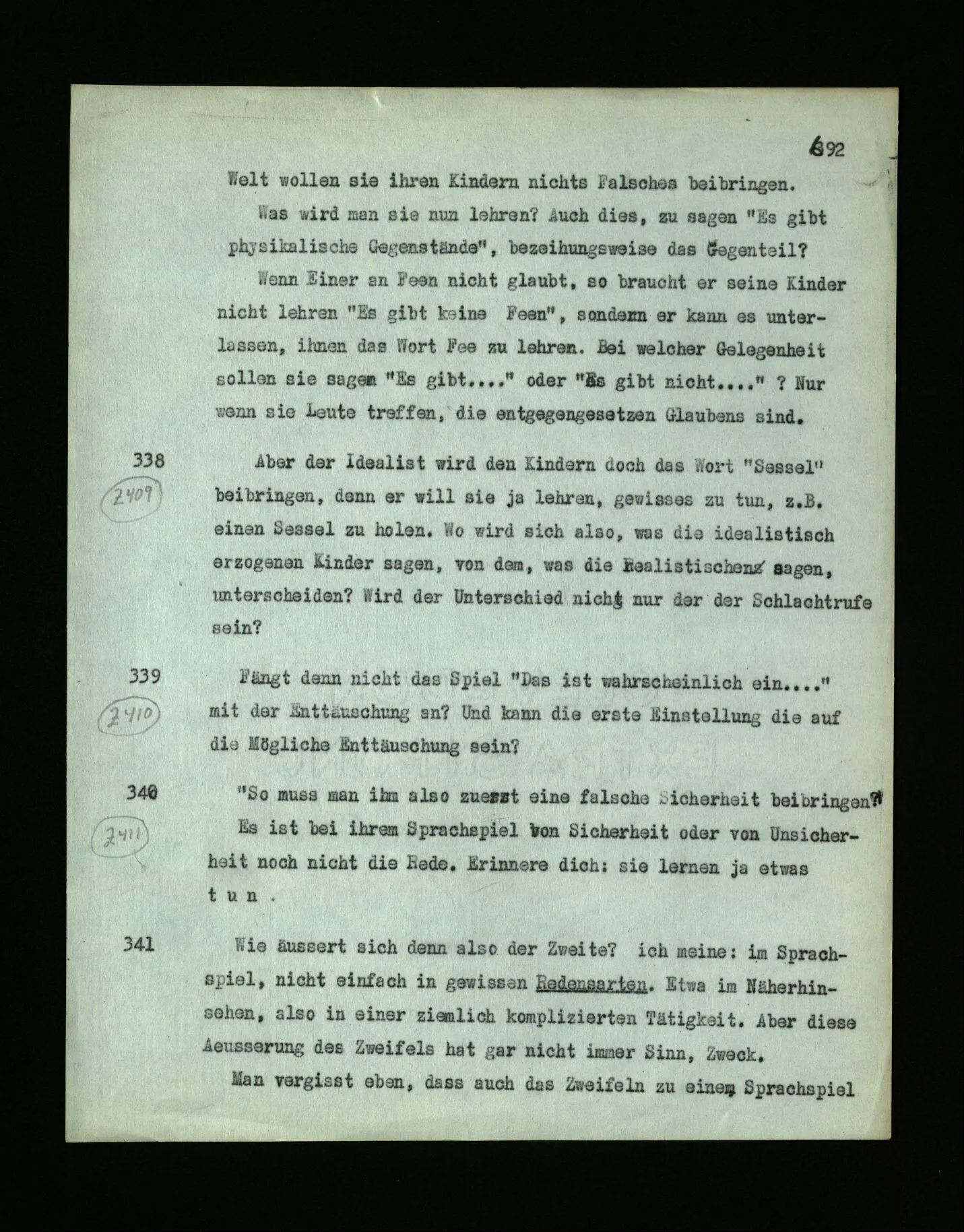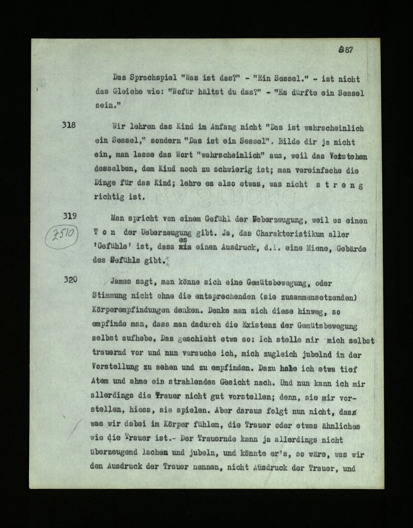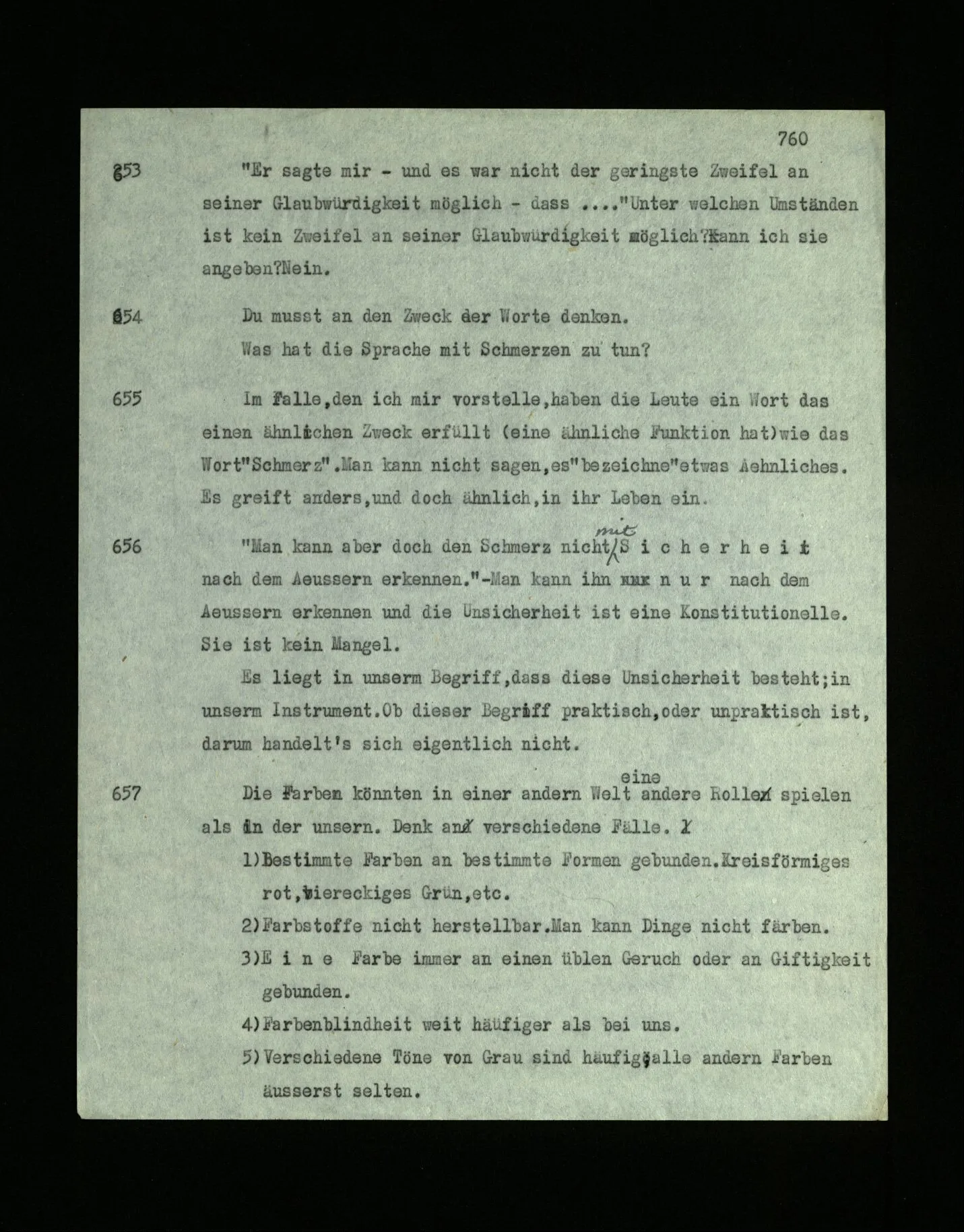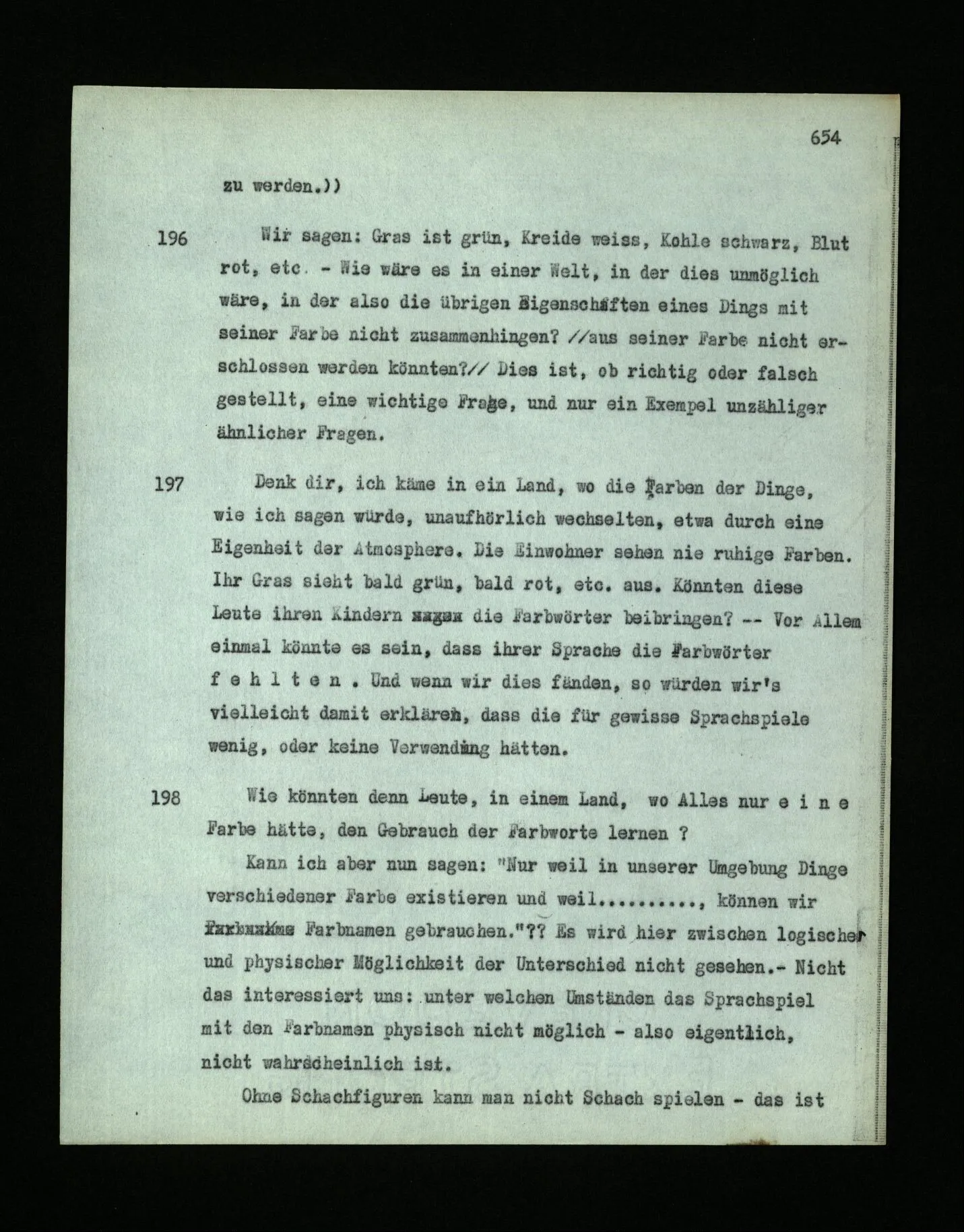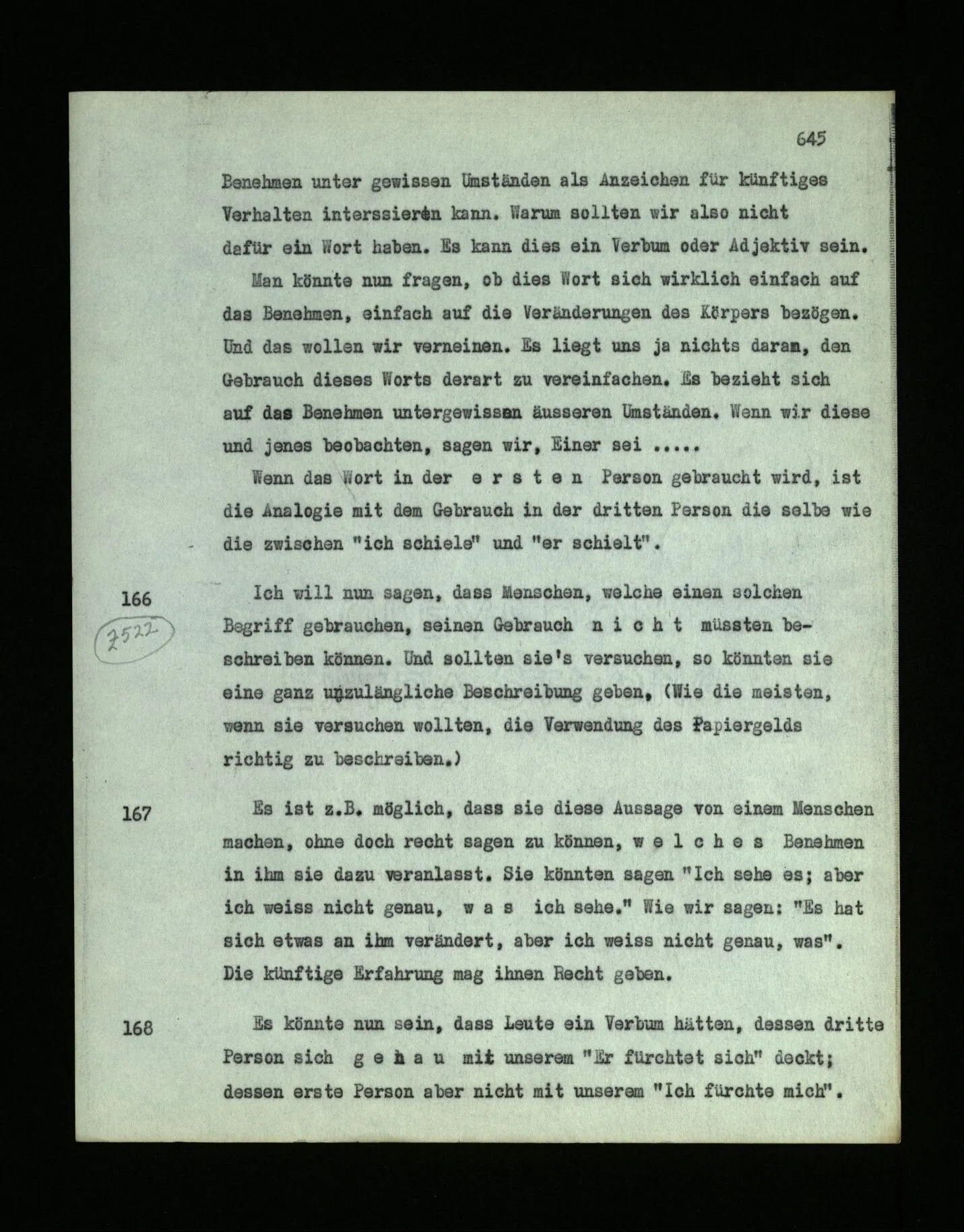 026 “Kann ein Mensch verstehen, was ‘lesen’ ist, es sei denn, er könne selber lesen; kann er verstehen, was ‘fürchten’ ist, ohne Furcht zu kennen; u.s.w.?” Nun, ein Analphabet kann doch gewiß sagen, er könne nicht lesen, aber sein Sohn habe es gelernt. Ein Blinder kann sagen, er sei blind und die Leute um ihn seien sehend. “Ja, aber meint er nicht doch etwas anderes mit den Worten ‘blind’ und ‘sehend’, als der Sehende?” Worauf beruht es, daß man das sagen will? Nun, wenn Einer nicht wüßte wie ein Leopard ausschaut, so könnte er doch sagen und verstehen “Dieser Ort ist sehr gefährlich, es gibt Leoparden dort”. Man würde aber doch vielleicht sagen, er weiß nicht, was ein Leopard ist, also nicht, oder nur unvollständig, was das Wort “Leopard” bedeutet, bis man ihm einmal ein solches Tier zeigt. Nun kommt es uns mit dem Blinden ähnlich vor. Sie wissen, so zu sagen, nicht, wie sehend ist. – Ist nun ‘Furcht nicht kennen’ analog dem ‘nie einen Leoparden gesehen haben’? Das will ich natürlich verneinen.