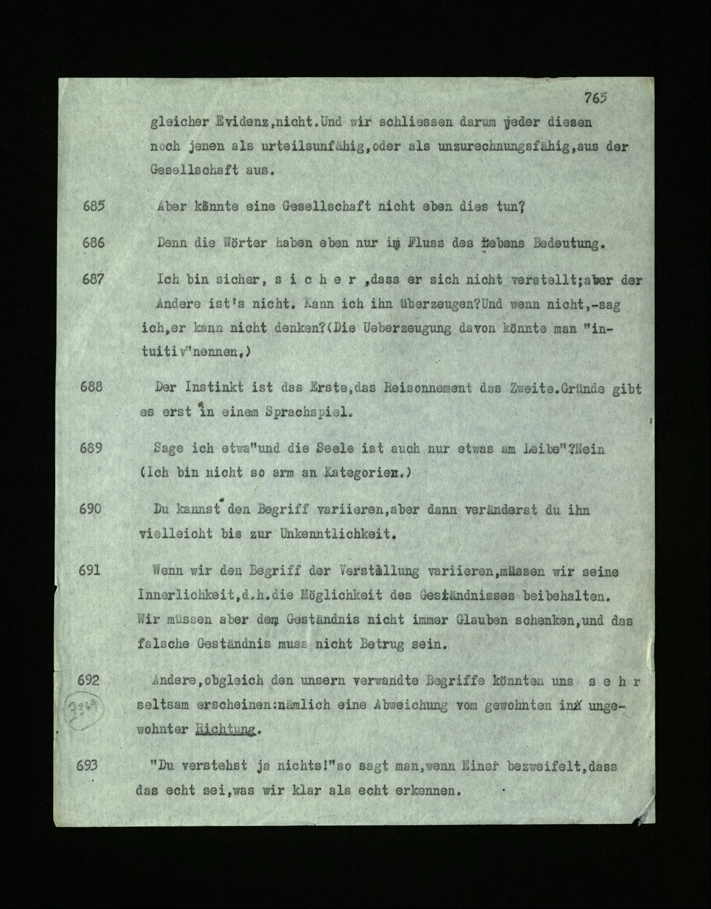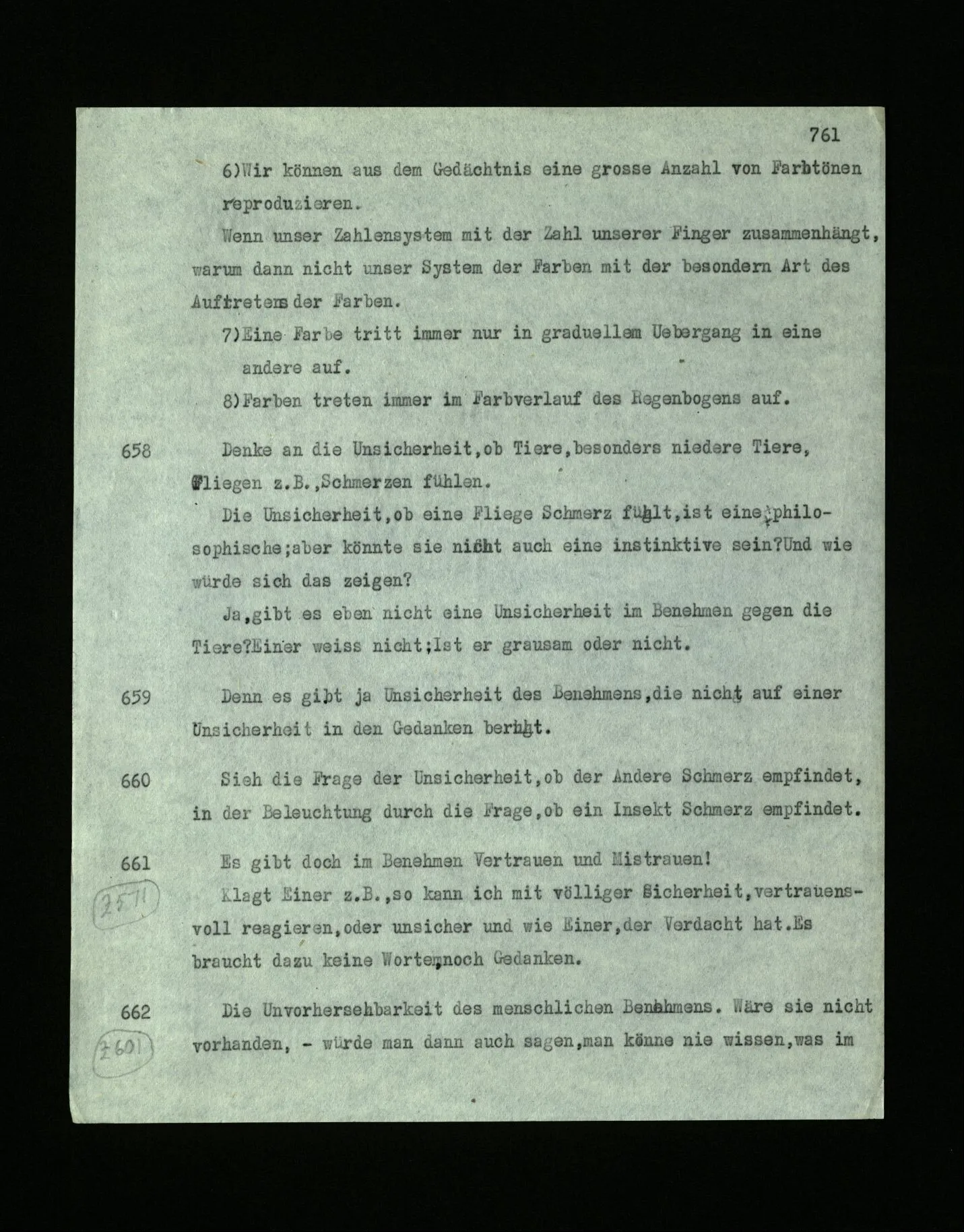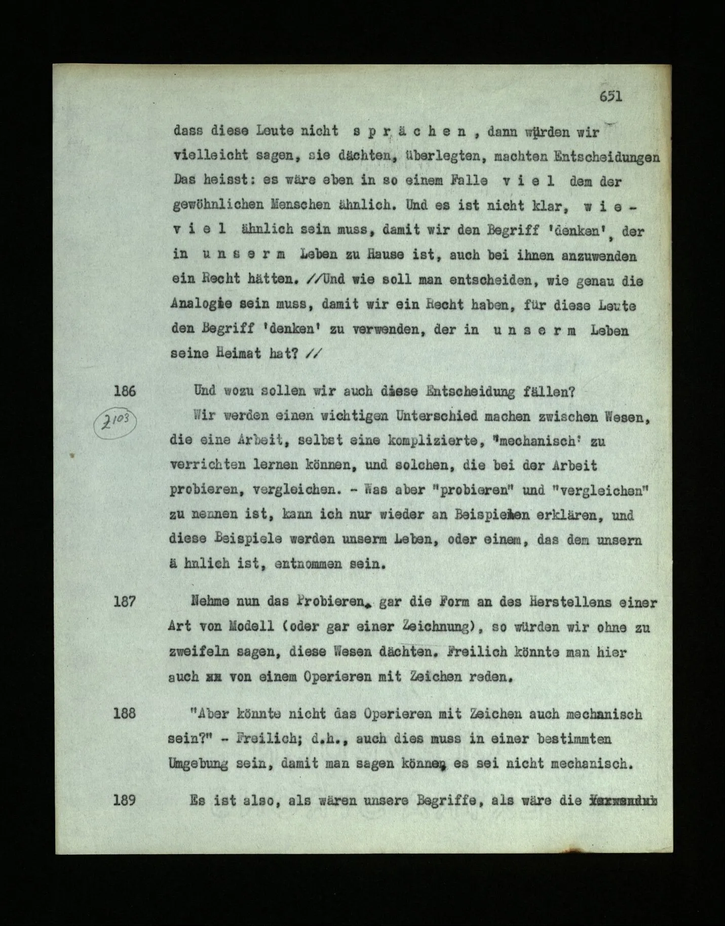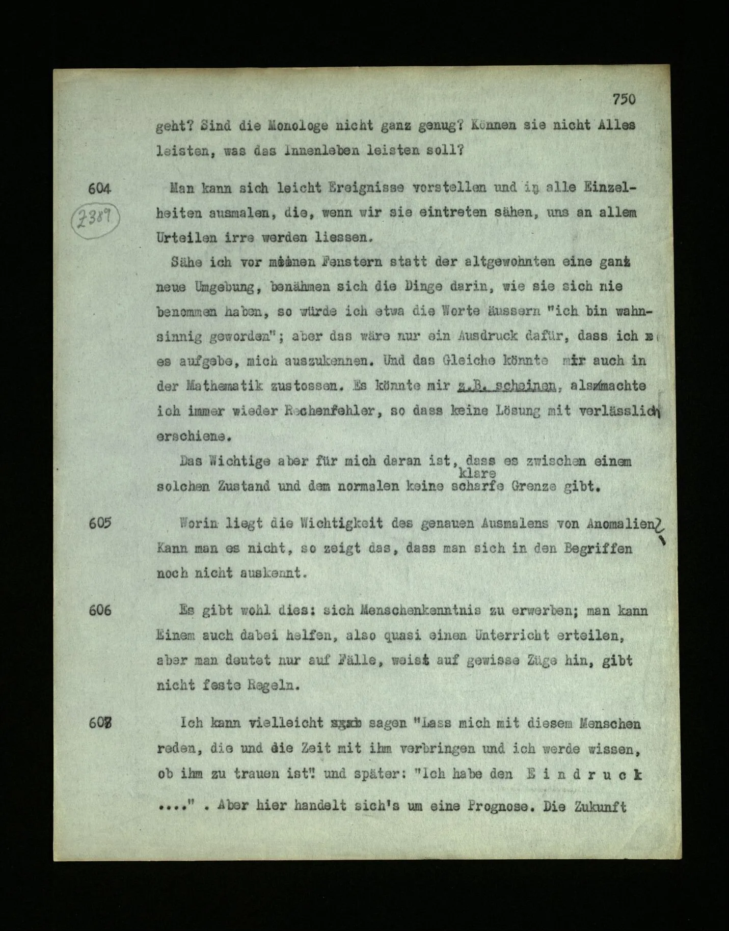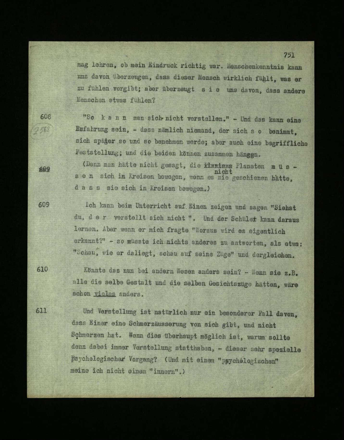 699 ‘Diese Menschen hätten nichts menschenähnliches.’ Warum? – Wir könnten uns unmöglich mit ihnen verständigen. Nicht einmal so, wie wir’s mit einem Hund können. Wir könnten uns nicht in sie Finden. Und doch könnte es ja solche, im übrigen Menschliche, Wesen geben.