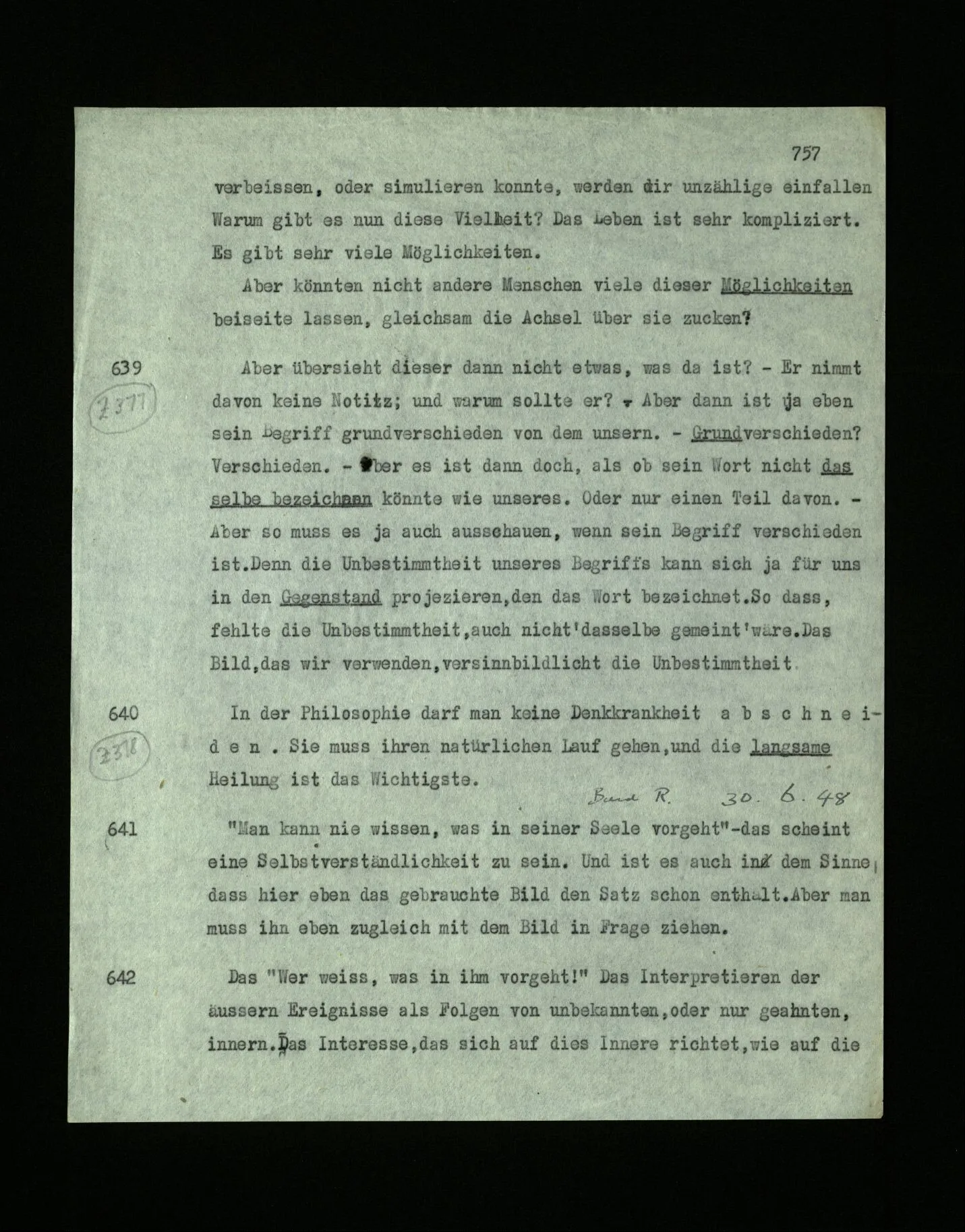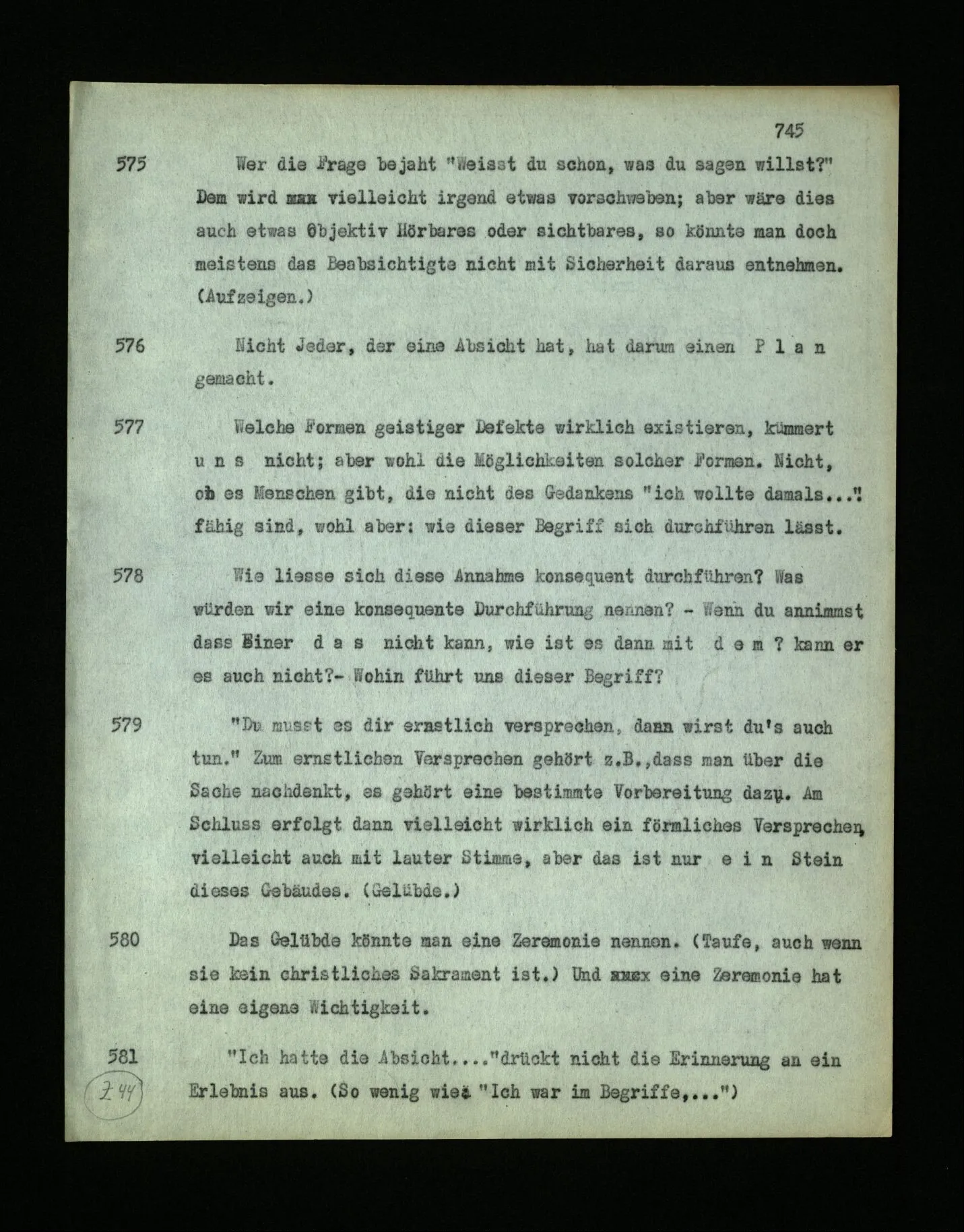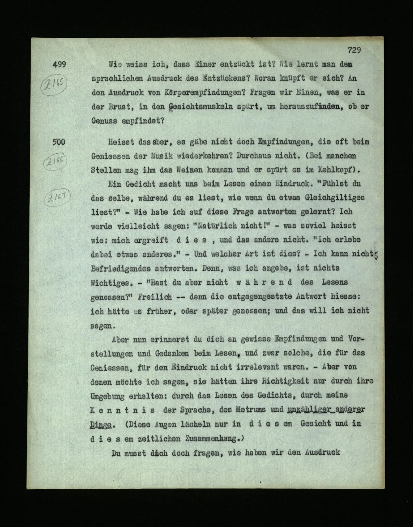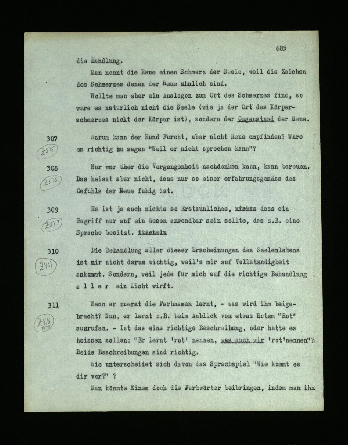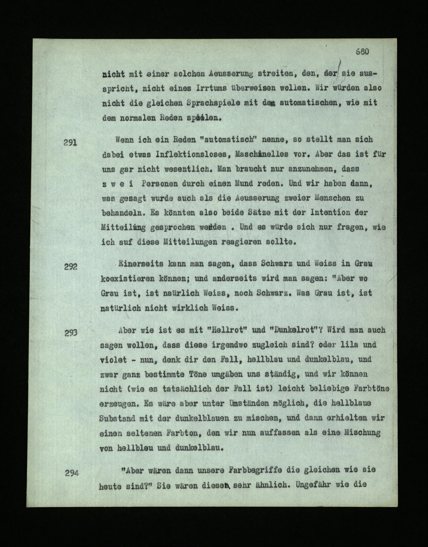 699 ‘Diese Menschen hätten nichts menschenähnliches.’ Warum? – Wir könnten uns unmöglich mit ihnen verständigen. Nicht einmal so, wie wir’s mit einem Hund können. Wir könnten uns nicht in sie Finden. Und doch könnte es ja solche, im übrigen Menschliche, Wesen geben.