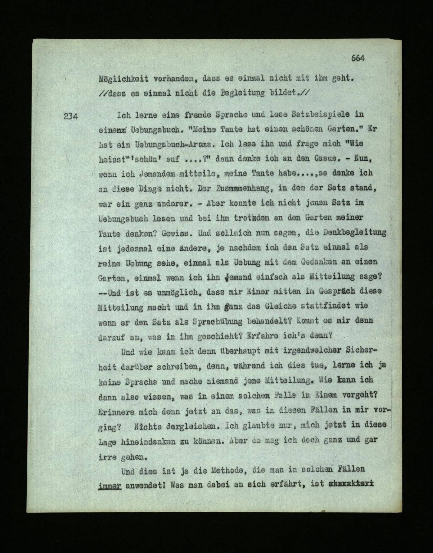 06 Er sagt “Ich will jetzt ausgehen”, plötzlich sagt er “Nein” und tut etwas anderes. Als er “Nein” sagte, fiel ihm plötzlich ein, er wolle zuerst … – er sagte “Nein”; aber dachte er auch “Nein”? Dachte er eben nicht an jene andere Angelegenheit? Man kann sagen, er dachte an sie. Er mußte dazu aber weder laut noch im Stillen einen Gedanken aussprechen. – Er könnte freilich später die Absicht in einen Satz kleiden. Zur Zeit des Wechsels mochte ihm ein Bild vorgeschwebt haben, oder aber er sagte nicht nur “Nein”, sondern irgend ein Wort, das Äquivalent eines Bildes. Wollte er etwa zuerst den Schrank zuschließen, so sagte er vielleicht “Der Schrank!”; wollte er erst die Hände waschen, so sah er sie etwa an und verzog das Gesicht. “Aber ist das Denken?” – Ich weiß es nicht. Sagt man denn in so einem Falle nicht, Einer habe sich etwas ‘überlegt’, er habe sich anders ‘besonnen’? Aber muß er zu diesem Denken unbedingt eine Sprache beherrschen lernen? Könnte nicht ein ‘intelligentes’ Tier so handeln? Man hat es abgerichtet, einen Gegenstand von dort und dort zu holen und ihn dorthin zu bringen. Es geht nun, ohne den Gegenstand dem Ziele zu, kehrt plötzlich um (als hätte es gesagt “Ach, ich habe …vergessen!”) und holt den Gegenstand, etc. Sähen wir so etwas, so würden wir sagen: es sei in ihm, in seinem Geiste, damals etwas vorgefallen. Und was ist denn in mir vorgefallen, wenn ich so handle? “Nicht gar viel” möchte ich sagen. Und was innen vorgeht, ist nicht wichtiger, als was äußerlich, durch Sprechen, Zeichnen, etc. vorgehen kann. ((Woraus du lernen kannst, wie das Wort “denken” gebraucht wird.))