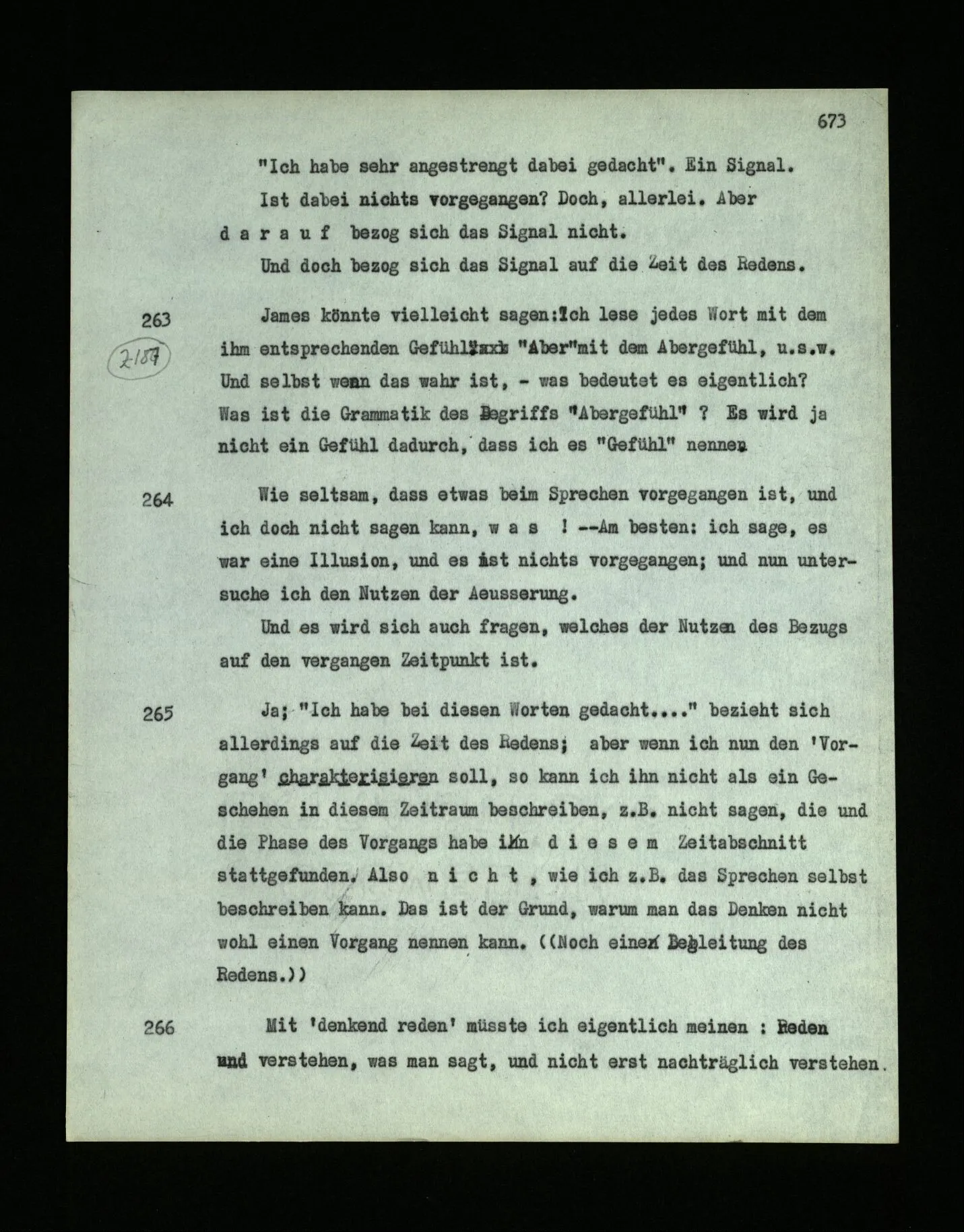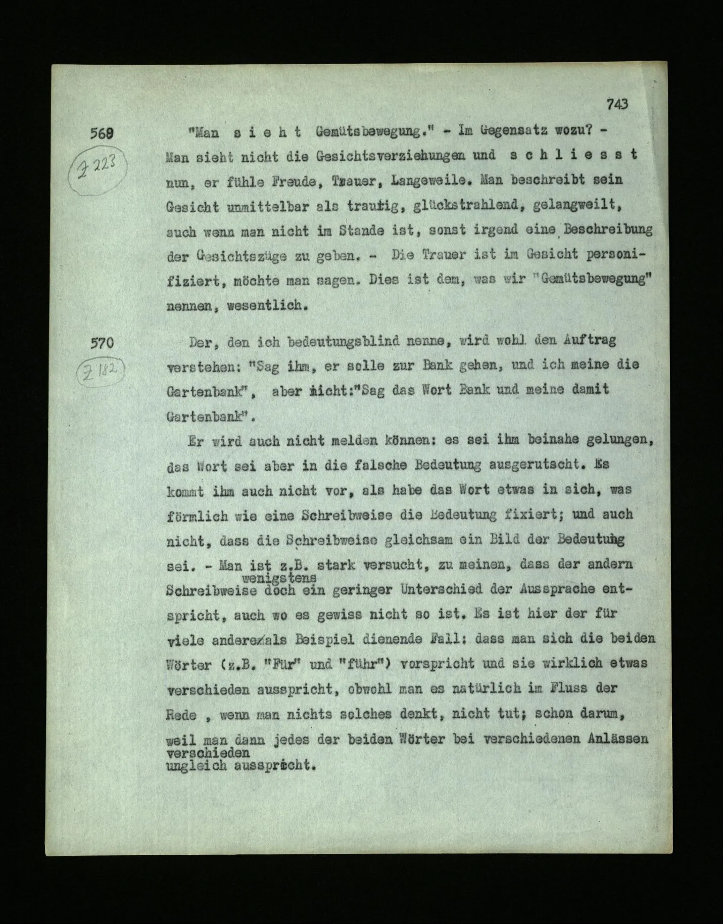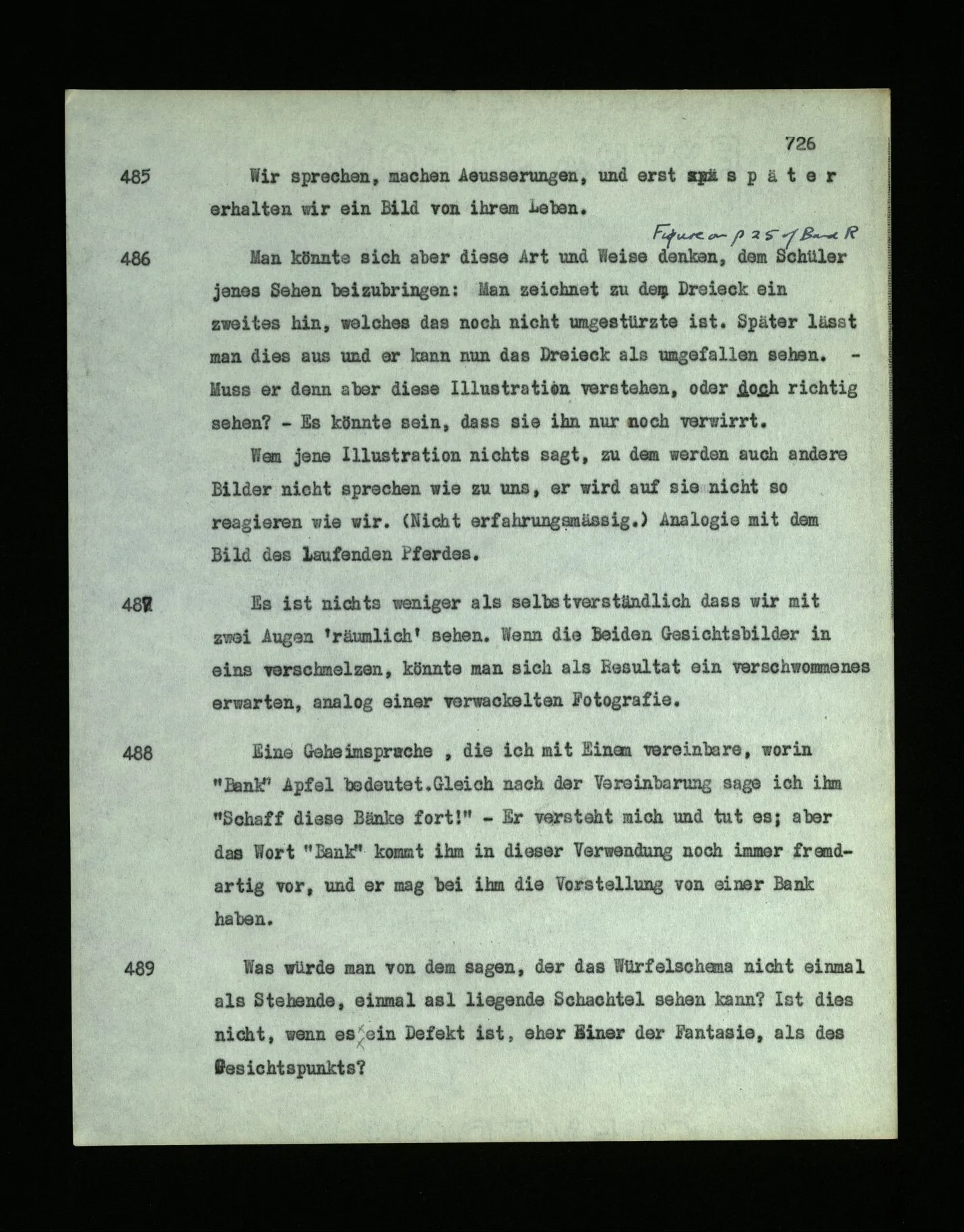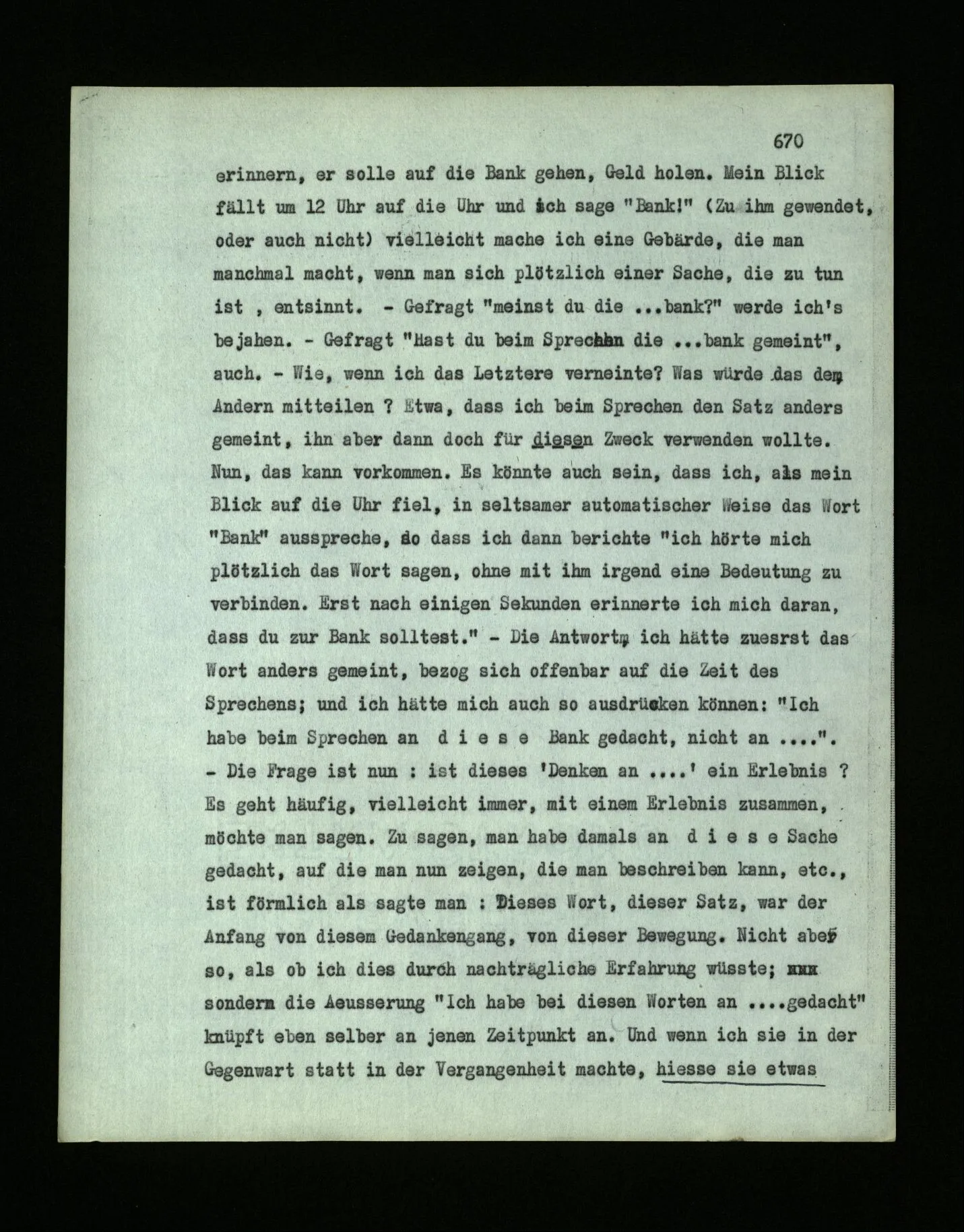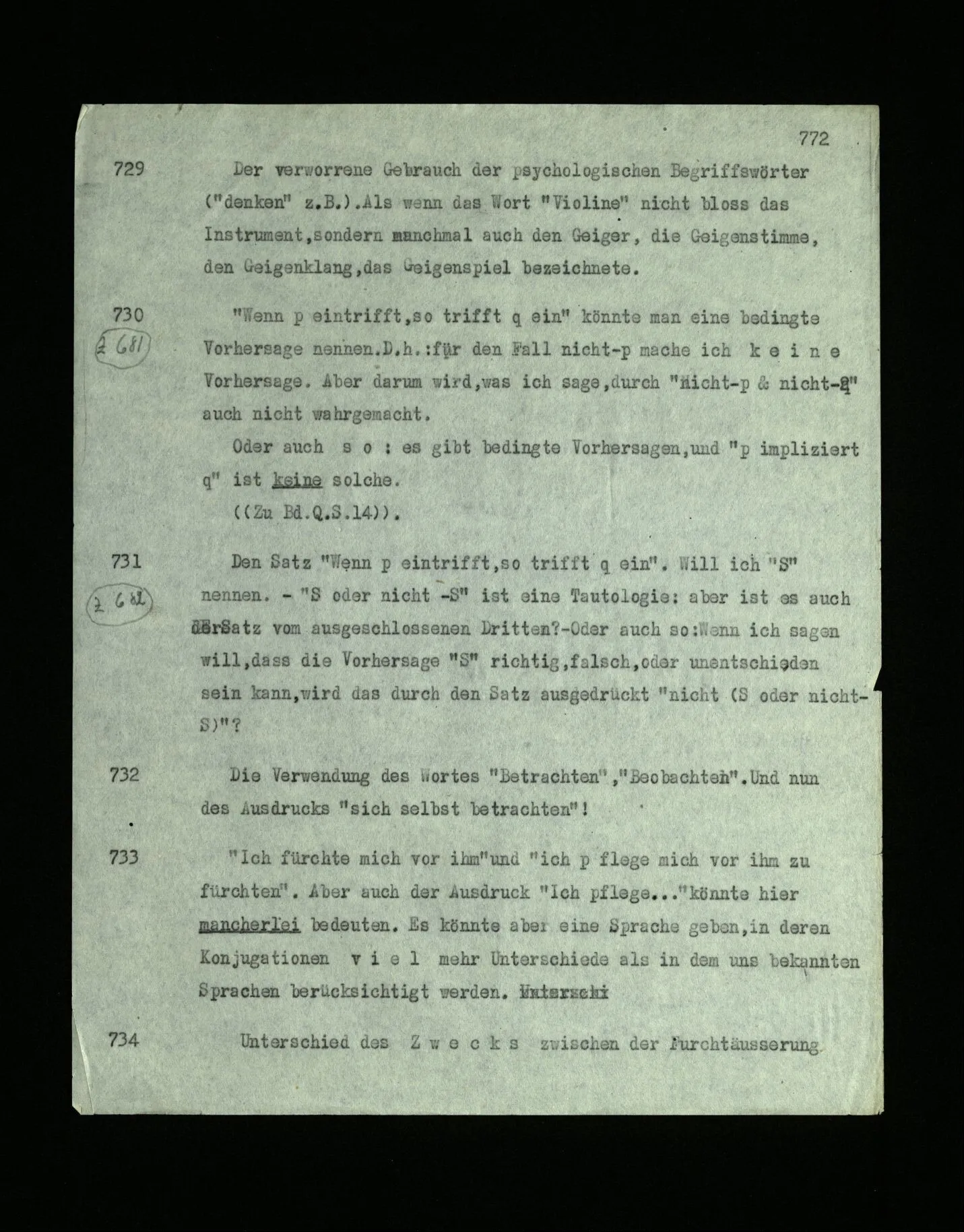 729 Der verworrene Gebrauch der psychologischen Begriffswörter (“denken” z.B.). Als wenn das Wort “Violine” nicht bloß das Instrument, sondern manchmal auch den Geiger, die Geigenstimme, den Geigenklang, das Geigenspiel bezeichnete.