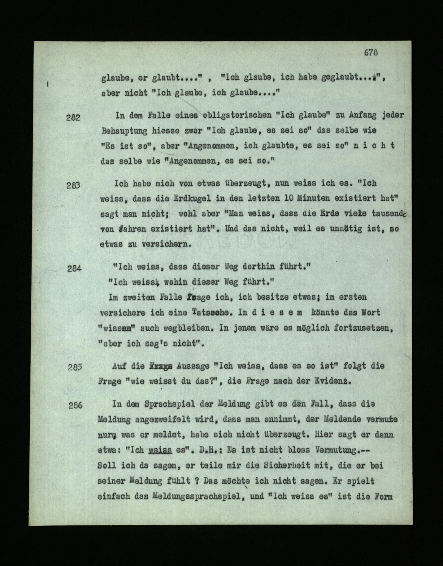 700 “Wissen kann man es doch nicht. Man kann es glauben. Mit ganzer Seele glauben, aber nicht wissen.” Dann liegt der Unterschied nicht in der Sicherheit des Überzeugten. Er muß wo anders liegen; in der Logik der Frage.