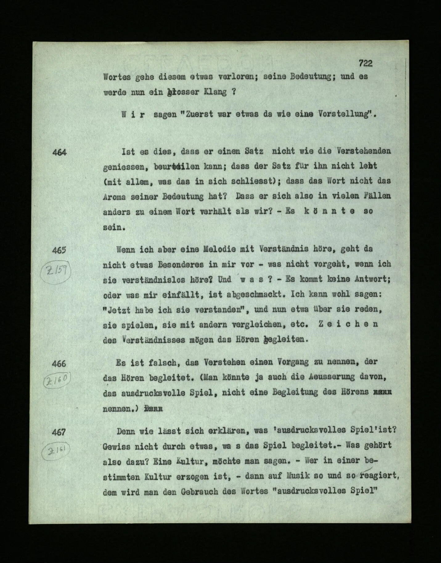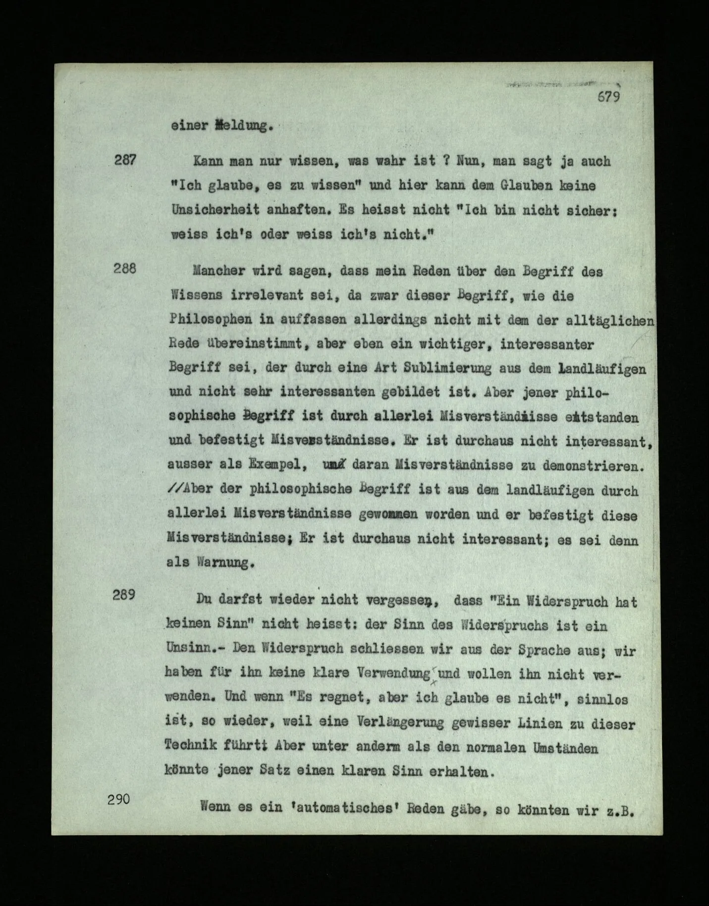 719 Daß der und der Satz keinen Sinn hat, ist in der Philosophie von Bedeutung, aber auch, daß er komisch klingt.