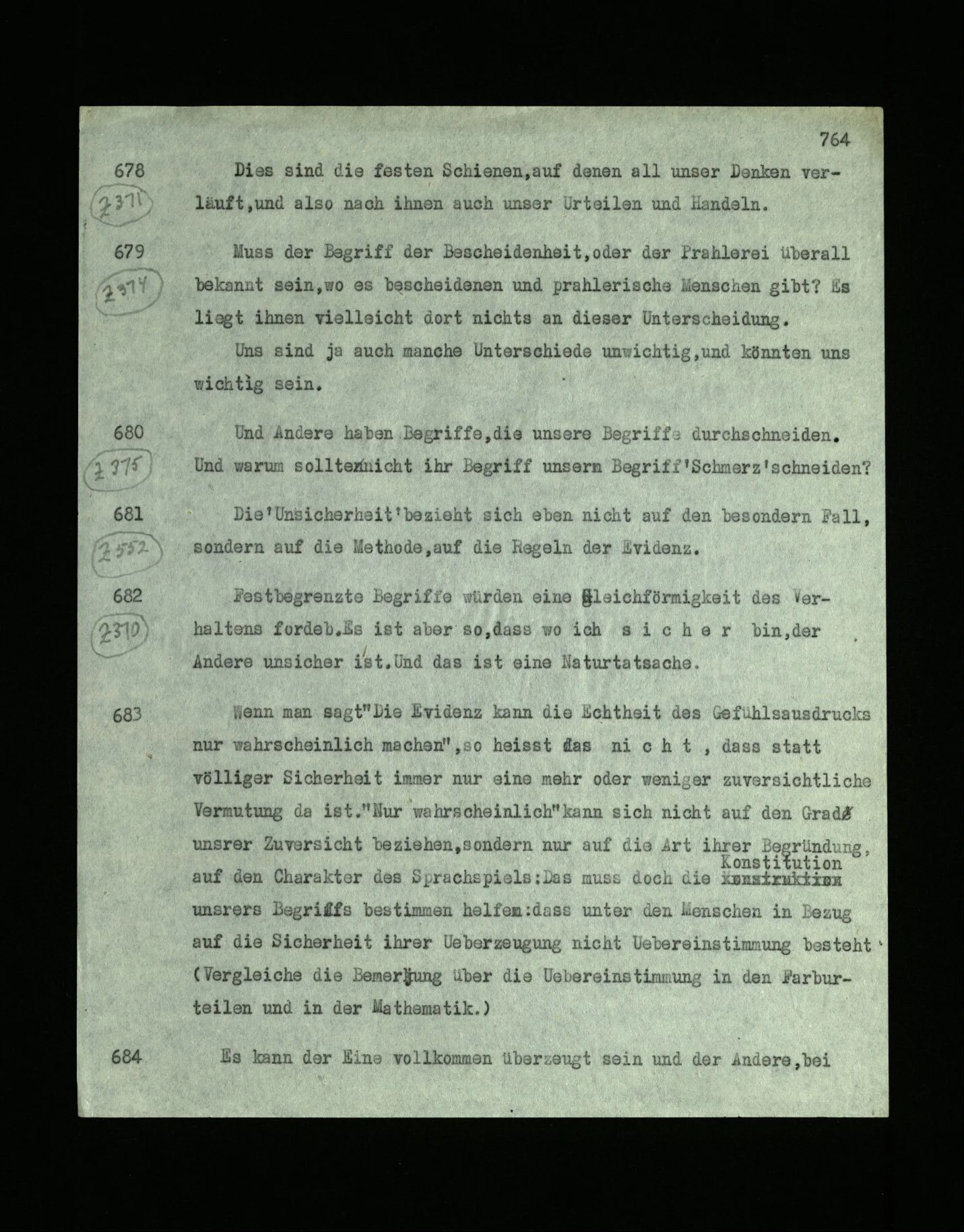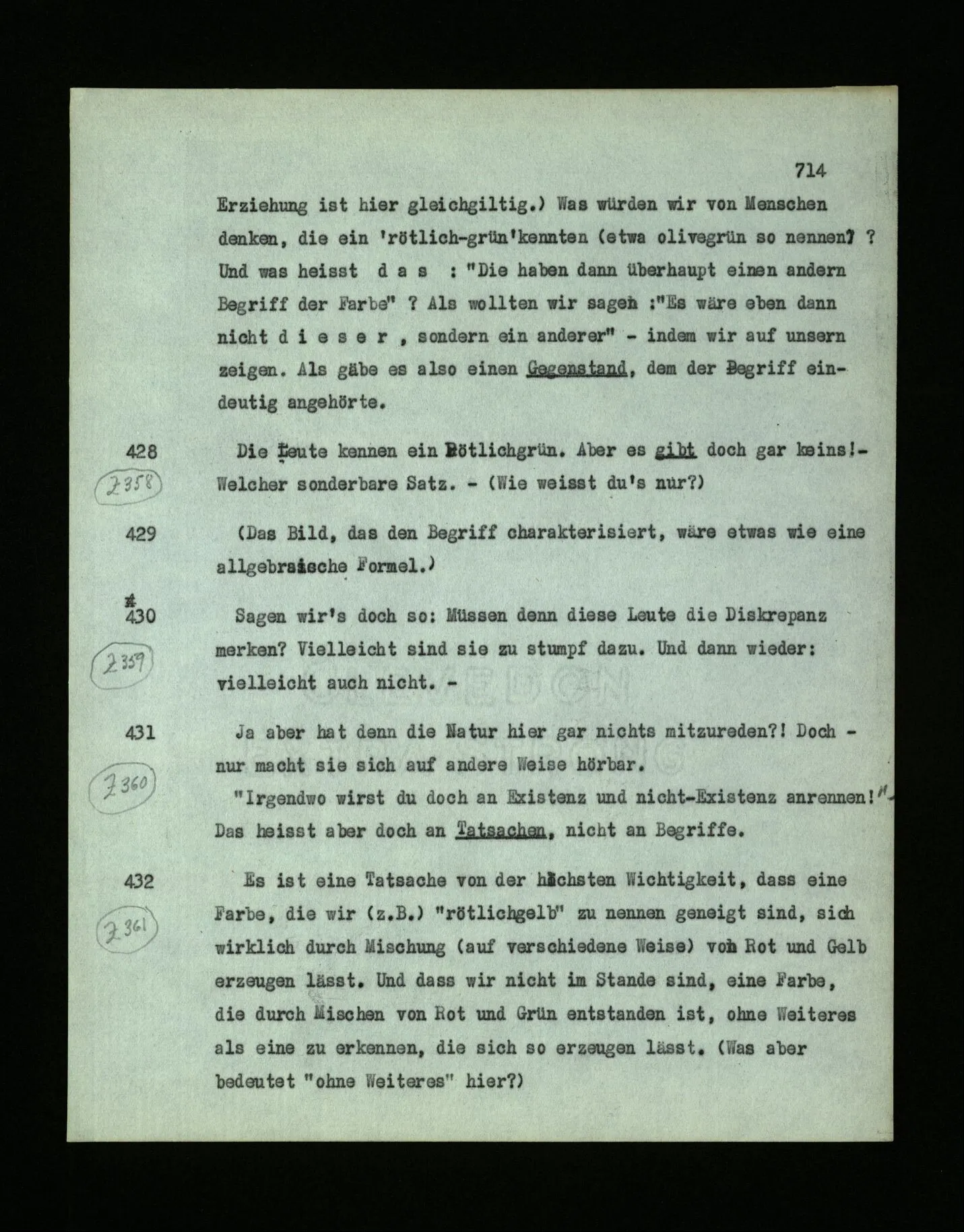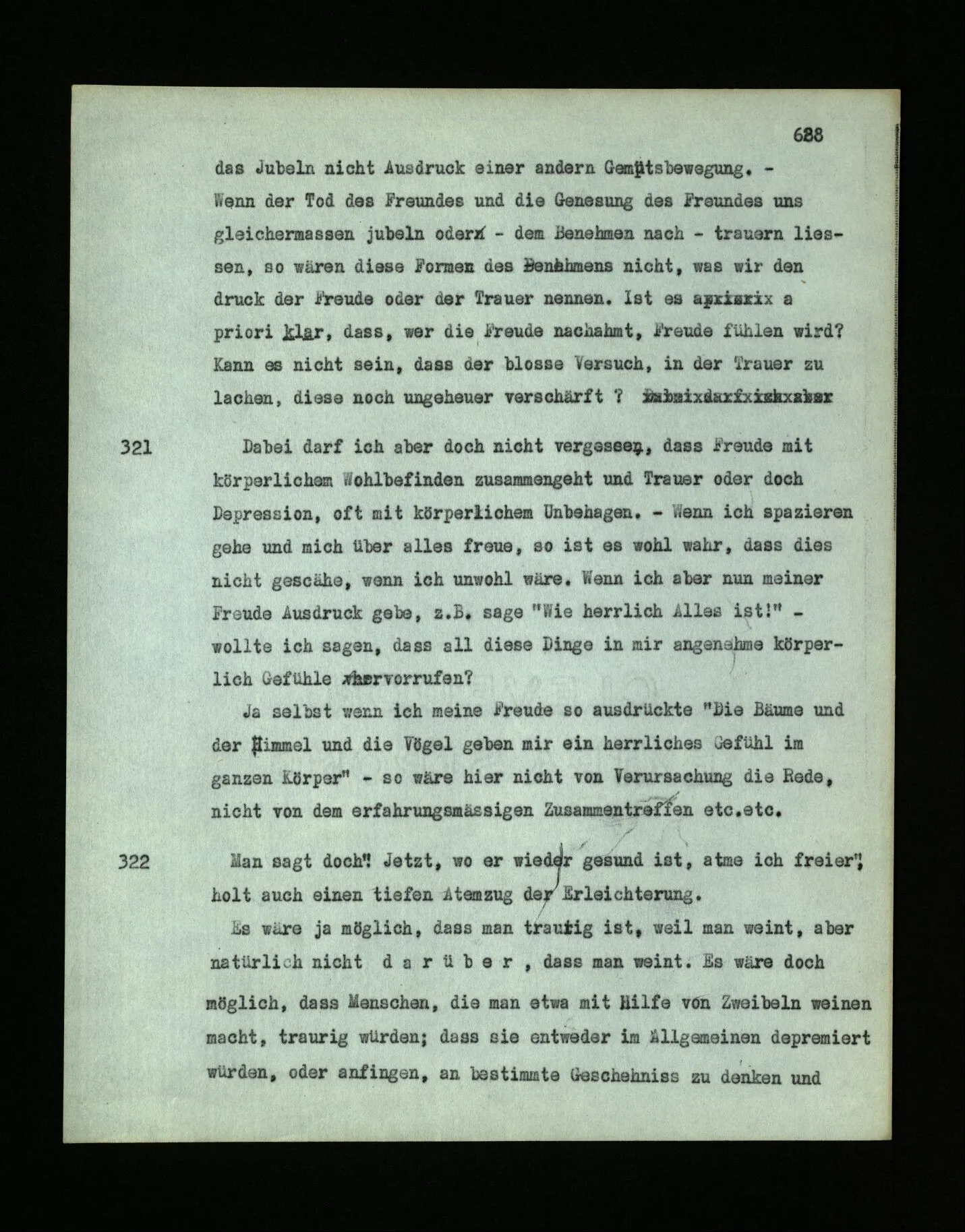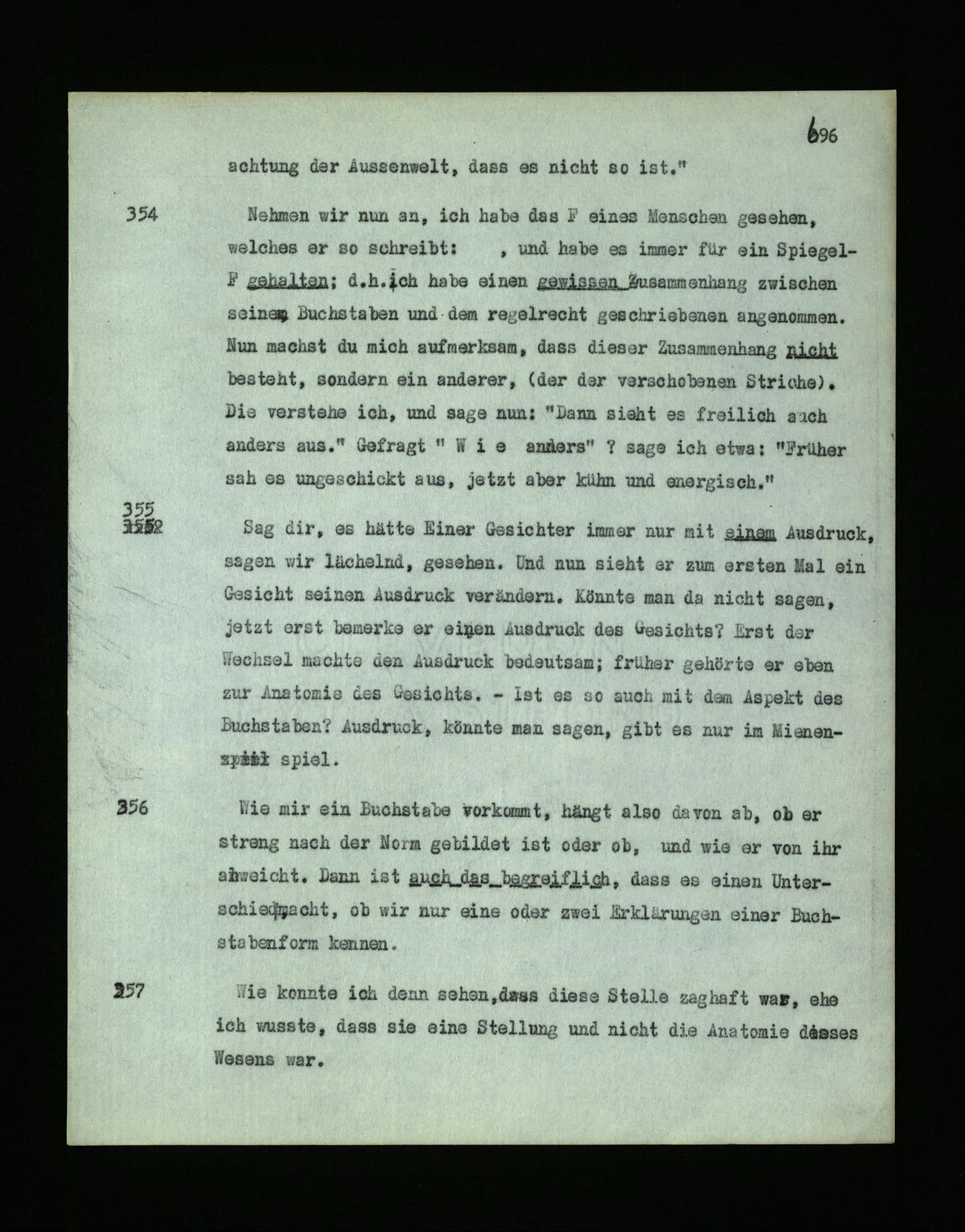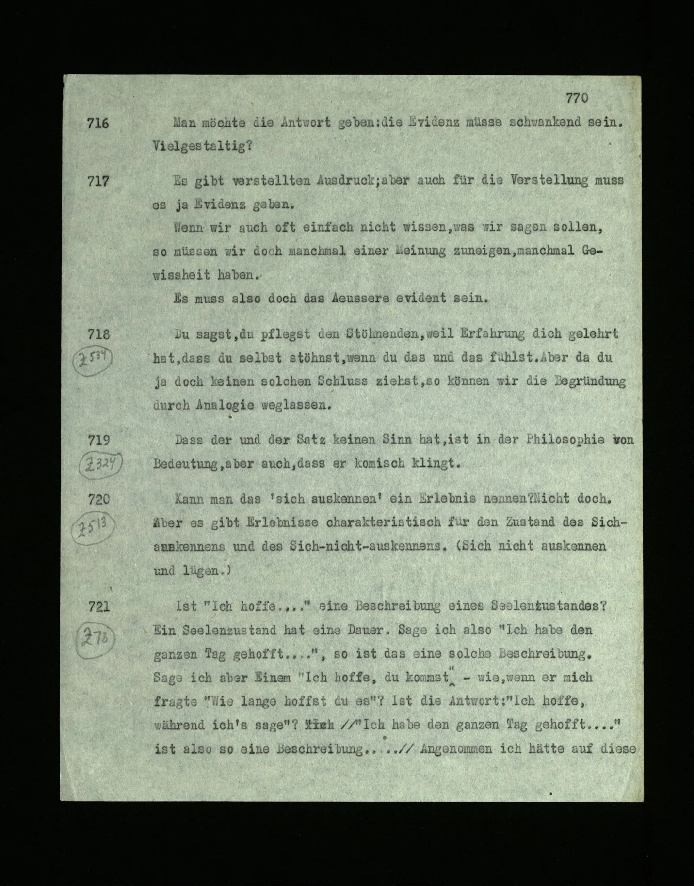 717 Es gibt verstellten Ausdruck; aber auch für die Verstellung muß es ja Evidenz geben. Wenn wir auch oft einfach nicht wissen, was wir sagen sollen, so müssen wir doch manchmal einer Meinung zuneigen, manchmal Gewißheit haben. Es muß also doch das Äußere evident sein.