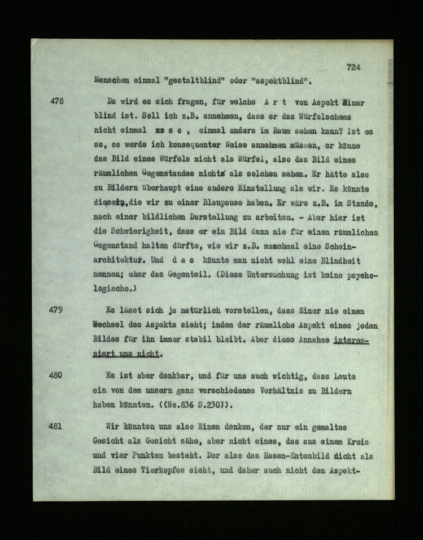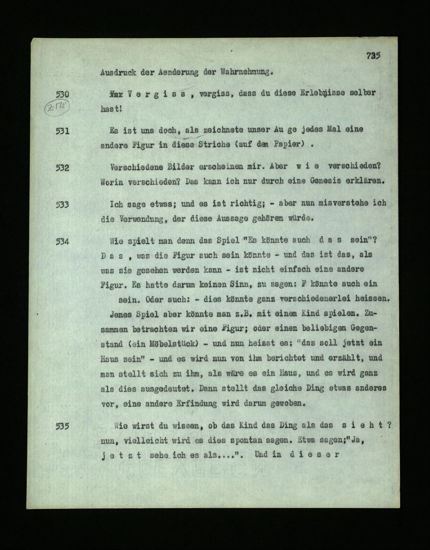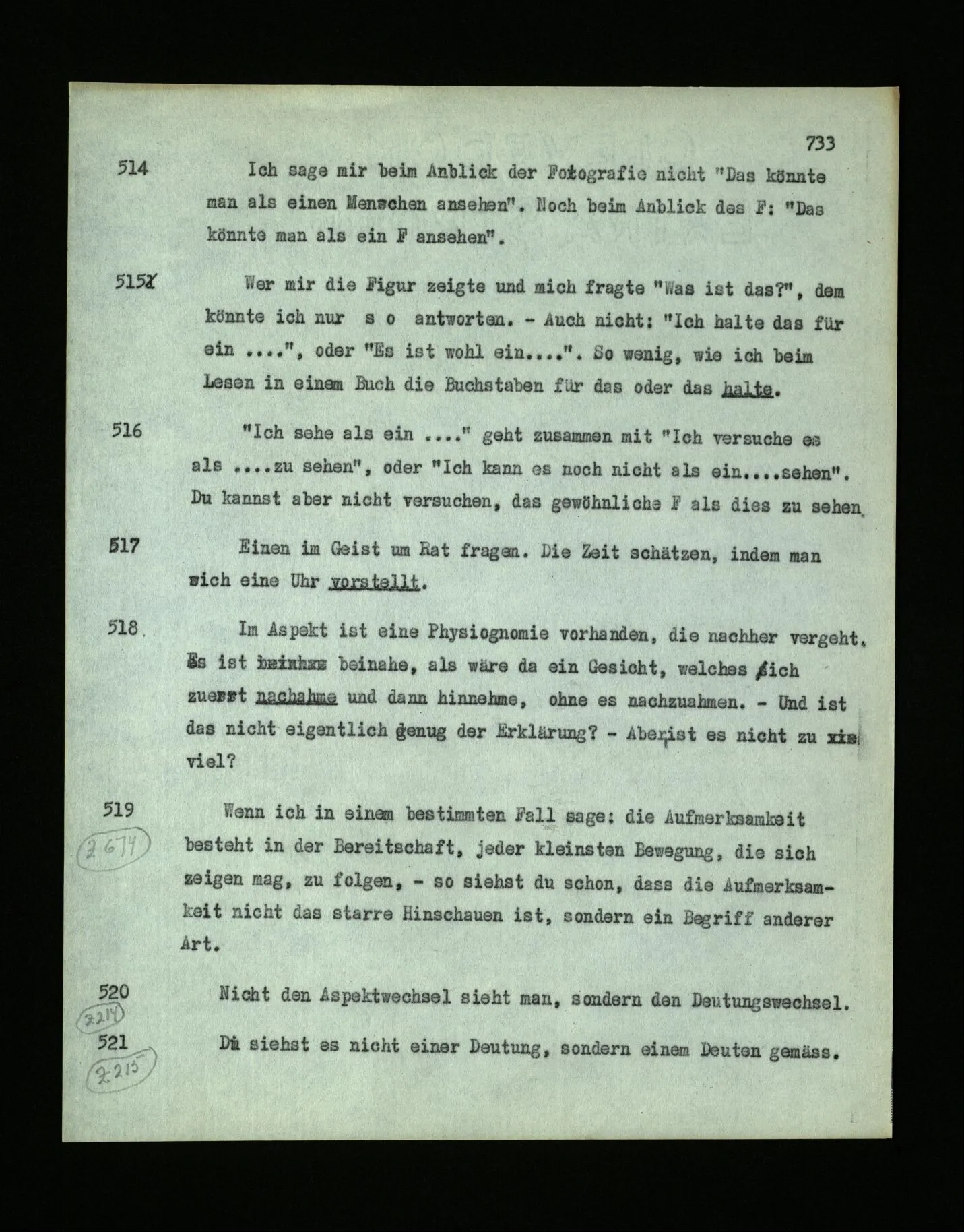 036 “Wie ist es aber möglich, daß man ein Ding einer Deutung gemäß sieht?” – Die Frage stellt diese als ein seltsames Faktum da; als wäre hier etwas in eine Form gezwängt worden, was eigentlich nicht hineinpaßt. Aber es ist hier kein Drücken und Zwängen geschehen.