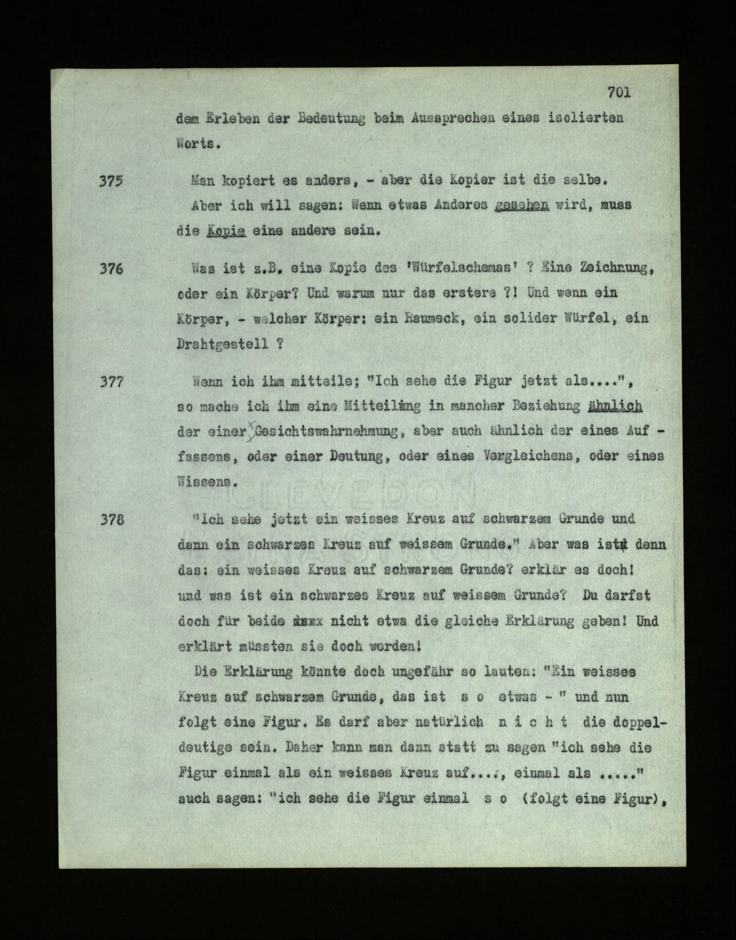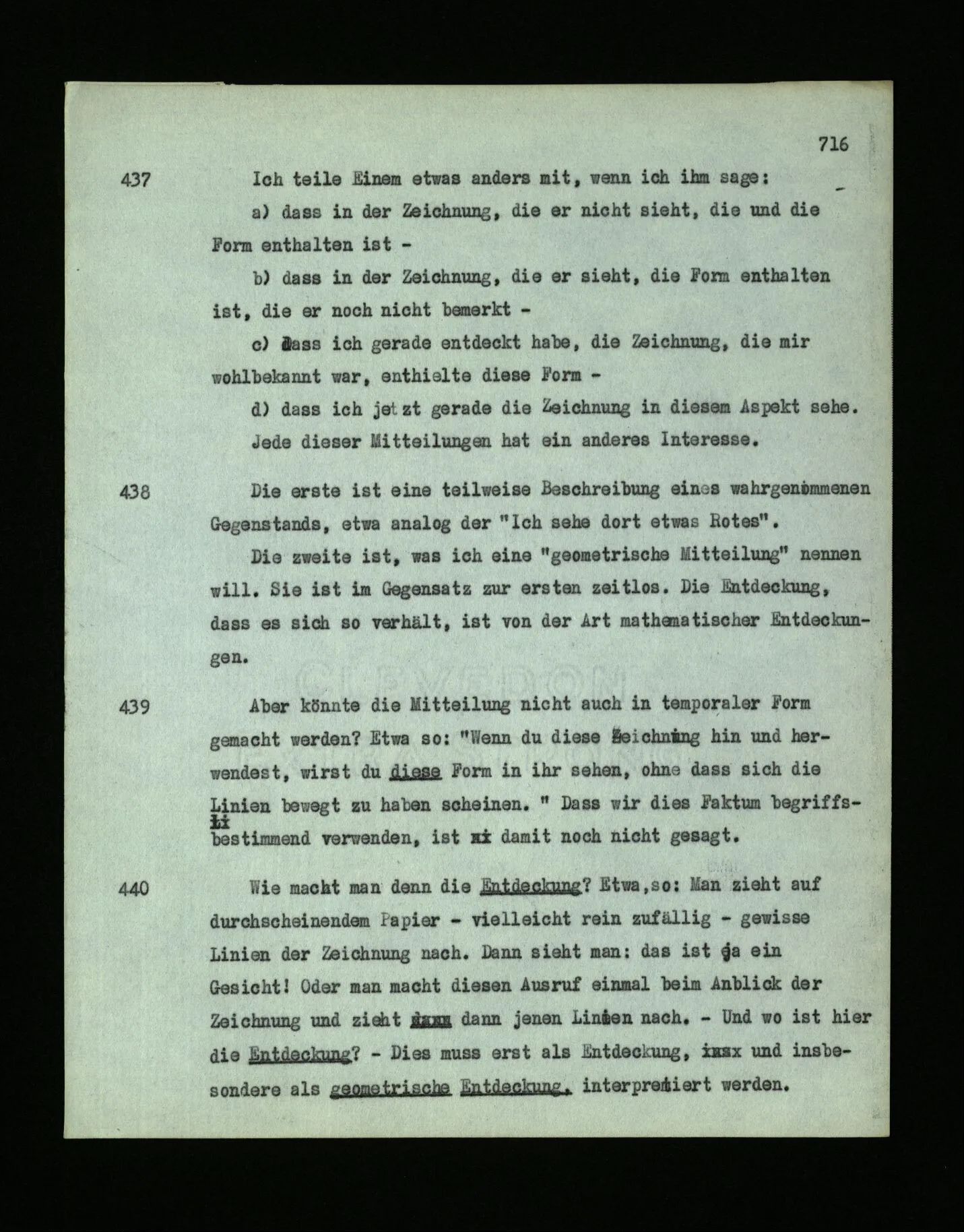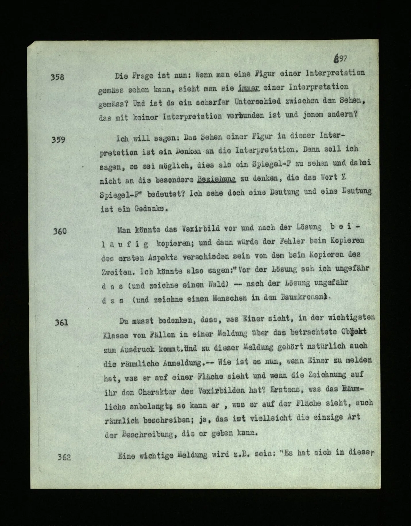 036 “Wie ist es aber möglich, daß man ein Ding einer Deutung gemäß sieht?” – Die Frage stellt diese als ein seltsames Faktum da; als wäre hier etwas in eine Form gezwängt worden, was eigentlich nicht hineinpaßt. Aber es ist hier kein Drücken und Zwängen geschehen.