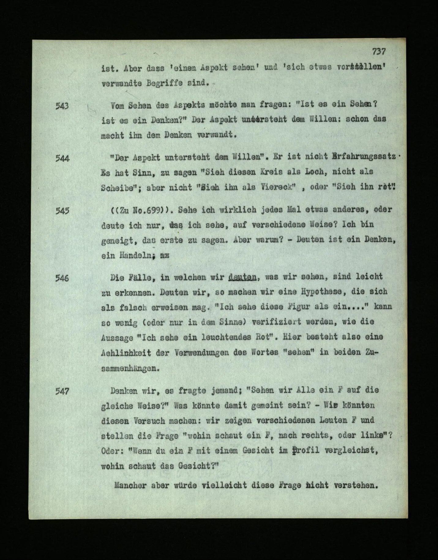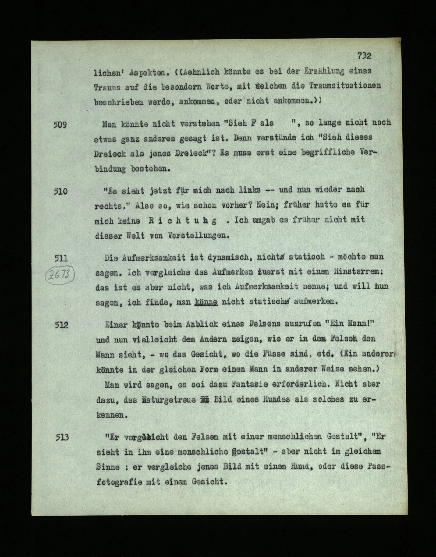 039 Wer den Aspektwechsel nicht empfände, wäre nicht geneigt zu sagen: “Jetzt sieht es ganz anders aus!” oder “Es ist als hätte sich das Bild verändert, und hat sich doch nicht verändert!” oder “Die Form ist gleich geblieben und doch hat sich etwas verändert; etwas, was ich die Auffassung nennen möchte und was man sieht!” –