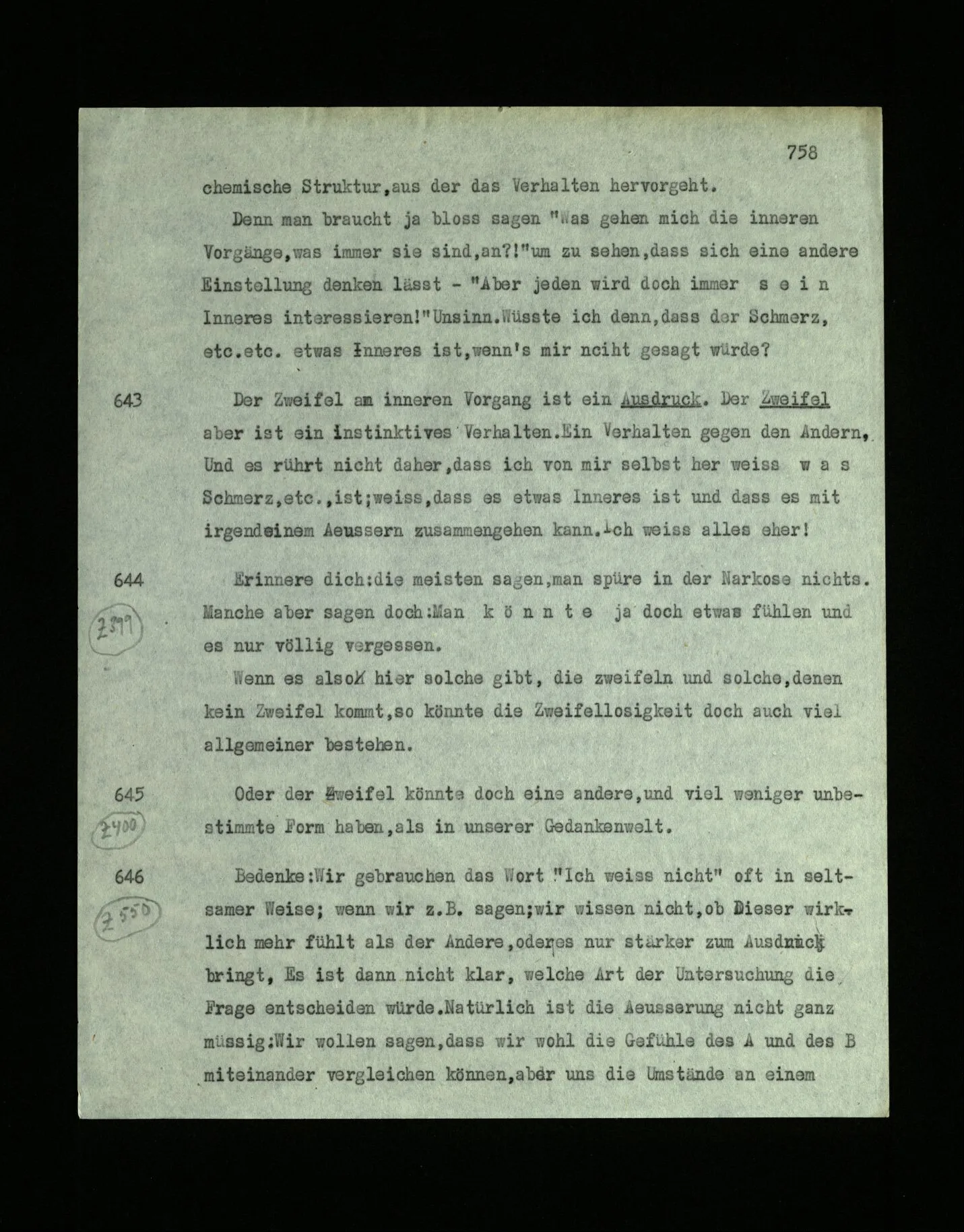 702 Es gibt wohl den Fall, daß Einer mir später sein Innerstes durch ein Geständnis aufschließt: aber, daß es so ist, kann mir nicht das Wesen von Außen und Innen erklären, denn ich muß ja dem Geständnis doch Glauben schenken. Das Geständnis ist ja auch etwas Äußeres.