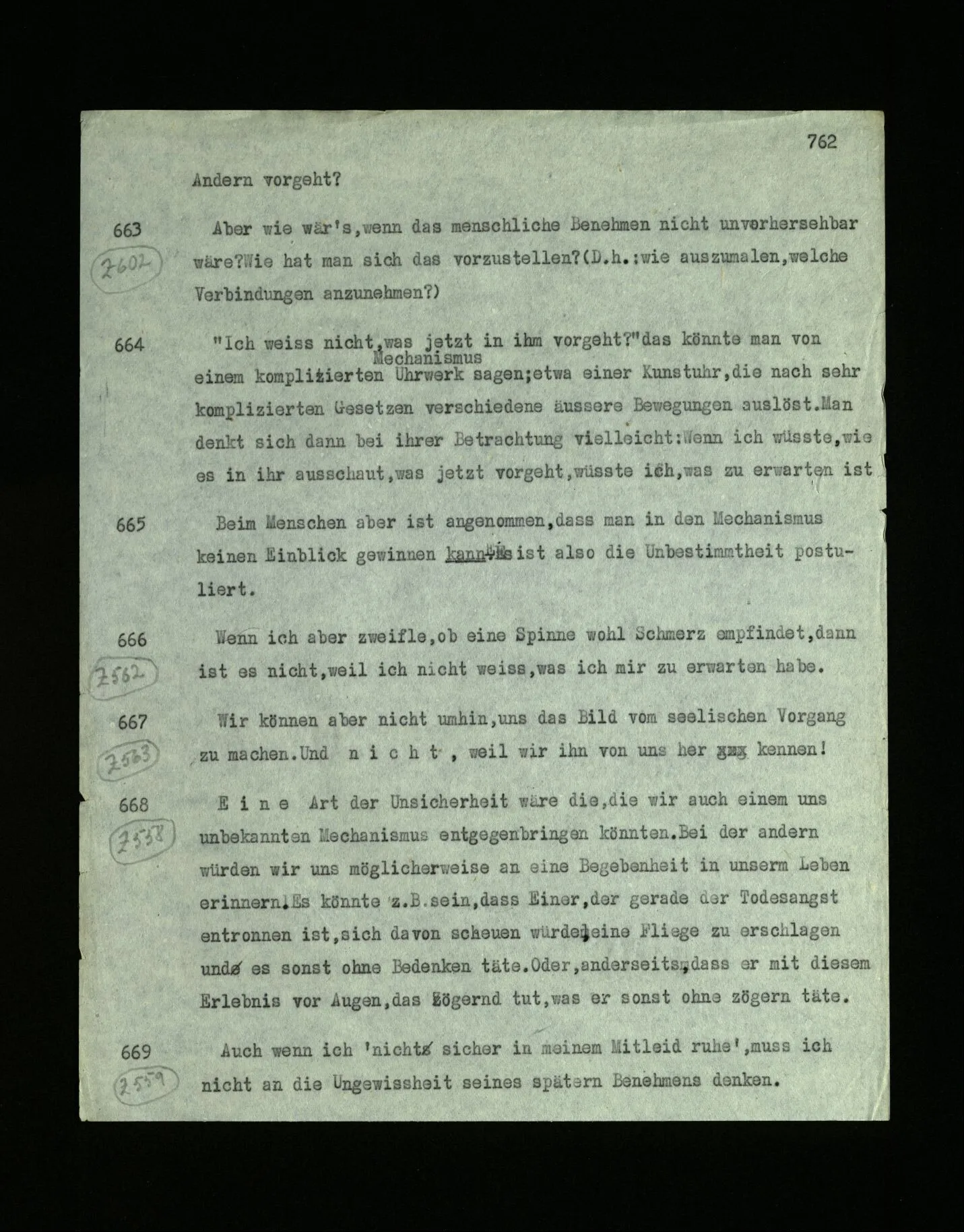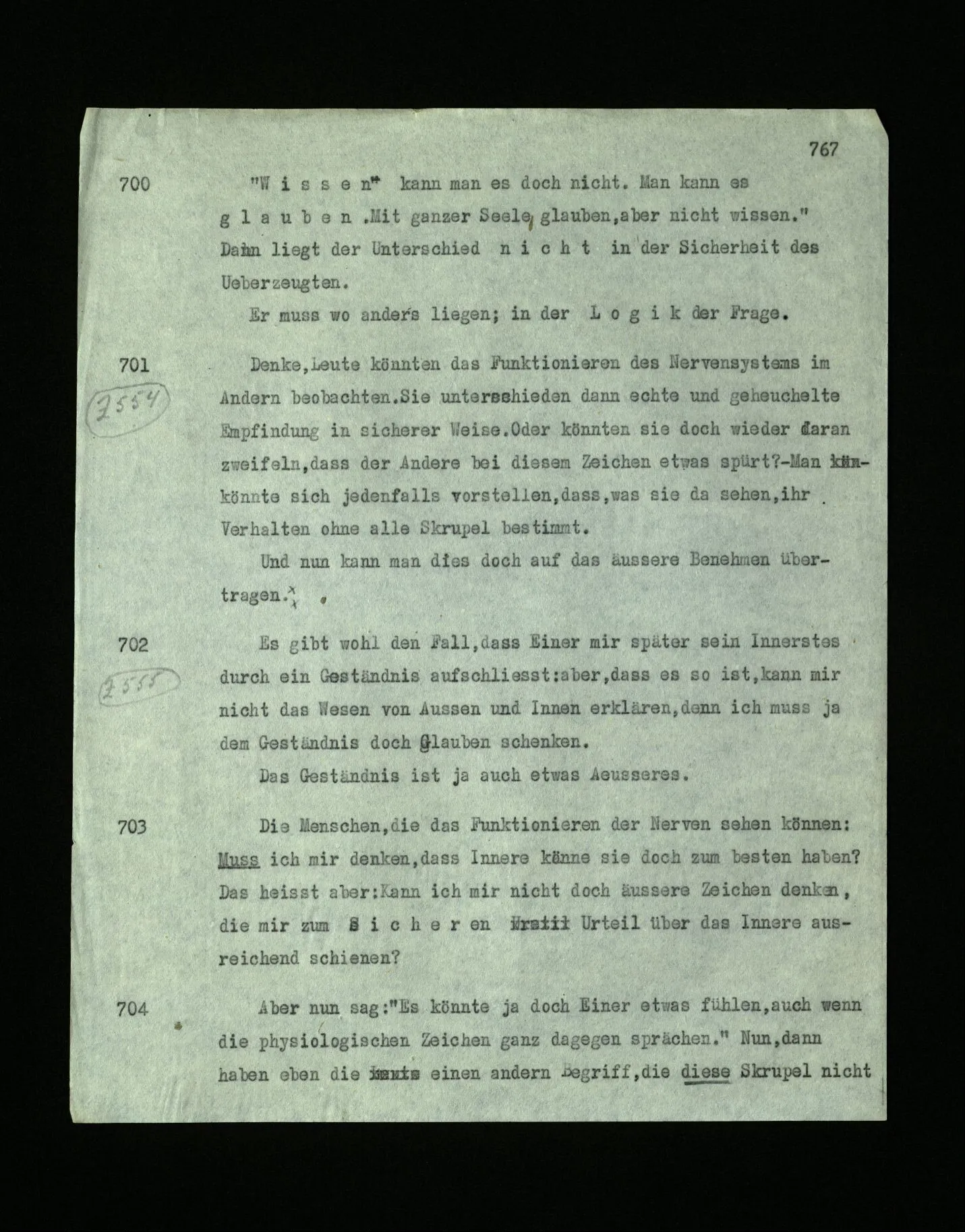 703 Die Menschen, die das Funktionieren der Nerven sehen können: Muß ich mir denken, daß Innere könne sie doch zum besten haben? Das heißt aber: Kann ich mir nicht doch äußere Zeichen denken, die mir zum sicheren Urteil über das Innere ausreichend schienen?