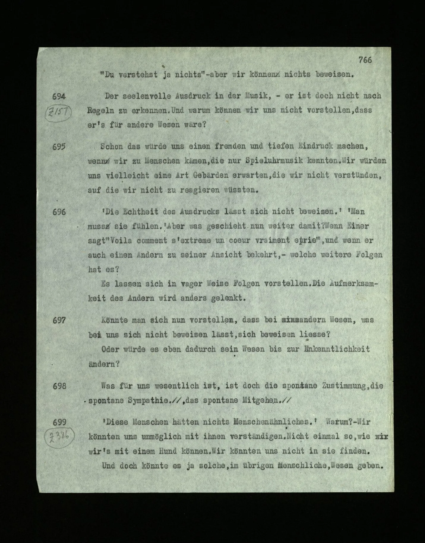 694 Der seelenvolle Ausdruck in der Musik, – er ist doch nicht nach Regeln zu erkennen. Und warum können wir uns nicht vorstellen, daß er’s für andere Wesen wäre?