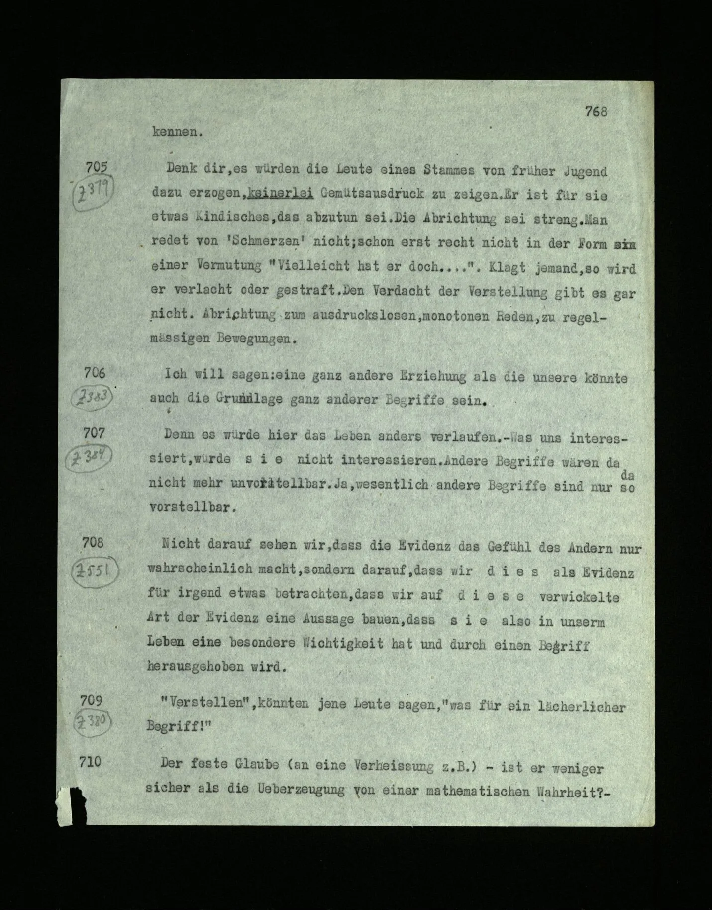 706 Ich will sagen: eine ganz andere Erziehung als die unsere könnte auch die Grundlage ganz anderer Begriffe sein.
