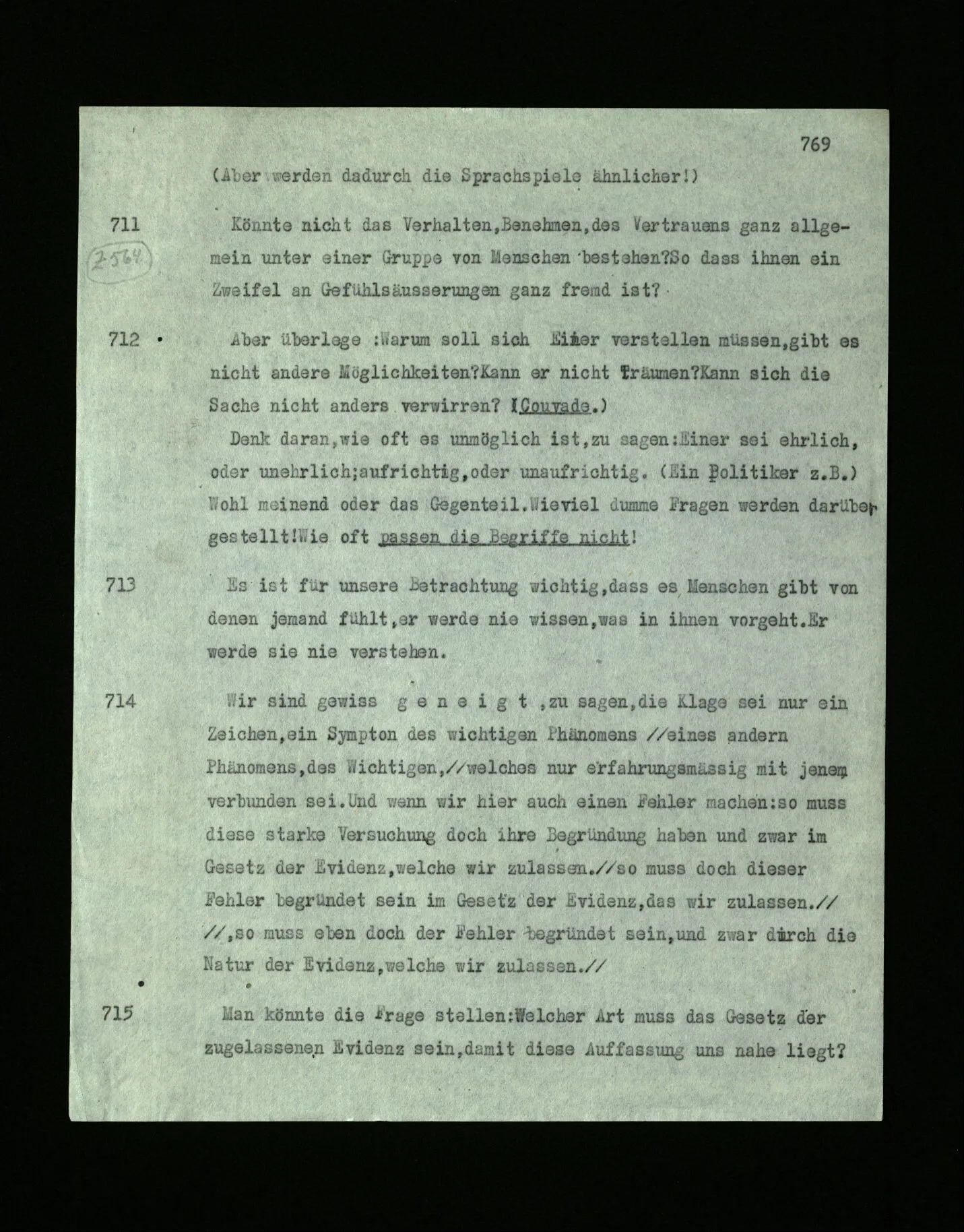 708 Nicht darauf sehen wir, daß die Evidenz das Gefühl des Andern nur wahrscheinlich macht, sondern darauf, daß wir dies als Evidenz für irgend etwas Betrachten, daß wir auf diese verwickelte Art der Evidenz eine Aussage bauen, daß sie also in unserm Leben eine besondere Wichtigkeit hat und durch einen Begriff herausgehoben wird.