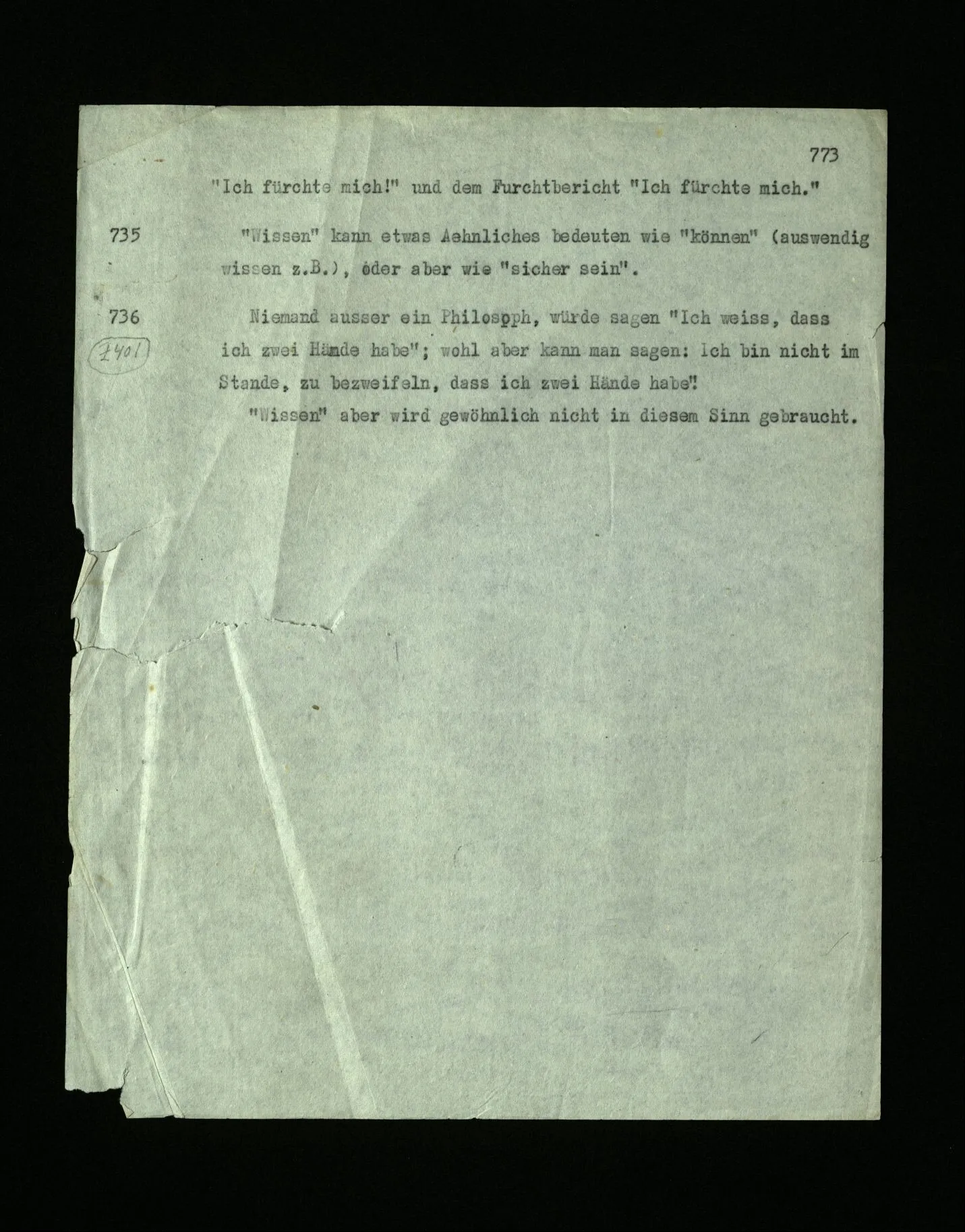 736 Niemand außer ein Philosoph, würde sagen “Ich weiß, daß ich zwei Hände habe”; wohl aber kann man sagen: Ich bin nicht im Stande zu bezweifeln, daß ich zwei Hände habe”. “Wissen” aber wird gewöhnlich nicht in diesem Sinn gebraucht.