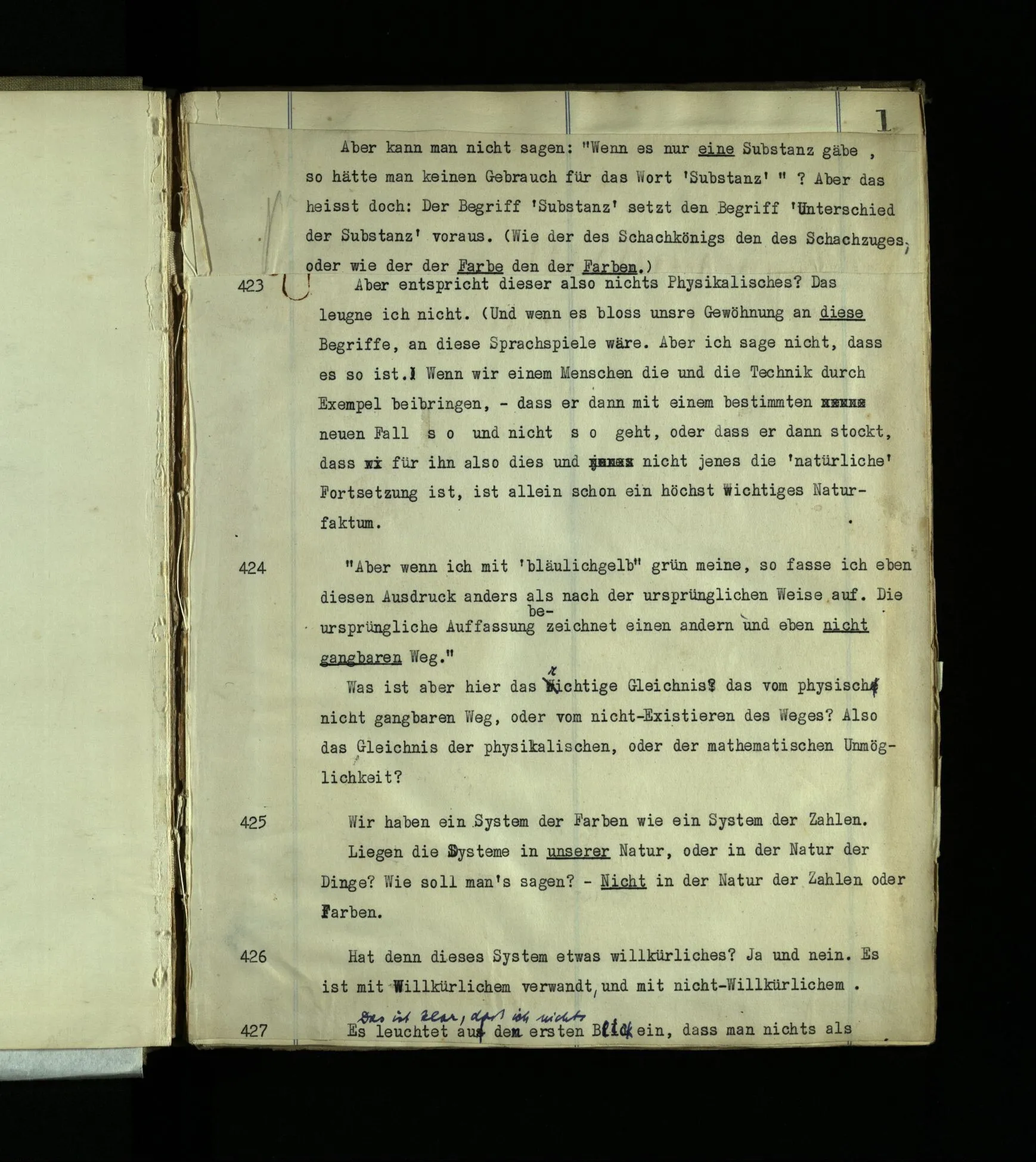 424 “Aber wenn ich mit ‘bläulichgelb’ grün meine, so fasse ich eben diesen Ausdruck anders als nach der ursprünglichen Weise auf. Die ursprüngliche Auffassung bezeichnet einen andern und eben nicht gangbaren Weg.” Was ist aber hier das richtige Gleichnis? das vom physisch nicht gangbaren Weg, oder vom nicht-Existieren des Weges? Also das Gleichnis der physikalischen, oder der mathematischen Unmöglichkeit?