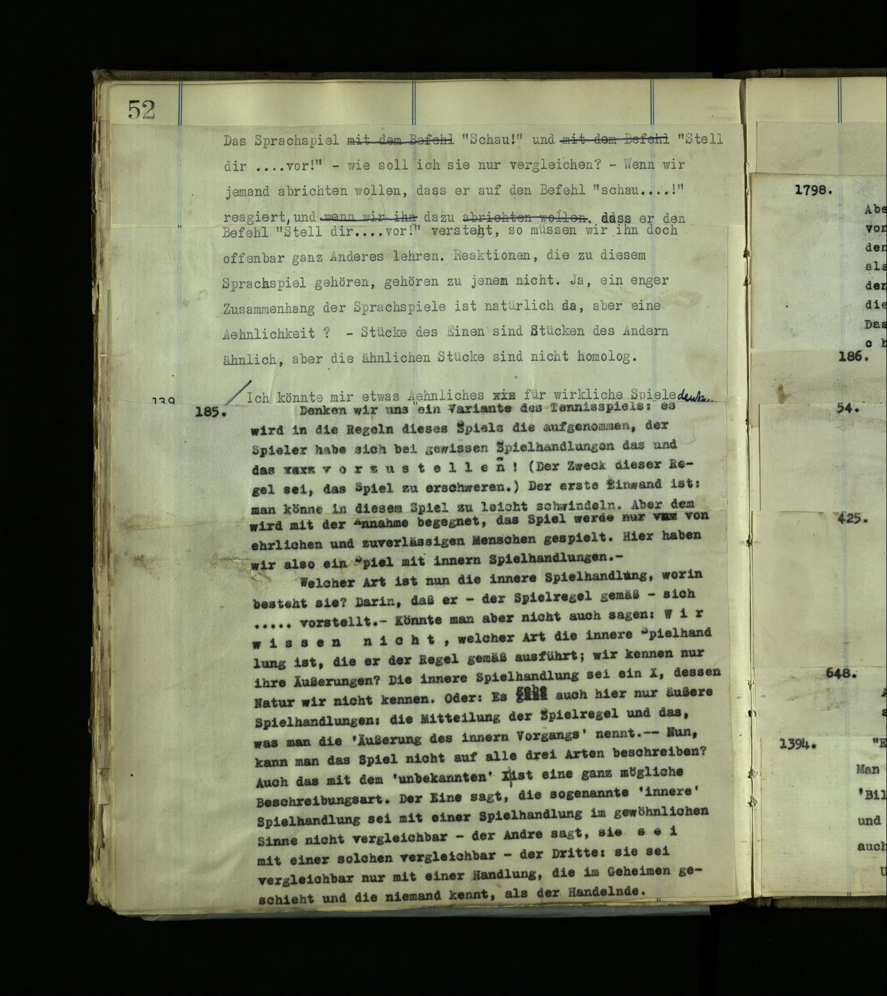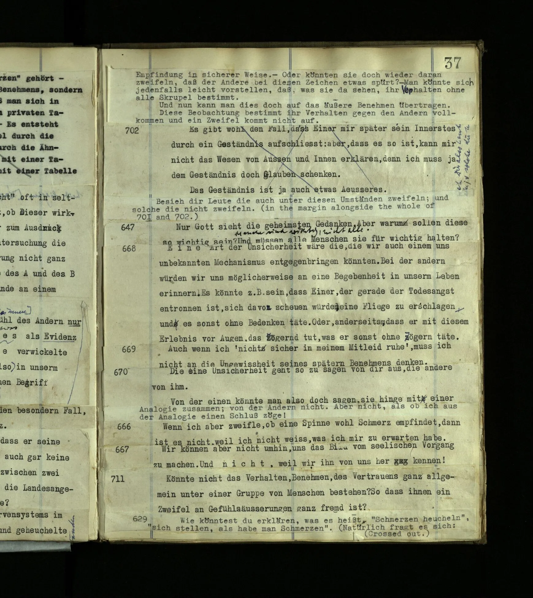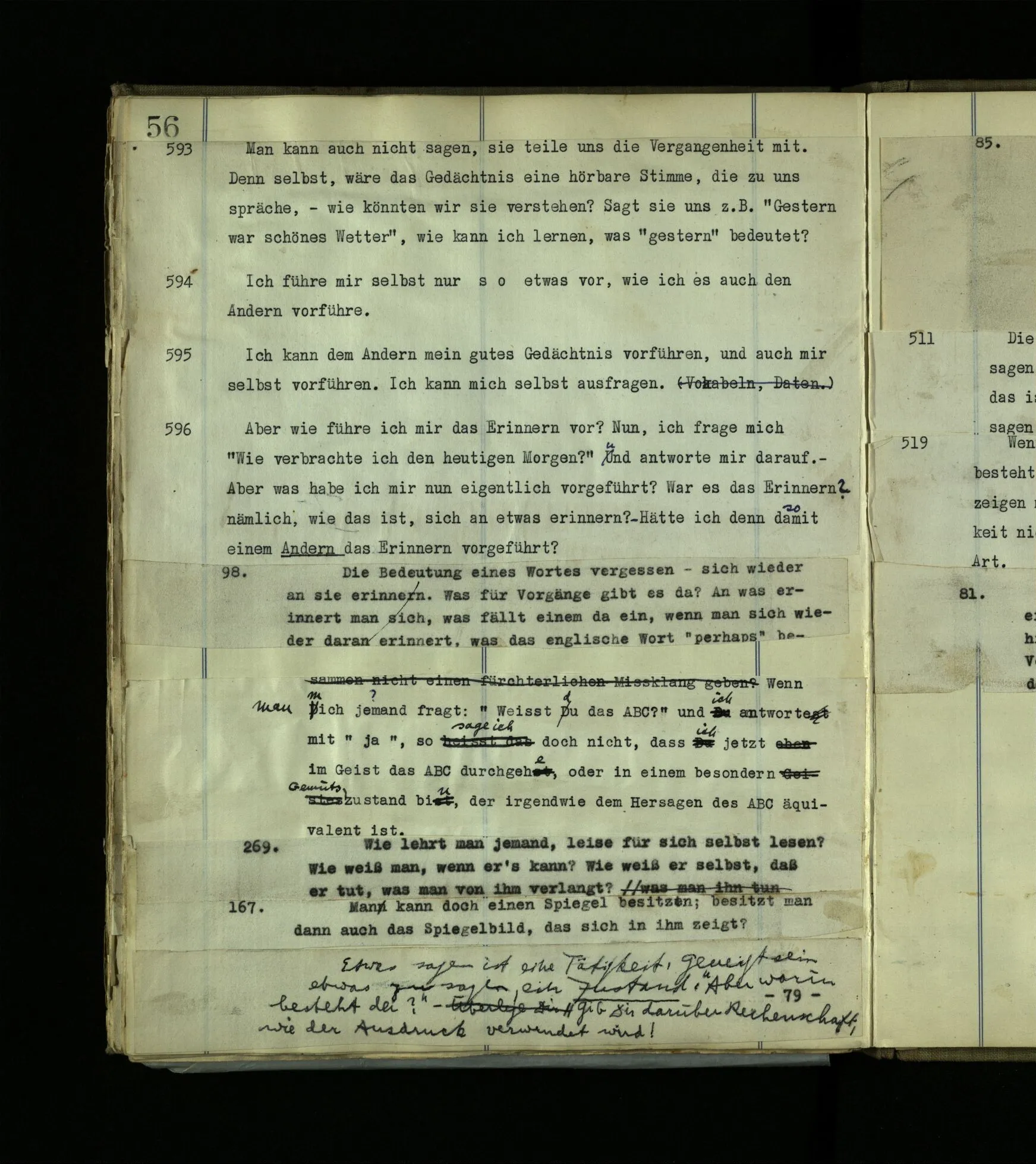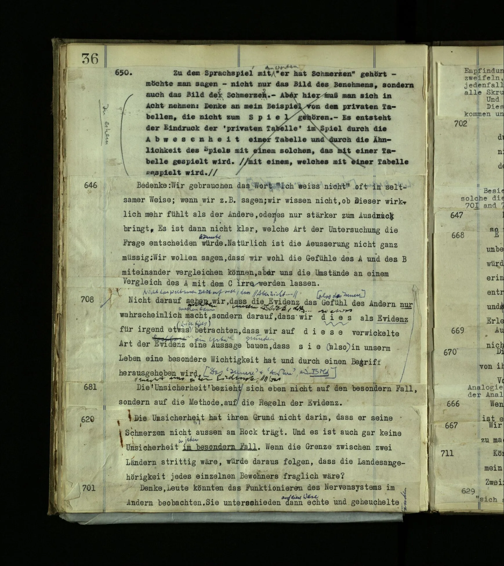 568. “Gott kannst du nicht mit einem Anderen reden hören, sondern nur, wenn du der Angeredete bist.“ Das ist eine grammatische Bemerkung.