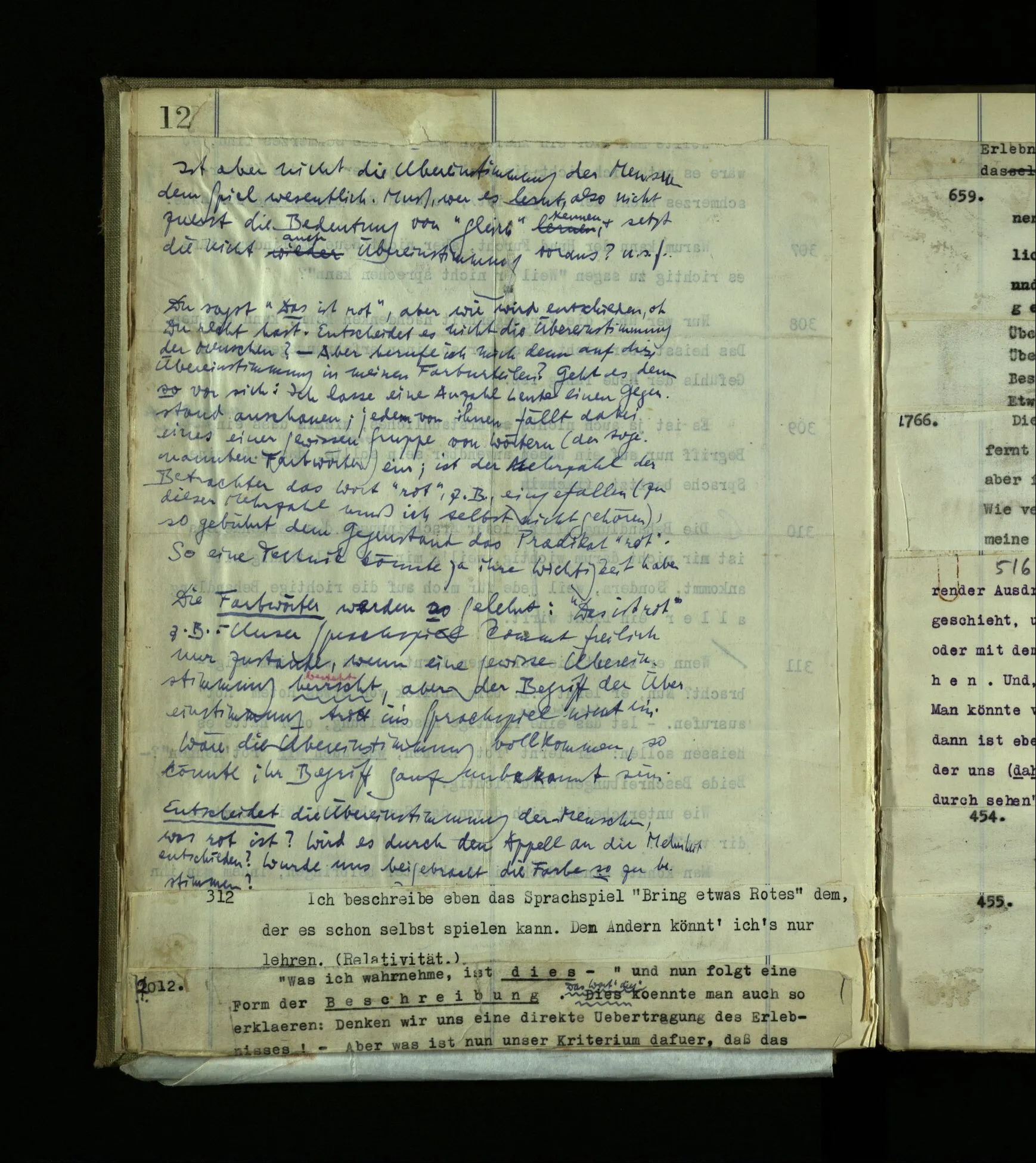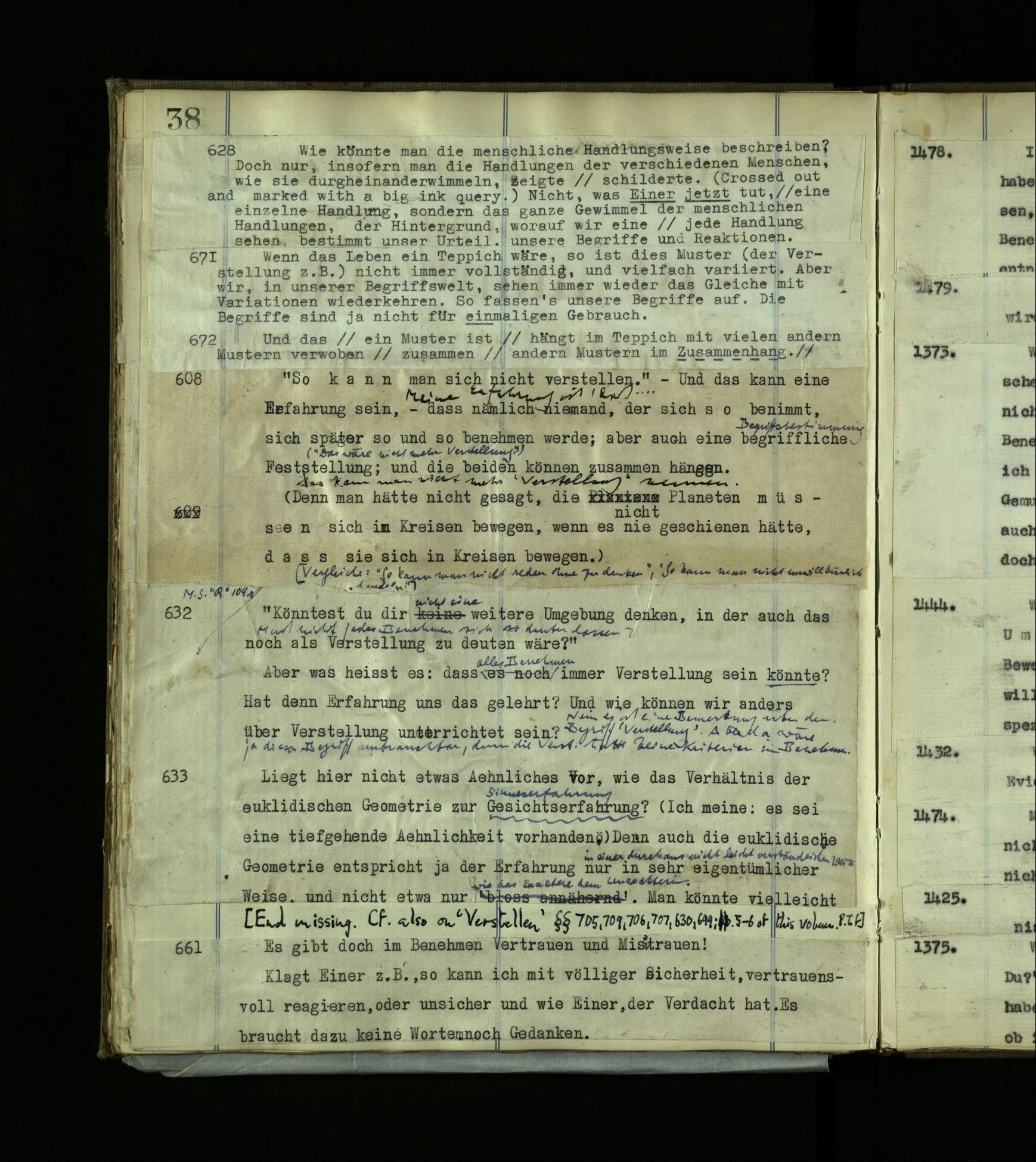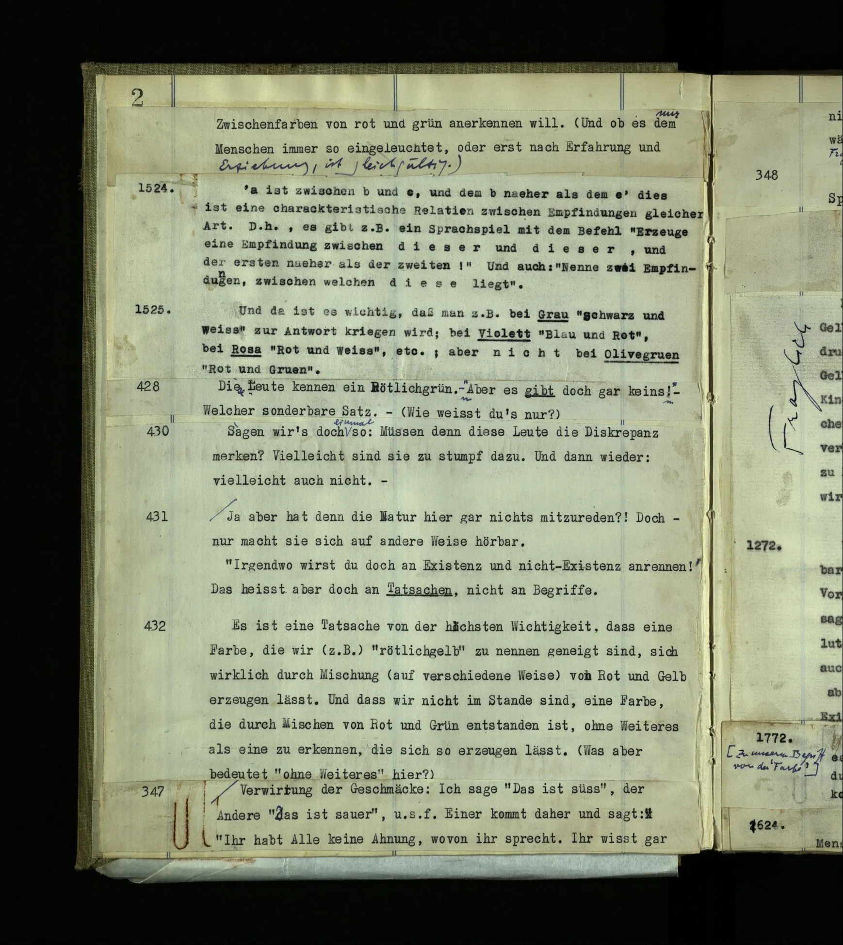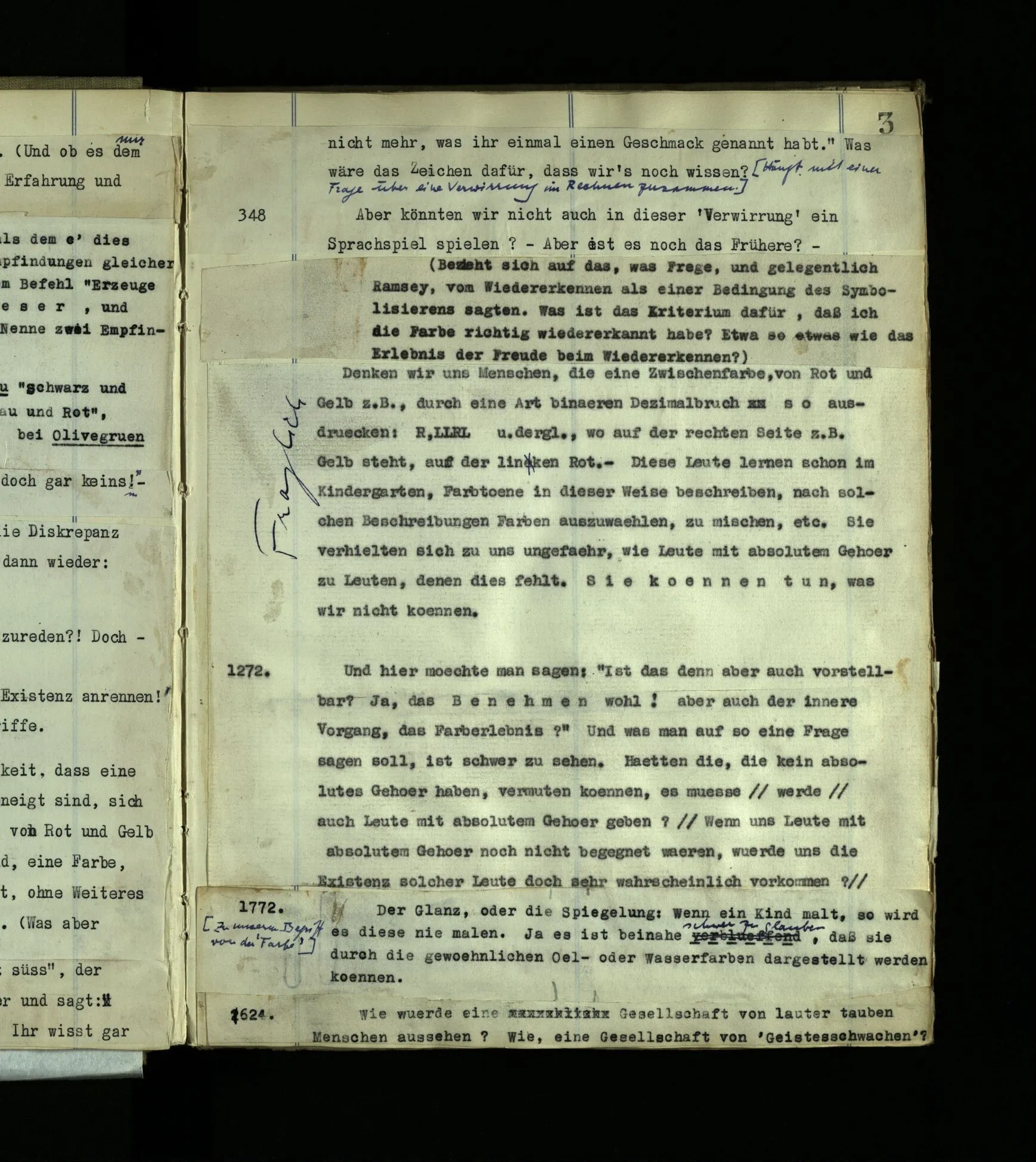 1272. Und hier möchte man sagen: “Ist das denn aber auch vorstellbar? Ja, das Benehmen wohl! aber auch der innere Vorgang, das Farberlebnis?” Und was man auf so eine Frage sagen soll, ist schwer zu sehen. Hätten die, die kein absolutes Gehör haben, vermuten können, es müsse auch Leute mit absolutem Gehör geben?