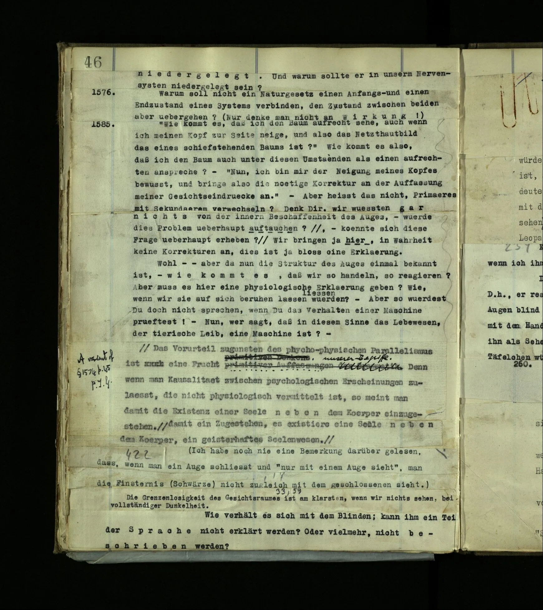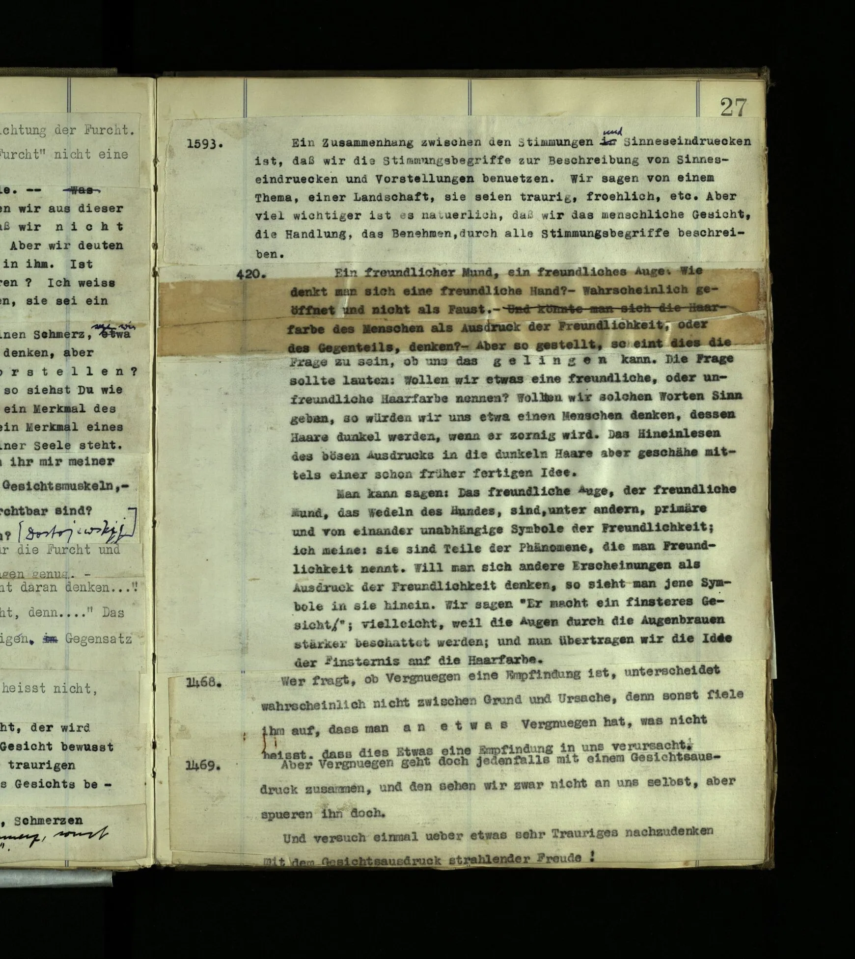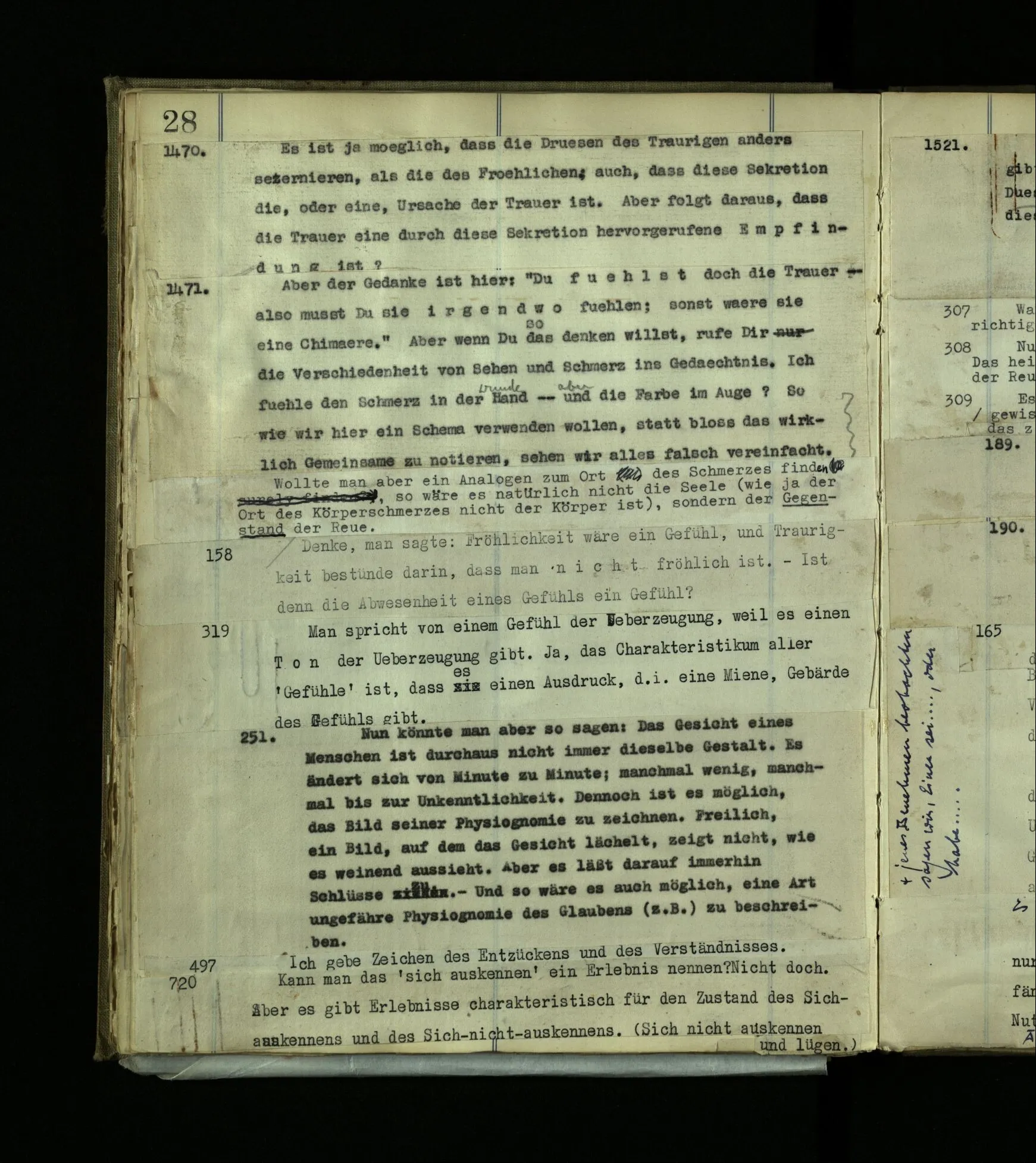 1272. Und hier möchte man sagen: “Ist das denn aber auch vorstellbar? Ja, das Benehmen wohl! aber auch der innere Vorgang, das Farberlebnis?” Und was man auf so eine Frage sagen soll, ist schwer zu sehen. Hätten die, die kein absolutes Gehör haben, vermuten können, es müsse auch Leute mit absolutem Gehör geben?