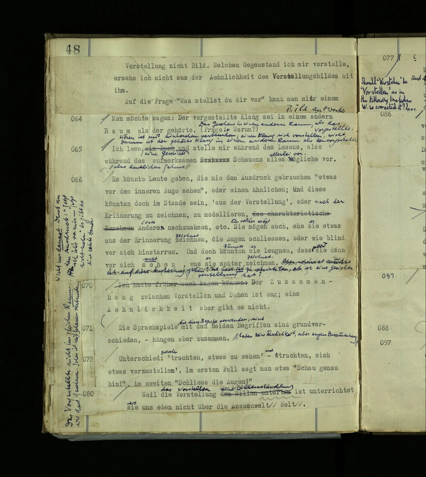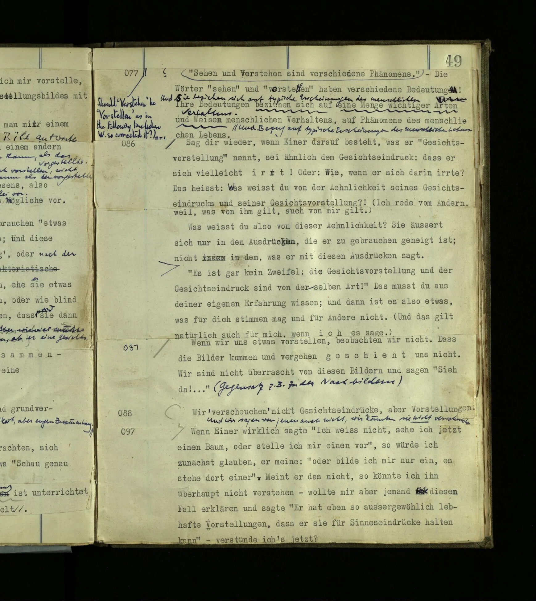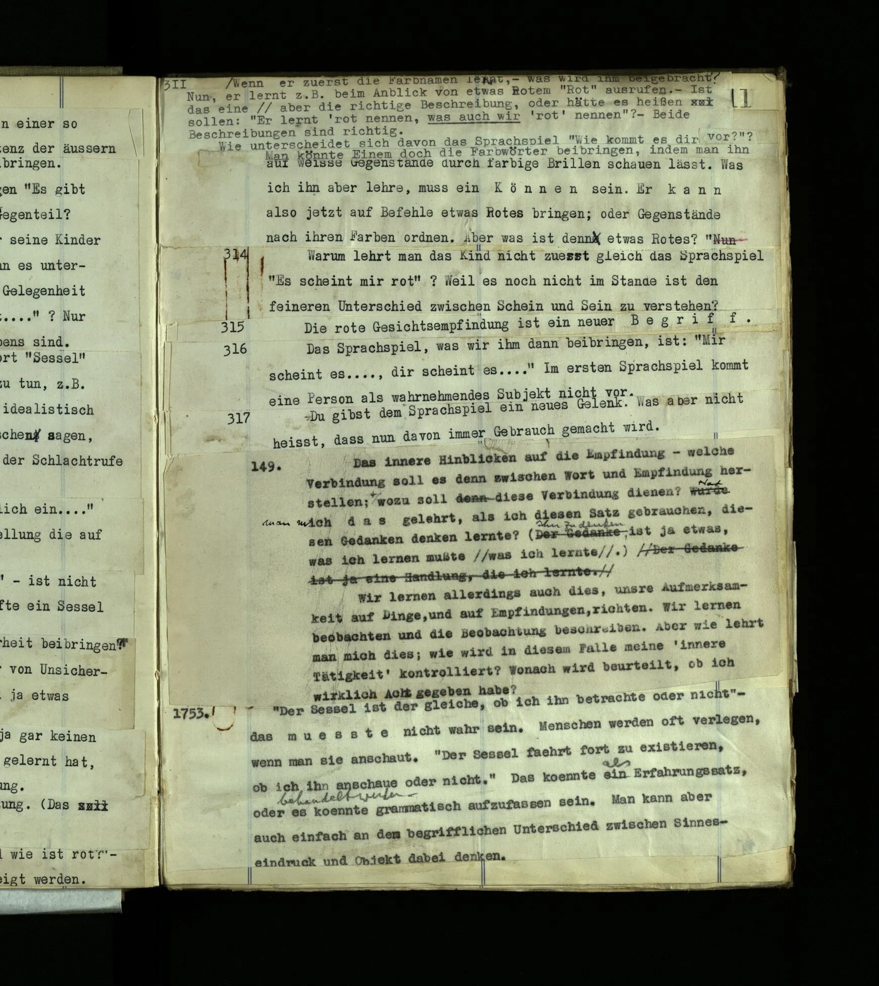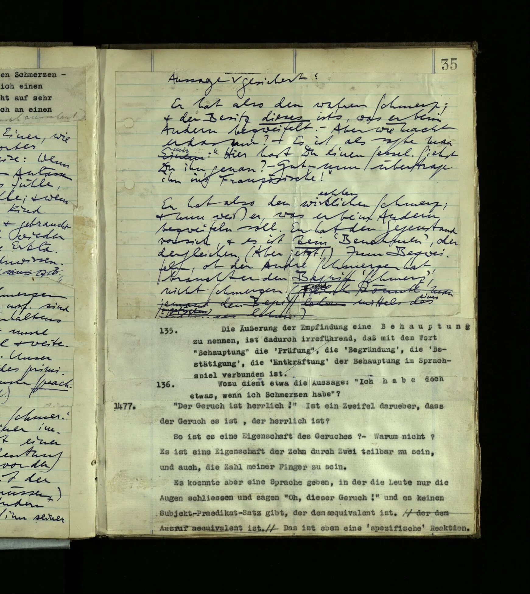 1272. Und hier möchte man sagen: “Ist das denn aber auch vorstellbar? Ja, das Benehmen wohl! aber auch der innere Vorgang, das Farberlebnis?” Und was man auf so eine Frage sagen soll, ist schwer zu sehen. Hätten die, die kein absolutes Gehör haben, vermuten können, es müsse auch Leute mit absolutem Gehör geben?