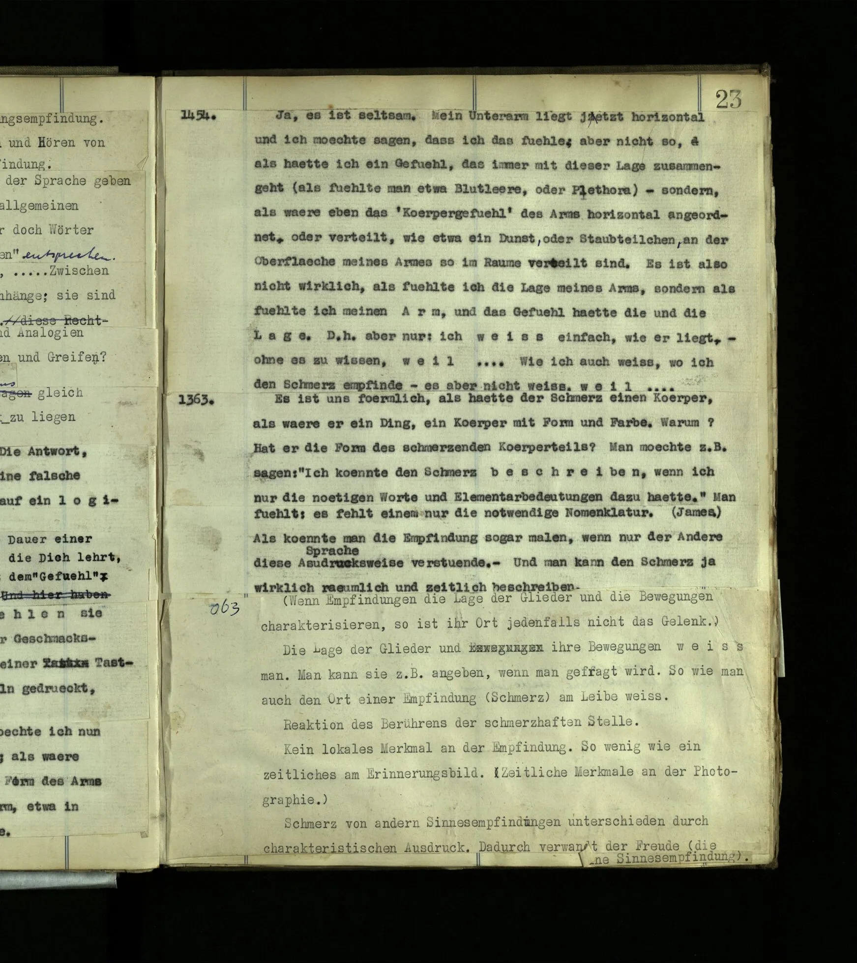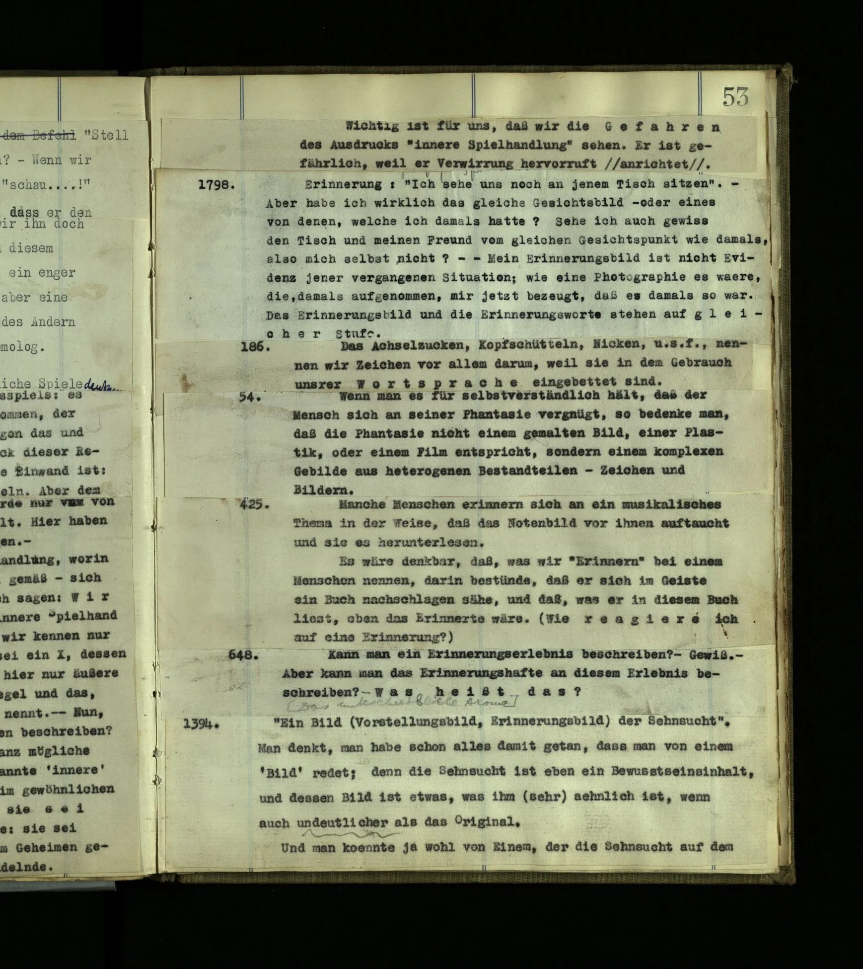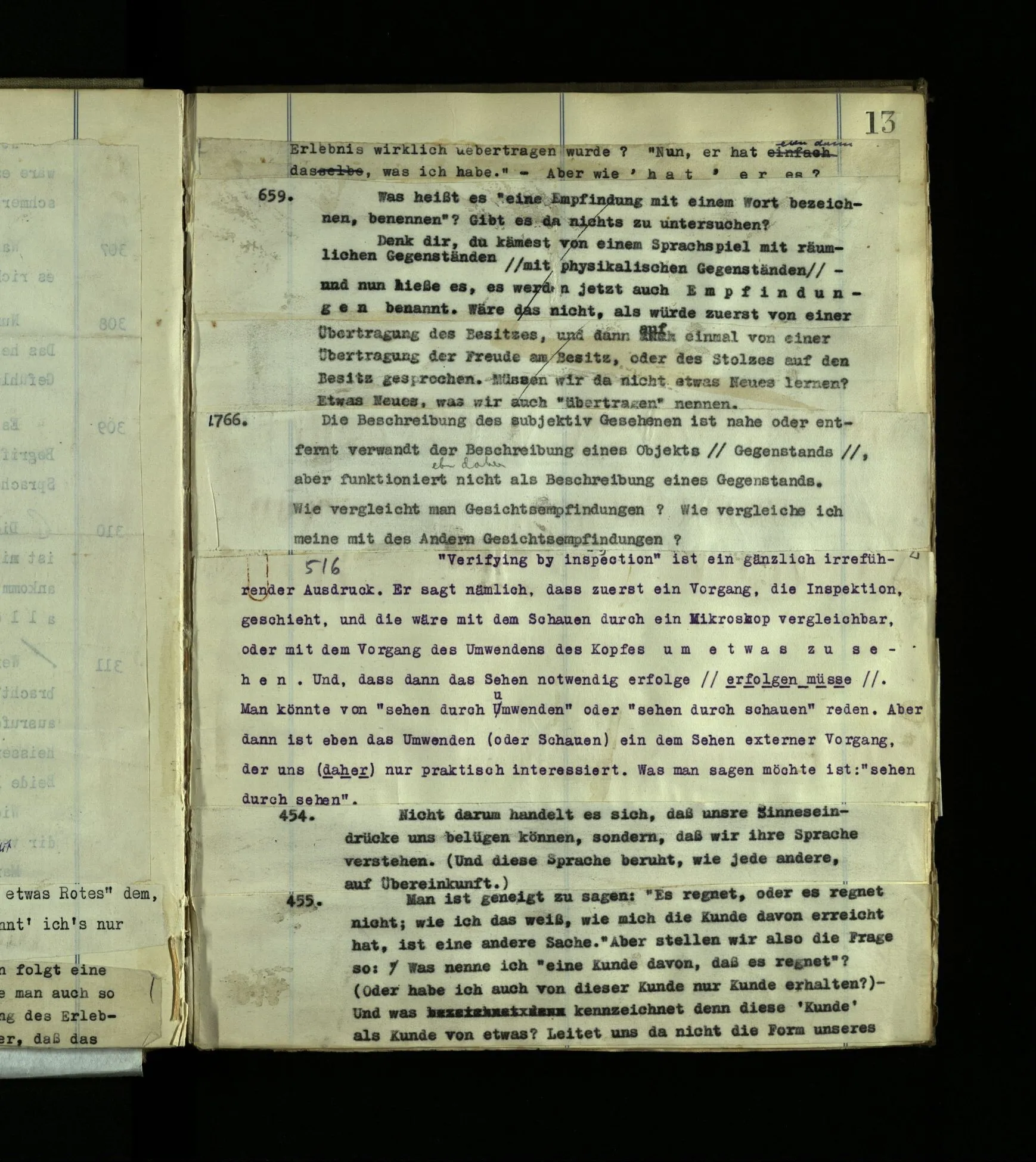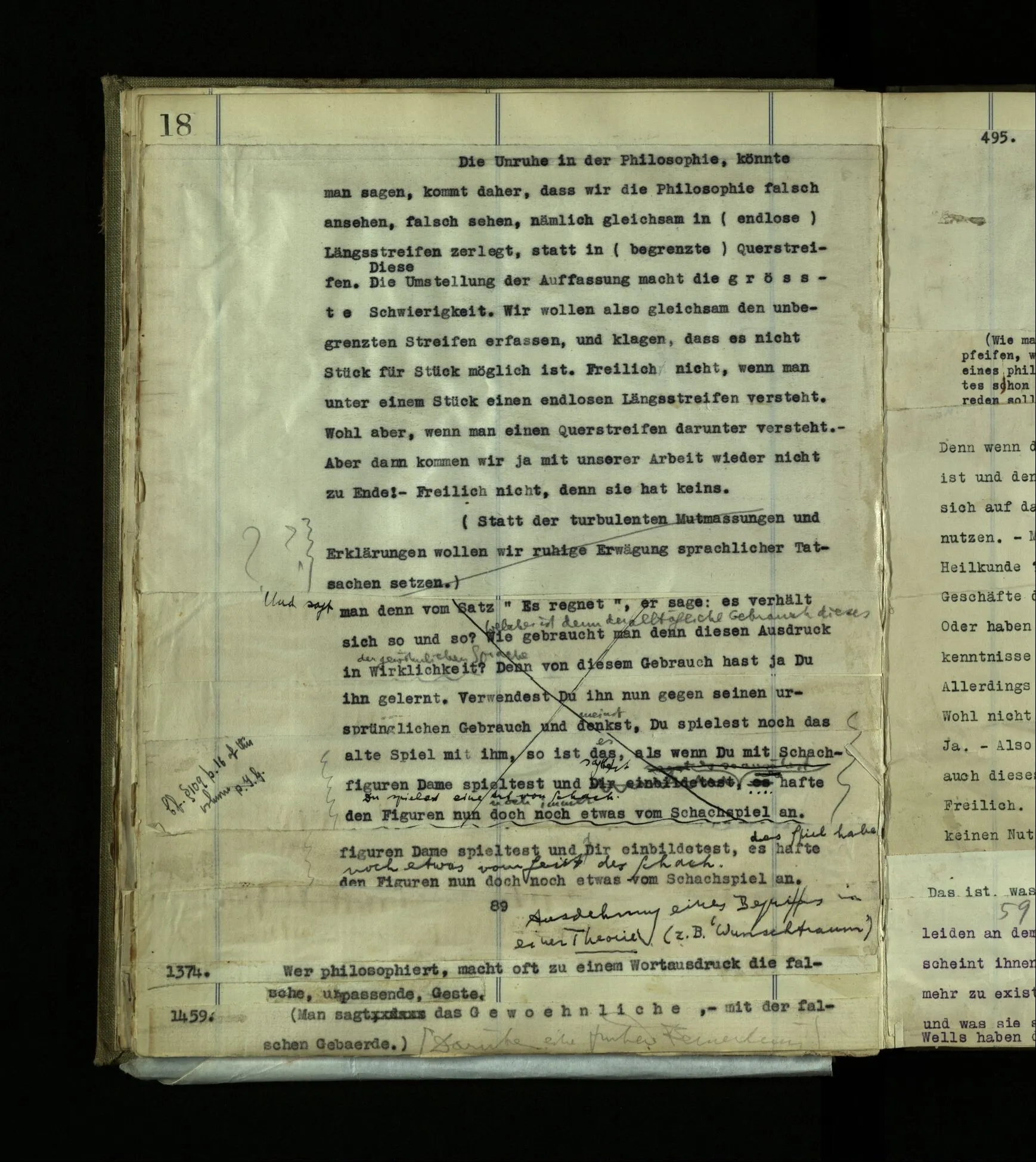 1603. Ein Sprachspiel analog einem Fragment eines andern. Ein Raum in begrenzte Stücke eines Raums projiziert. Ein ‘löchriger’ Raum.