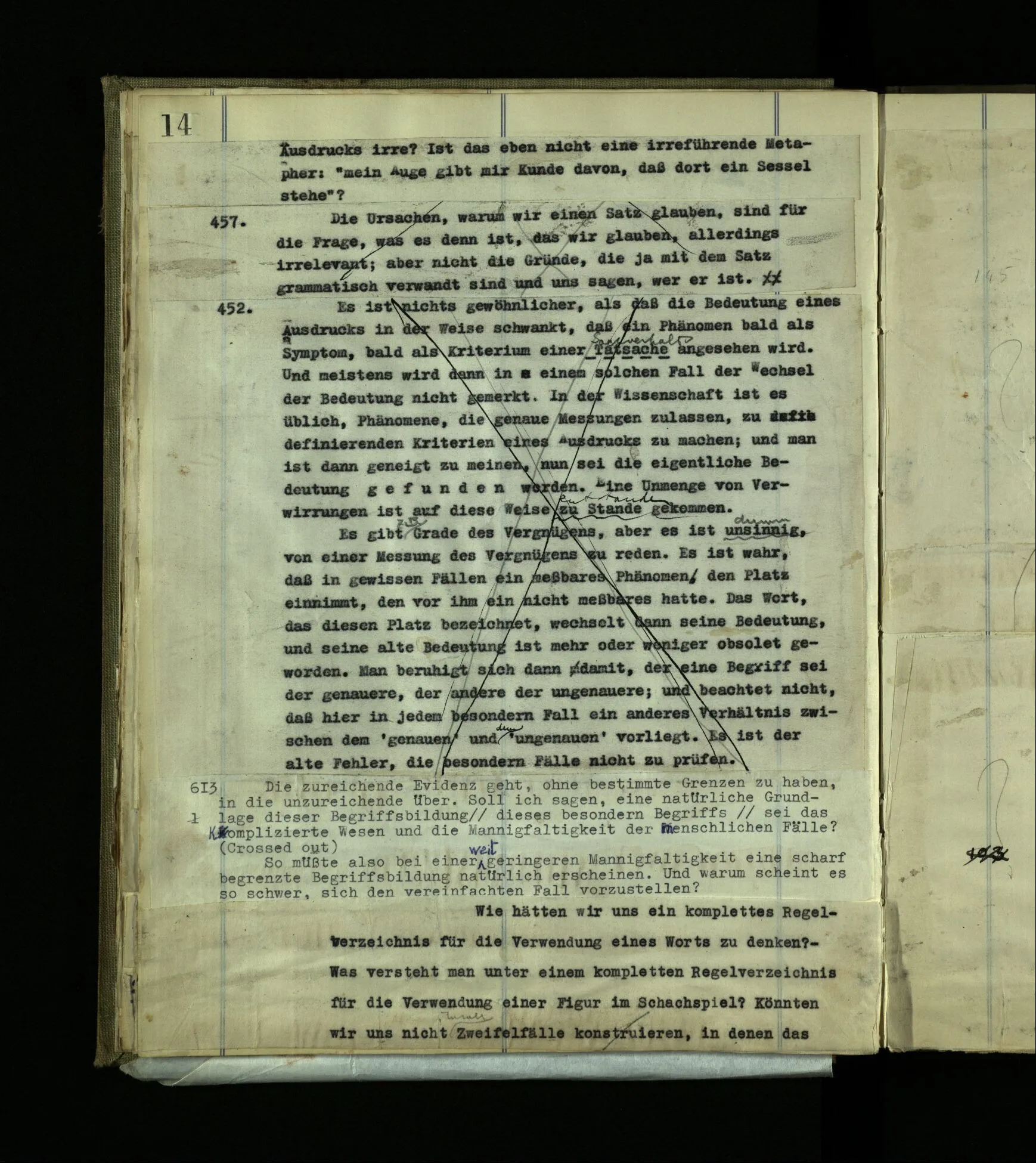 682 Festbegrenzte Begriffe würden eine Gleichförmigkeit des Verhaltens fordern. Aber wo ich sicher bin, ist der Andere unsicher. Und das ist eine Naturtatsache.