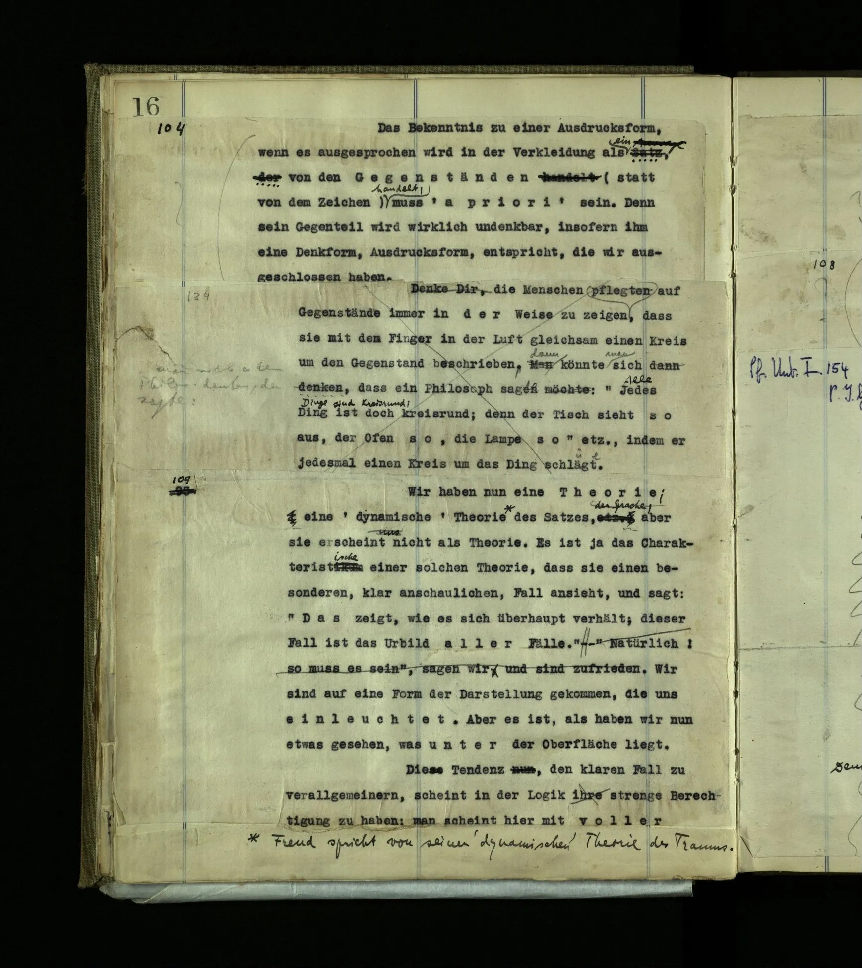 102 Man kann die Rechnung als Ornament betrachten. Eine Figur in der Ebene kann an eine andere passen oder nicht, mit anderen in verschiedener Weise zusammengefaßt werden. Wenn die Figur noch gefärbt ist, so gibt es dann noch ein Passen in Bezug auf die Farbe. (Die Farbe ist nur eine weitere Dimension.) Es gibt eine Betrachtungsweise der elektrischen Maschinen und Apparate (Dynamos, Radiostationen, etc. etc.), die sozusagen ohne vorgefaßtes Verständnis diese Gegenstände als eine Verteilung von Kupfer, Eisen, Gummi, etc. im Raum ansieht. Und diese Betrachtungsweise könnte zu manchem interessanten Resultat führen. Sie ist ganz analog der eines mathematischen Satzes als Ornament. – Es ist natürlich eine durchaus strenge und korrekte Auffassung; und das Charakteristische und Schwierige an ihr ist, daß sie den Gegenstand ohne jede vorgefaßte Idee betrachtet (sozusagen von einem Marsstandpunkt), oder vielleicht richtiger: die normale vorgefaßte Idee, Erklärung, zerstört (durchkreuzt).