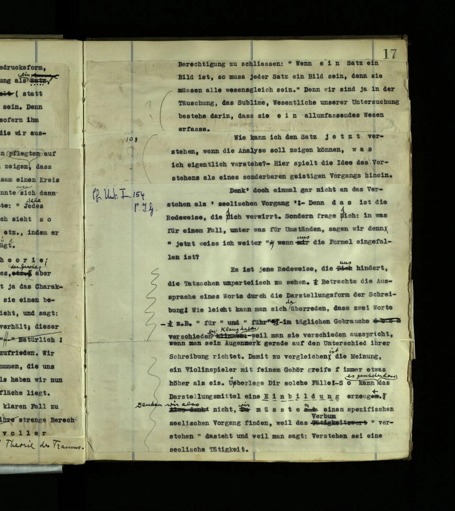 Verschieden. – Aber es ist dann doch, als ob sein Wort nicht dasselbe bezeichnen könnte wie unseres. Oder nur einen Teil davon. – Aber so muß es ja auch ausschauen, wenn sein Begriff verschieden ist. Denn die Unbestimmtheit unseres Begriffs kann sich ja für uns in den Gegenstand projizieren, den das Wort bezeichnet. So daß, fehlte die Unbestimmtheit, auch nicht ‘dasselbe gemeint’ wäre. Das Bild, das wir verwenden, versinnbildlicht die Unbestimmtheit.