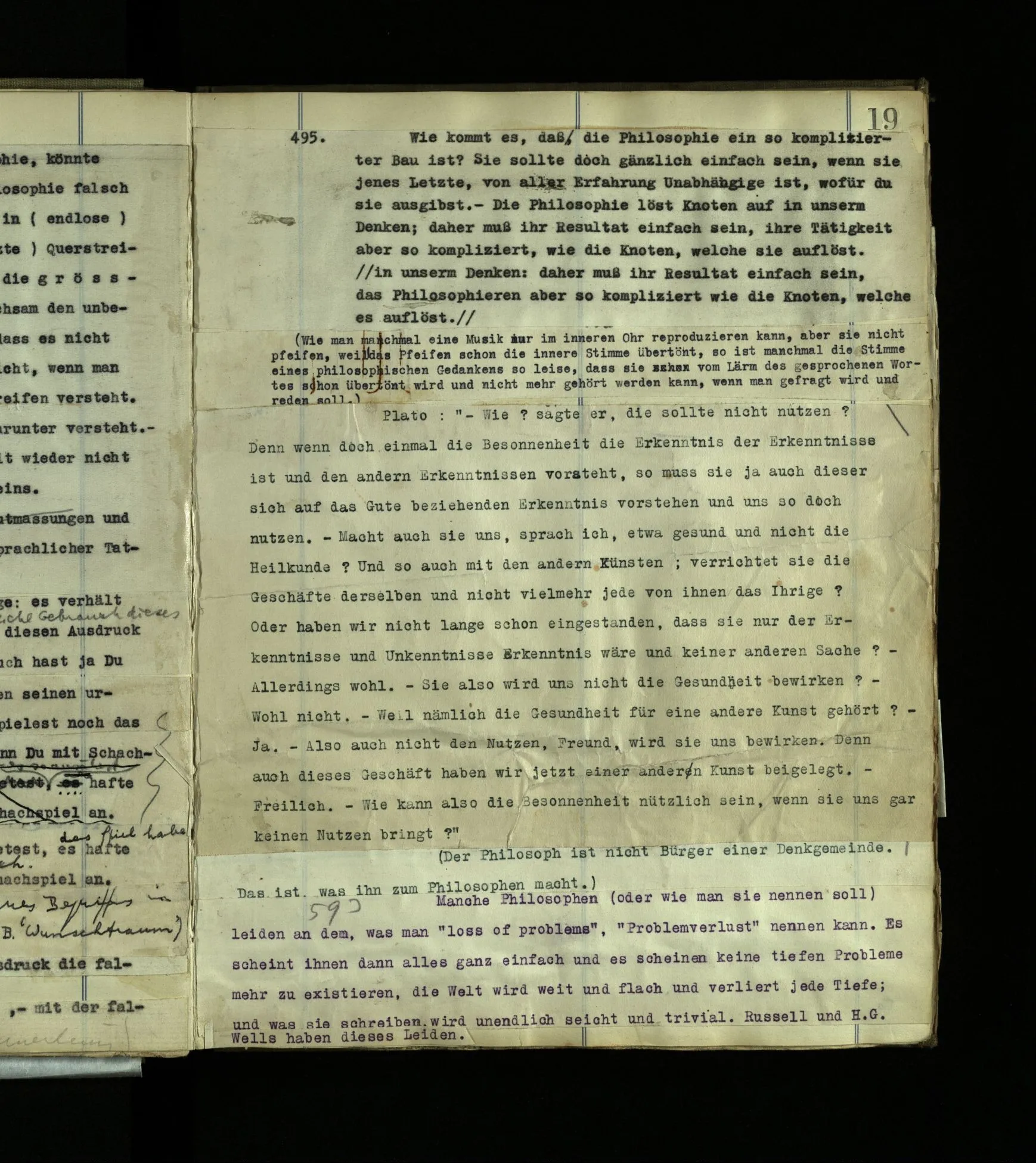 640 In der Philosophie darf man keine Denkkrankheit abschneiden. Sie muß ihren natürlichen Lauf gehen, und die langsame Heilung ist das Wichtigste. (Daher die Mathematiker so schlechte Philosophen sind.)