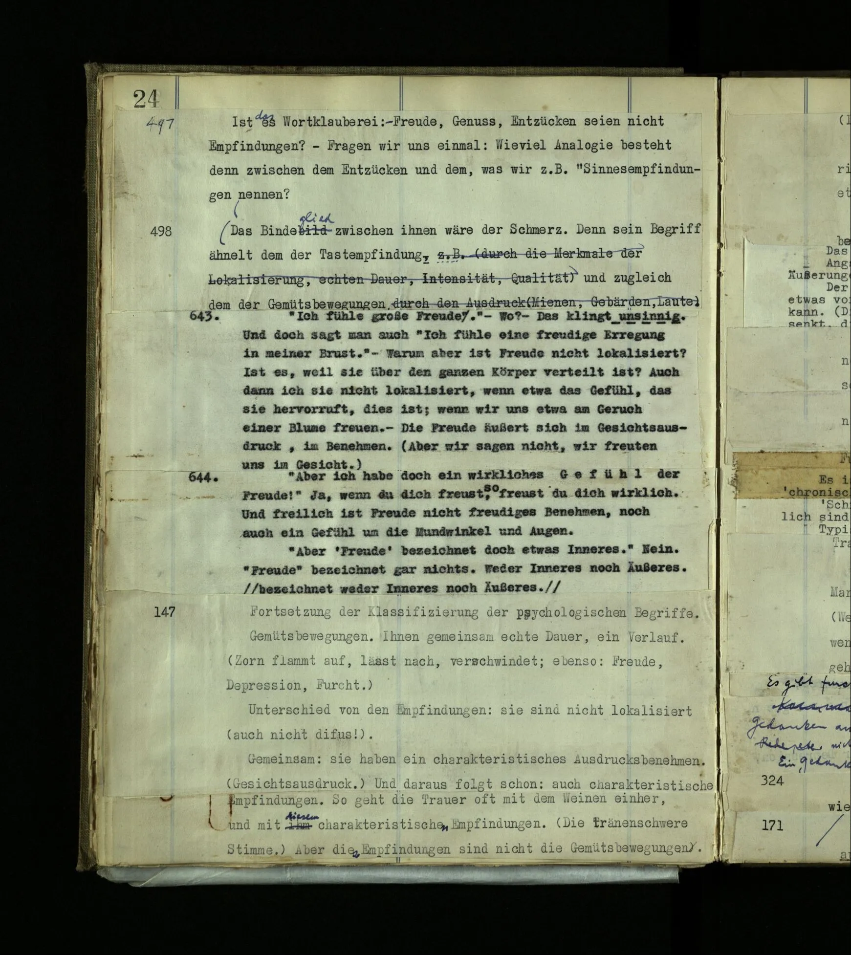 1524. ‘a ist zwischen b und c, und dem b näher als dem c’ dies ist eine charakteristische Relation zwischen Empfindungen gleicher Art. D.h., es gibt z.B. ein Sprachspiel mit dem Befehl “Erzeuge eine Empfindung zwischen dieser und dieser, und der ersten näher als der zweiten!” Und auch: “Nenne zwei Empfindungen, zwischen welchen diese liegt”.