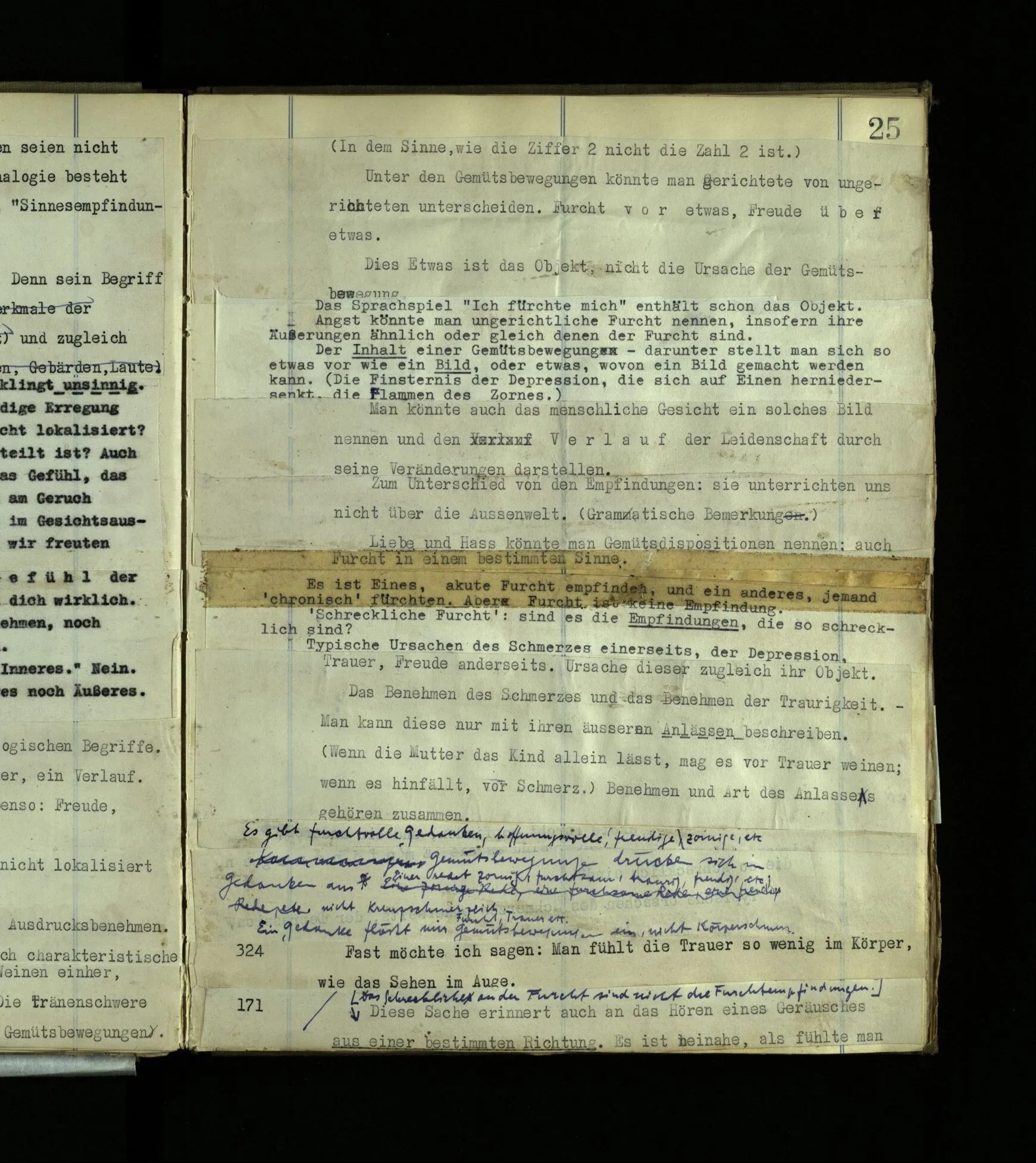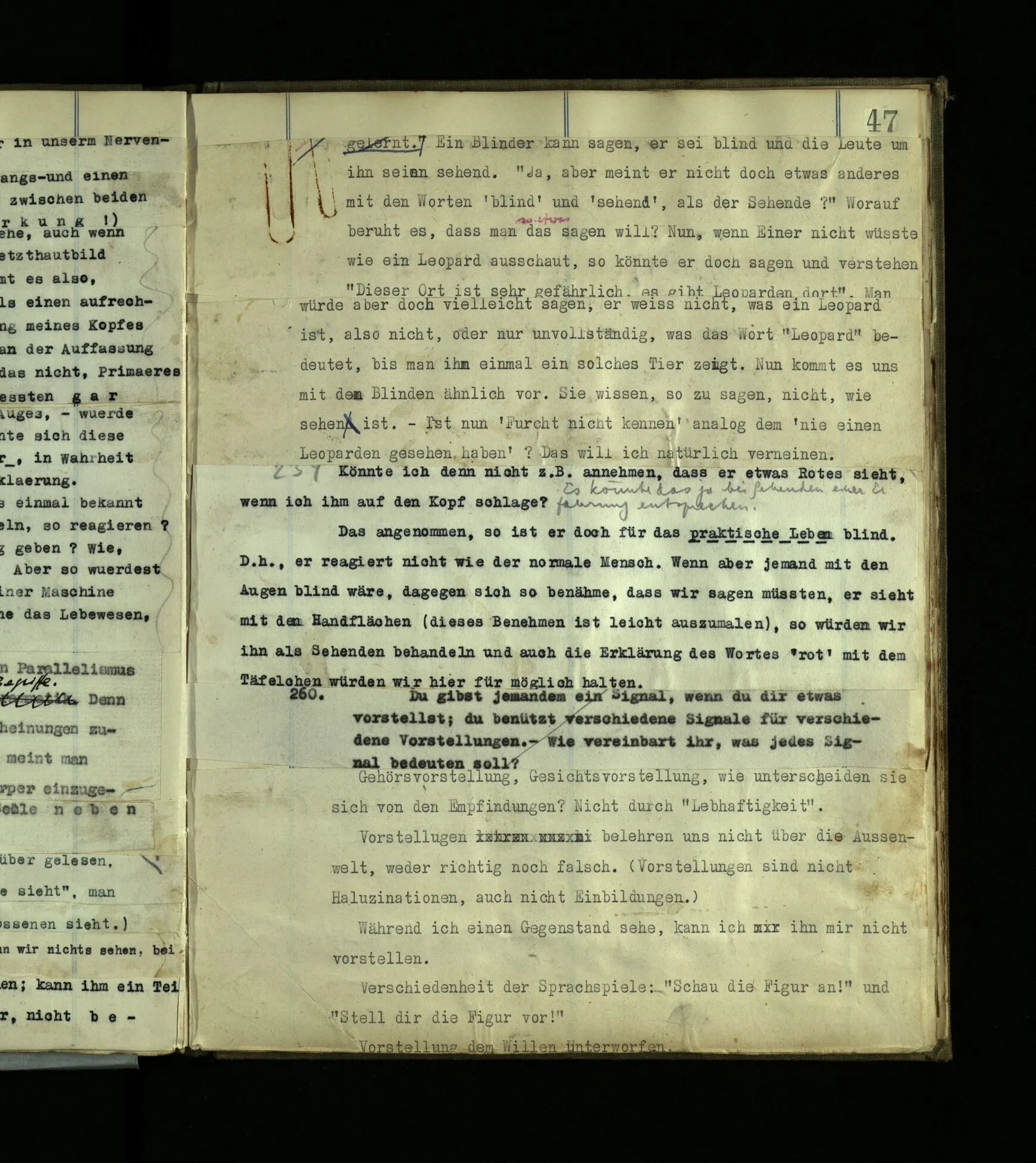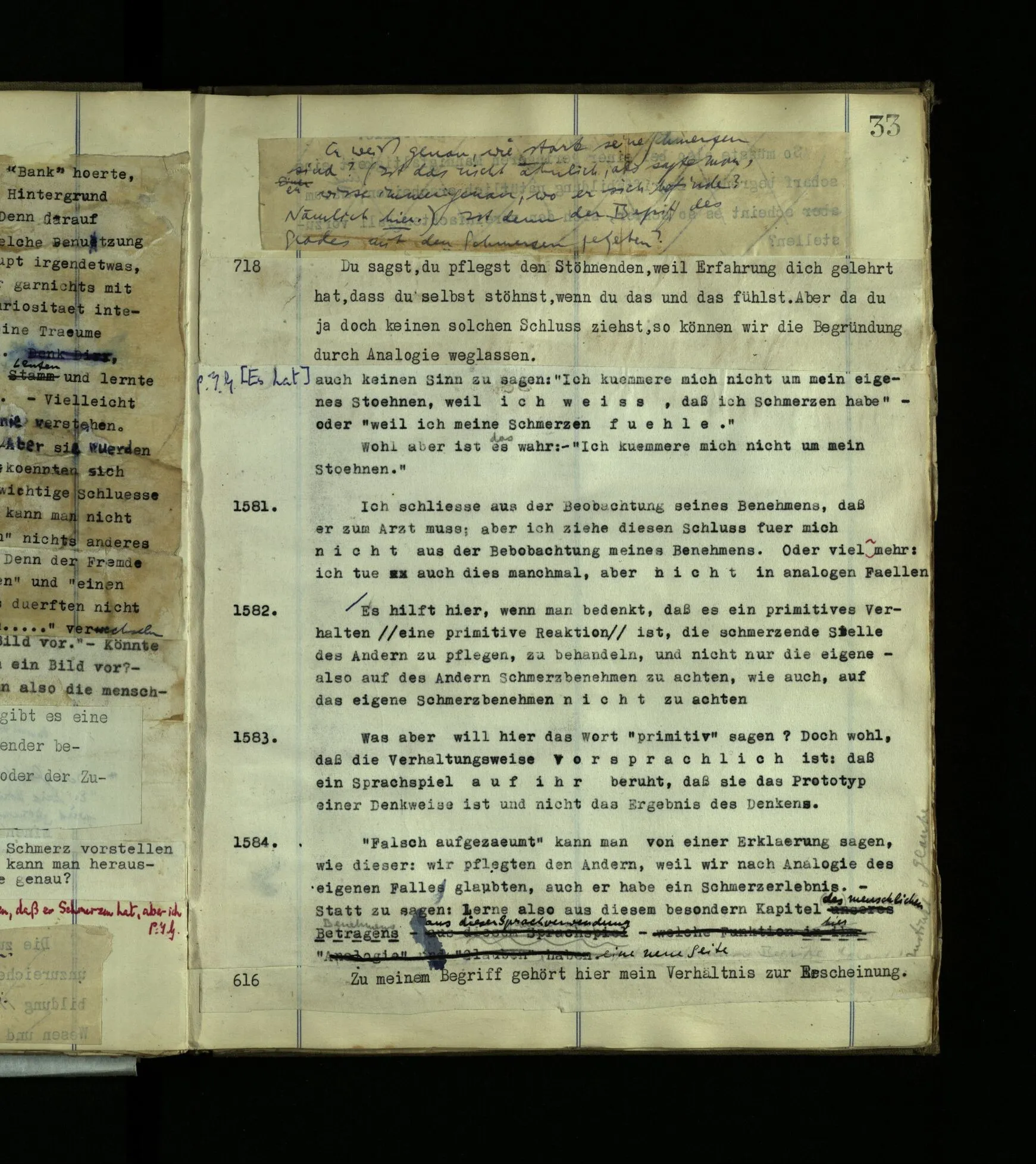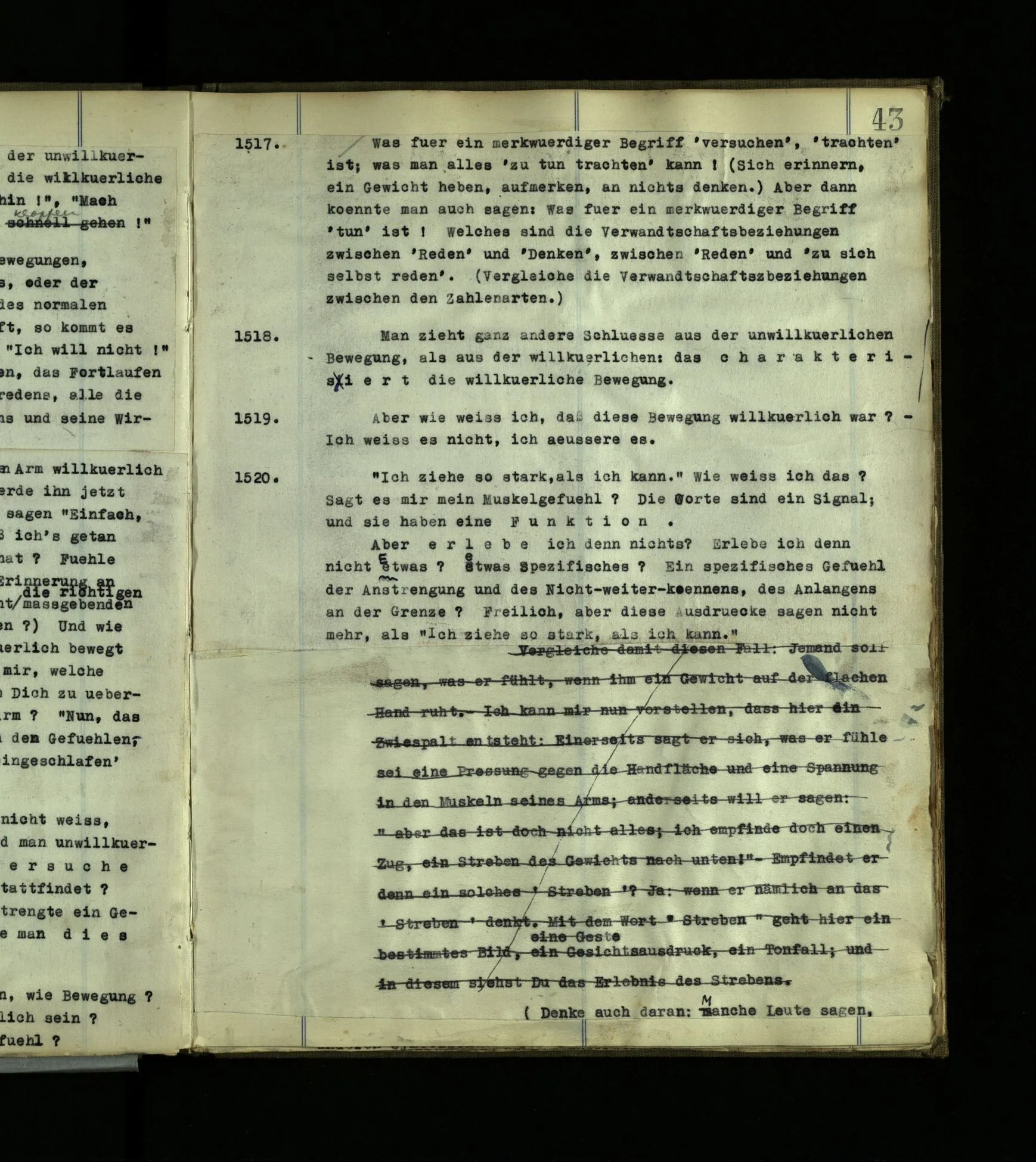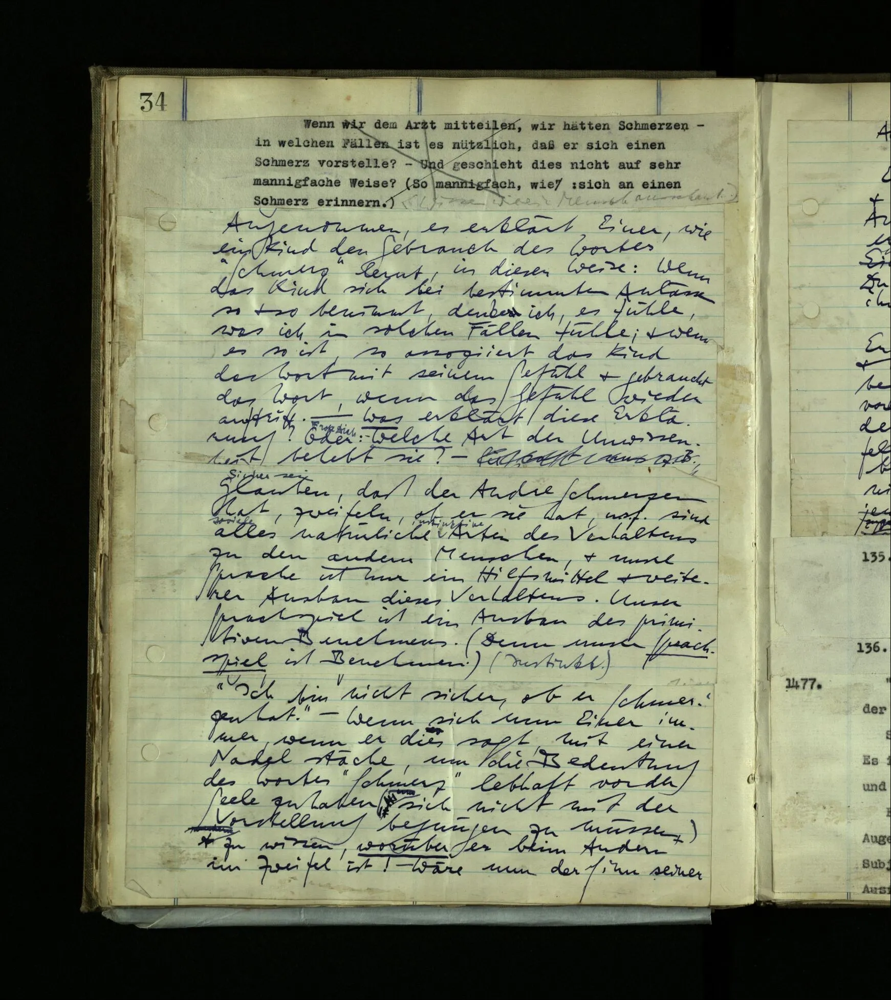 630 Man könnte ihn doch einfach lehren, den Schmerz (z.B. zu mimen) (nicht in der Absicht zu betrügen). Aber wäre es Jedem beizubringen? Ich meine: Er könnte ja wohl erlernen, gewisse rohe Schmerzzeichen von sich zu geben, ohne aber je aus eigenem, aus seiner eigenen Einsicht eine feinere Nachahmung zu geben, (Sprachtalent.) (Man könnte vielleicht einem gescheiten Hund eine Art Schmerzgeheul beibringen; aber es käme doch nie bei ihm zu einem bewußten Nachahmen.)