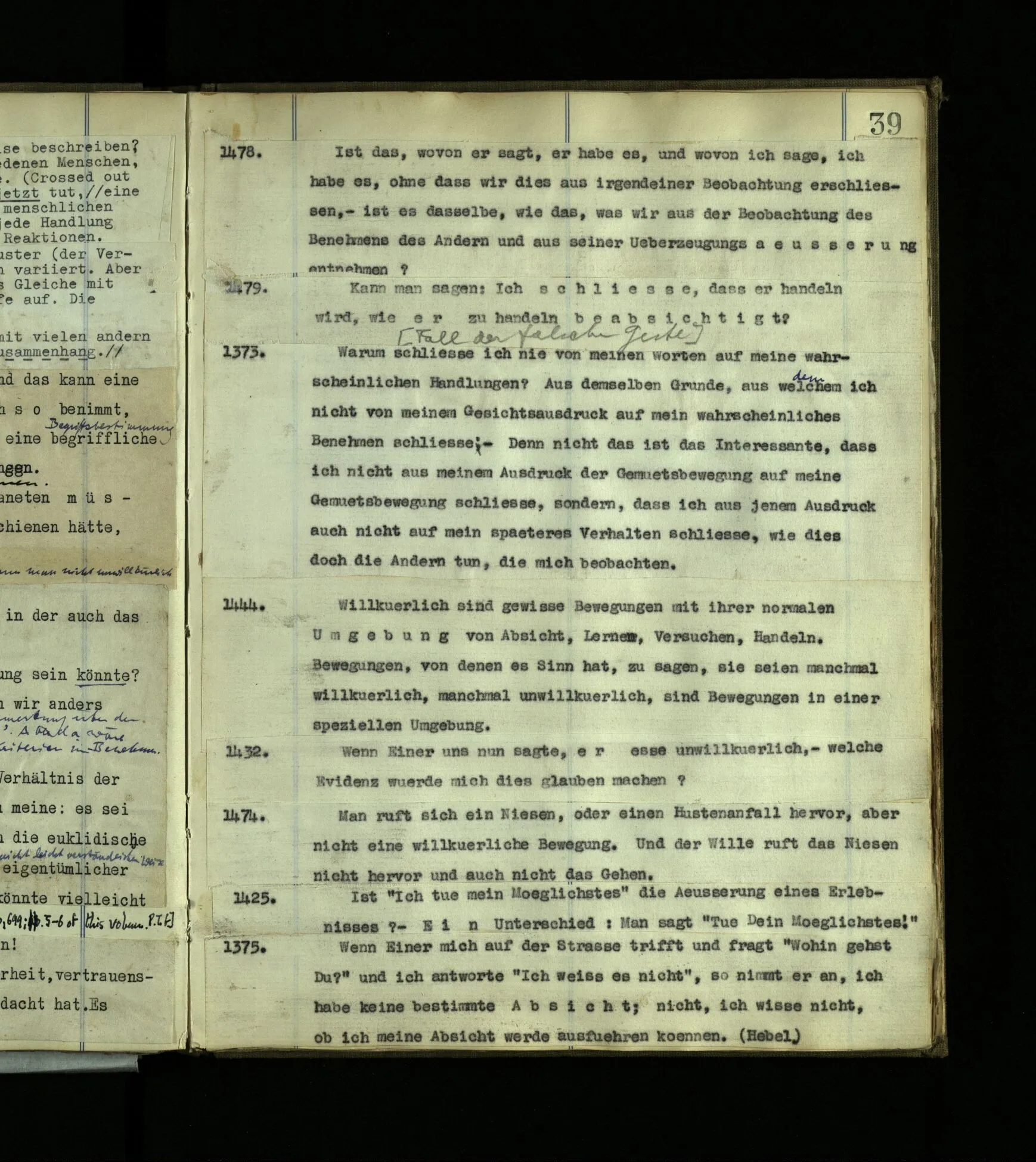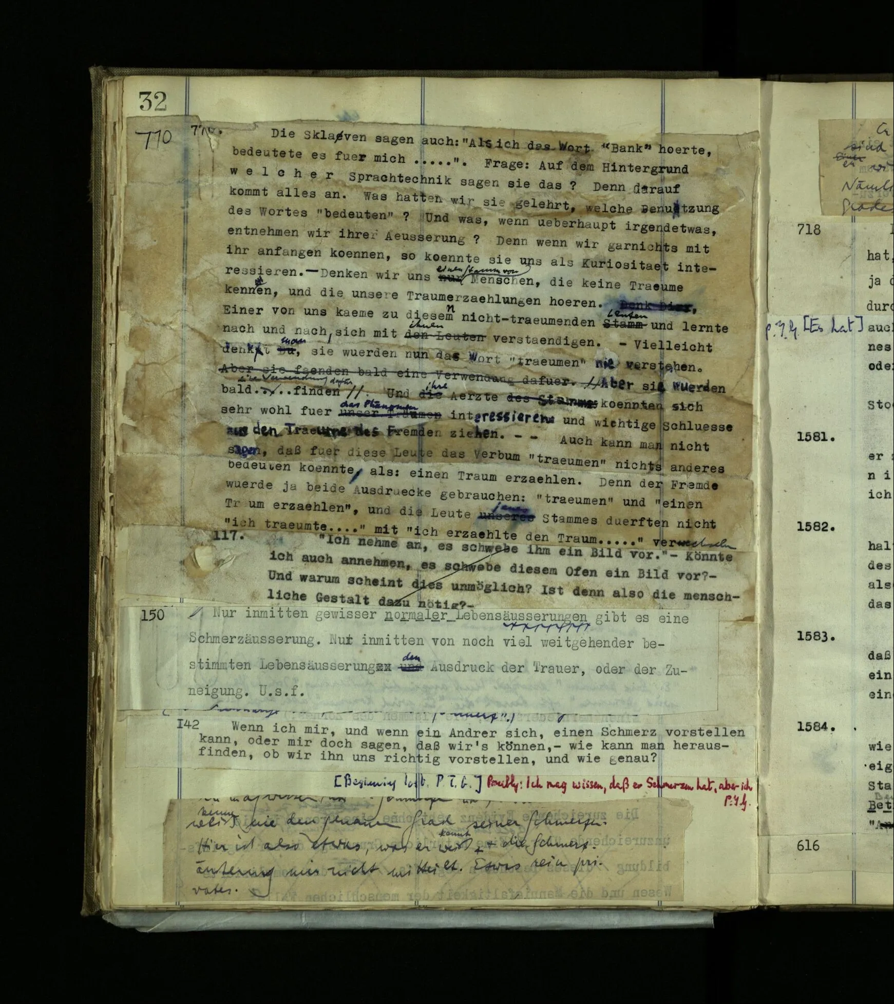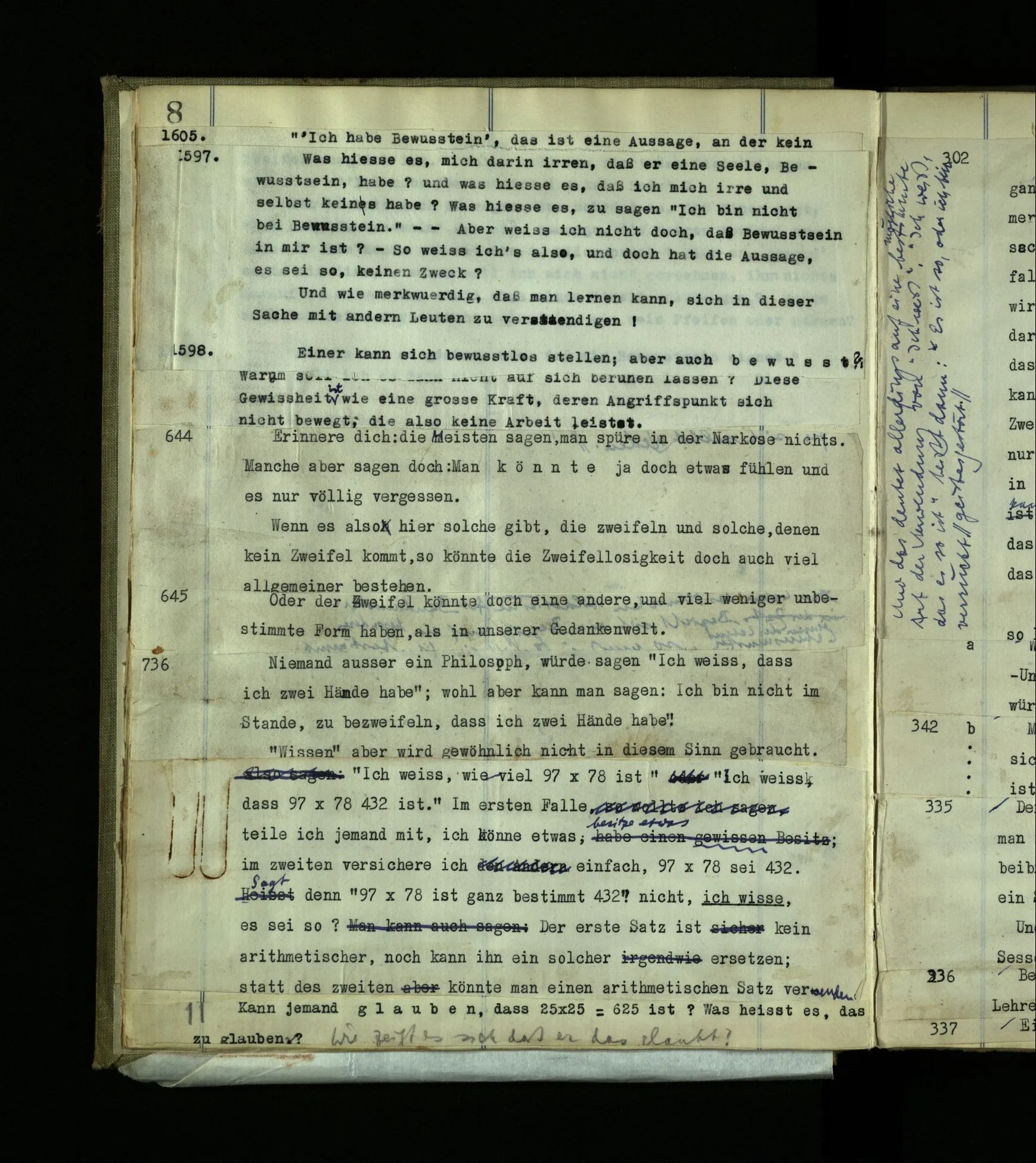 1597. Was hieße es, mich darin irren, daß er eine Seele, Bewußtsein, habe? und was hieße es, daß ich mich irre und selbst keins habe? Was hieße es, zu sagen “Ich bin nicht bei Bewußtsein.”‒ ‒ Aber weiß ich nicht doch, daß Bewußtsein in mir ist? – So weiß ich’s also, und doch hat die Aussage, es sei so, keinen Zweck? Und wie merkwürdig, daß man lernen kann, sich in dieser Sache mit andern Leuten zu verständigen!