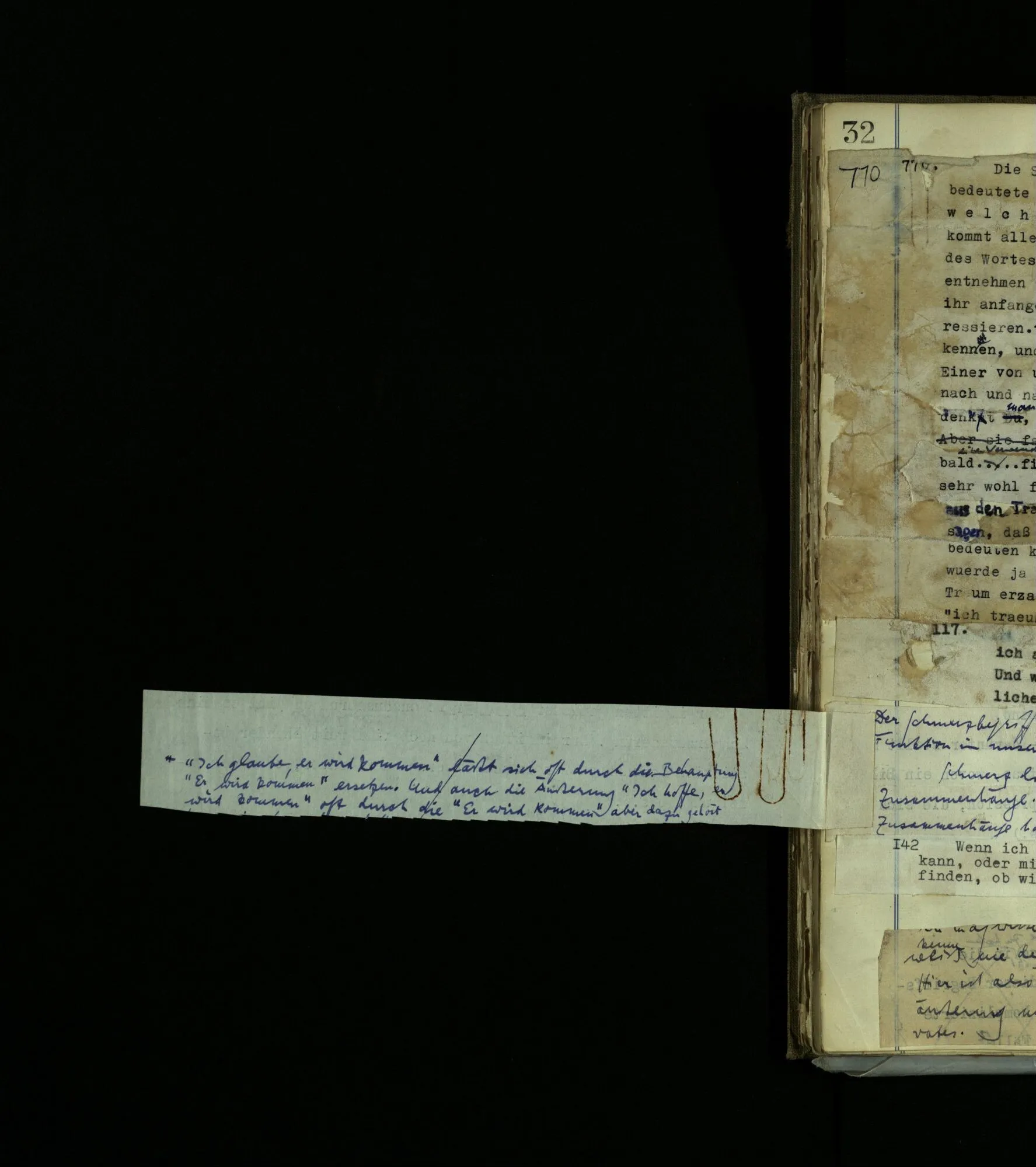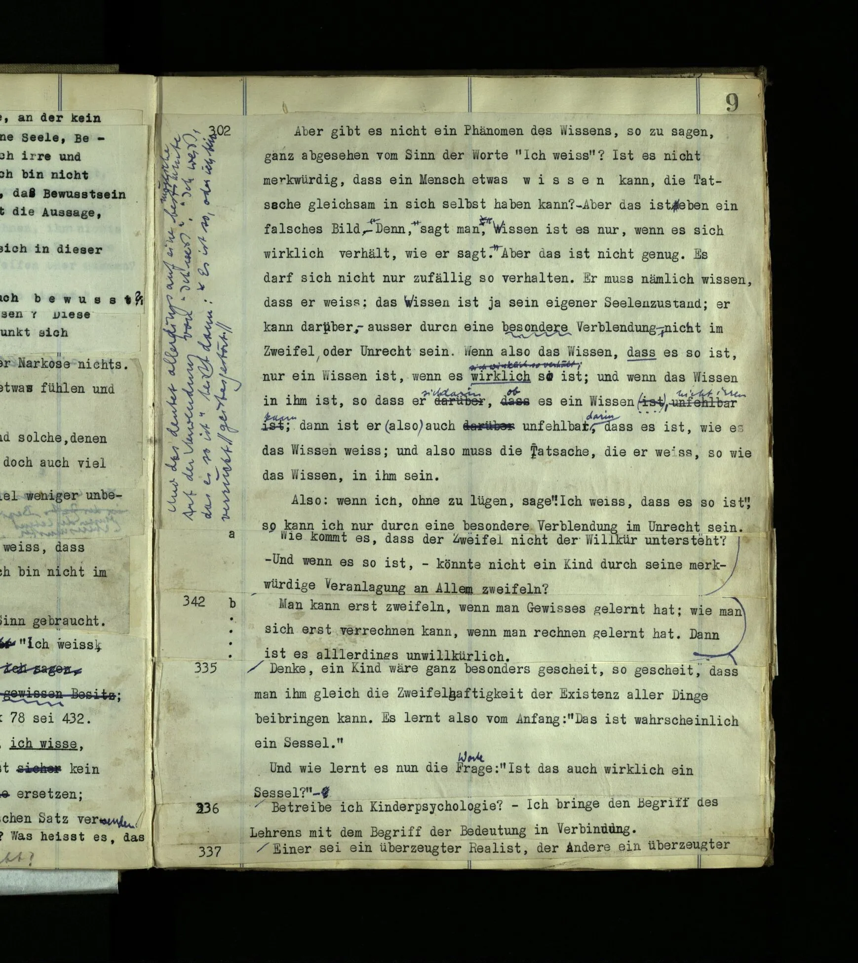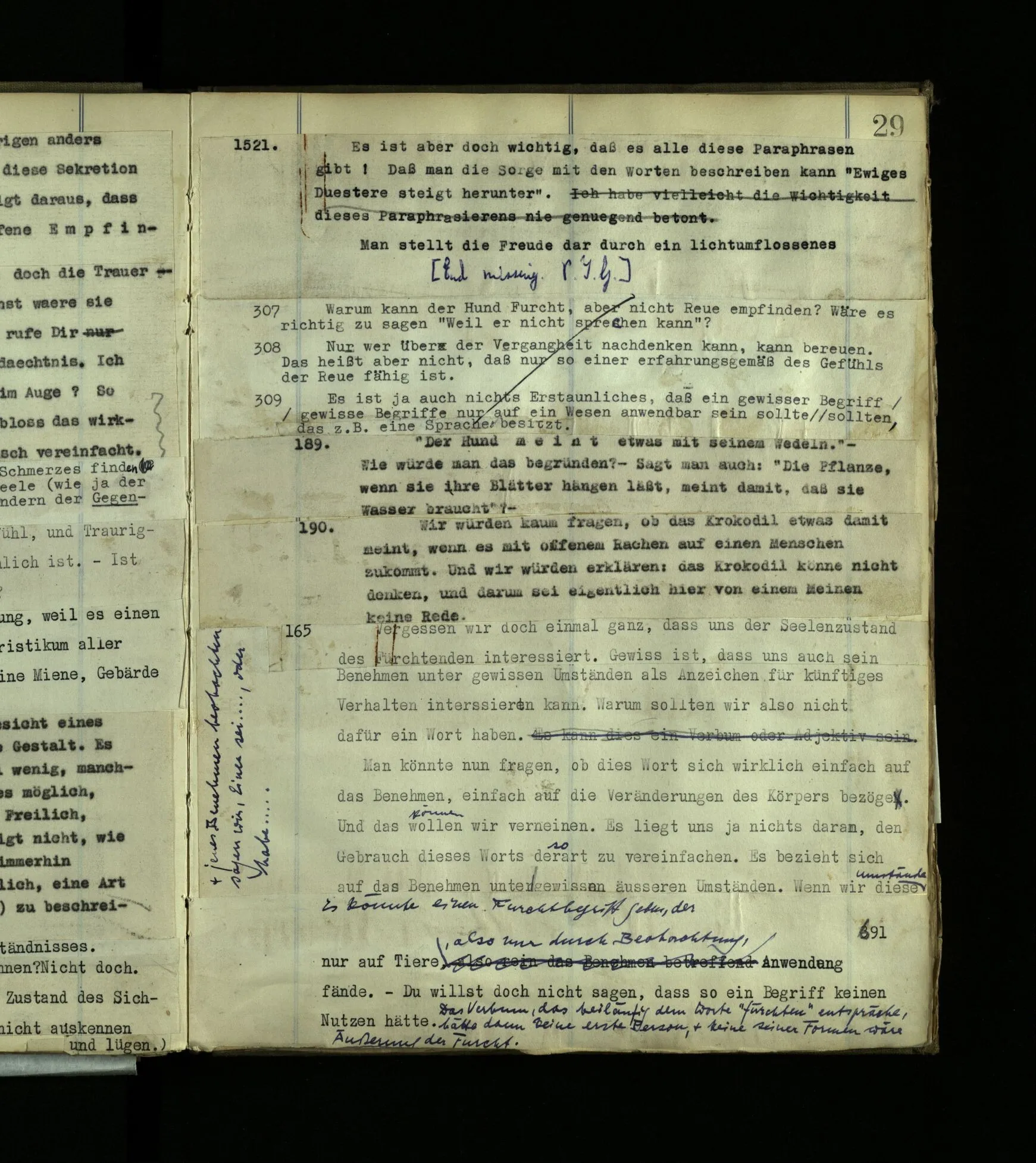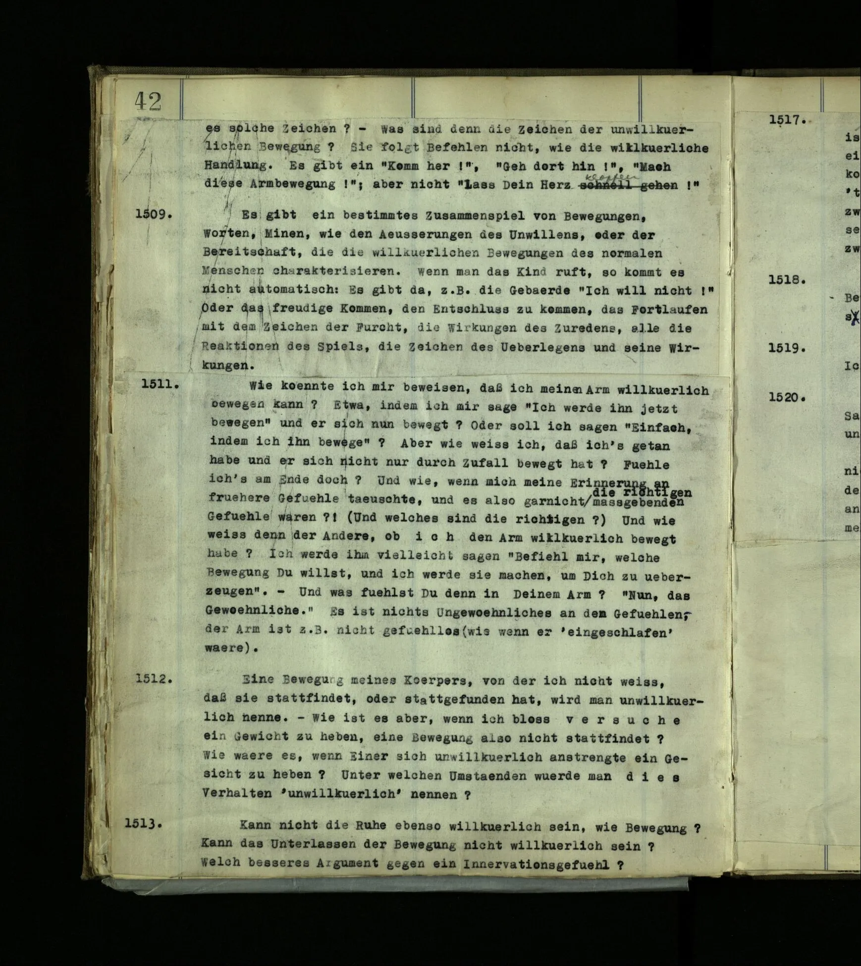 1597. Was hieße es, mich darin irren, daß er eine Seele, Bewußtsein, habe? und was hieße es, daß ich mich irre und selbst keins habe? Was hieße es, zu sagen “Ich bin nicht bei Bewußtsein.”‒ ‒ Aber weiß ich nicht doch, daß Bewußtsein in mir ist? – So weiß ich’s also, und doch hat die Aussage, es sei so, keinen Zweck? Und wie merkwürdig, daß man lernen kann, sich in dieser Sache mit andern Leuten zu verständigen!