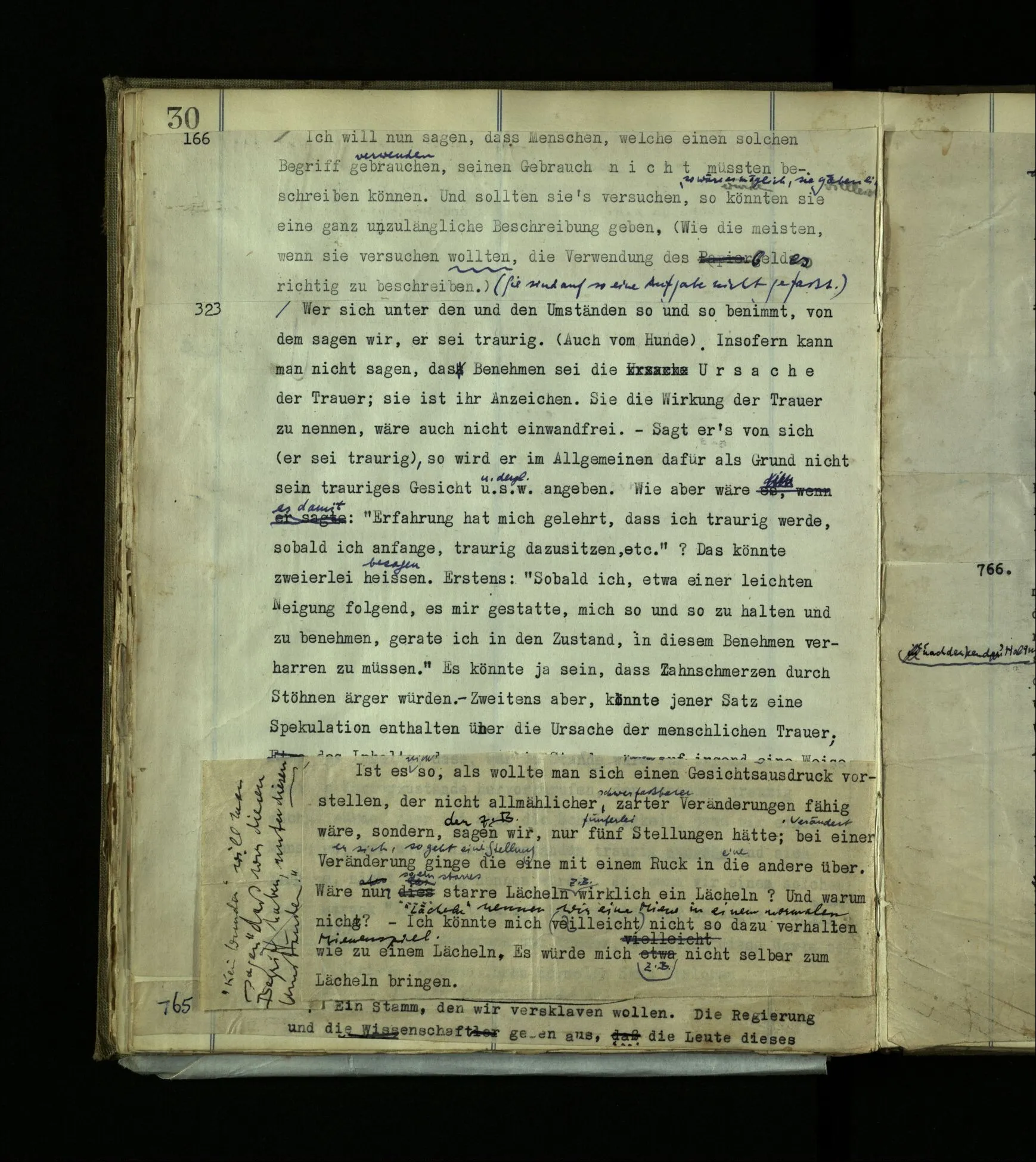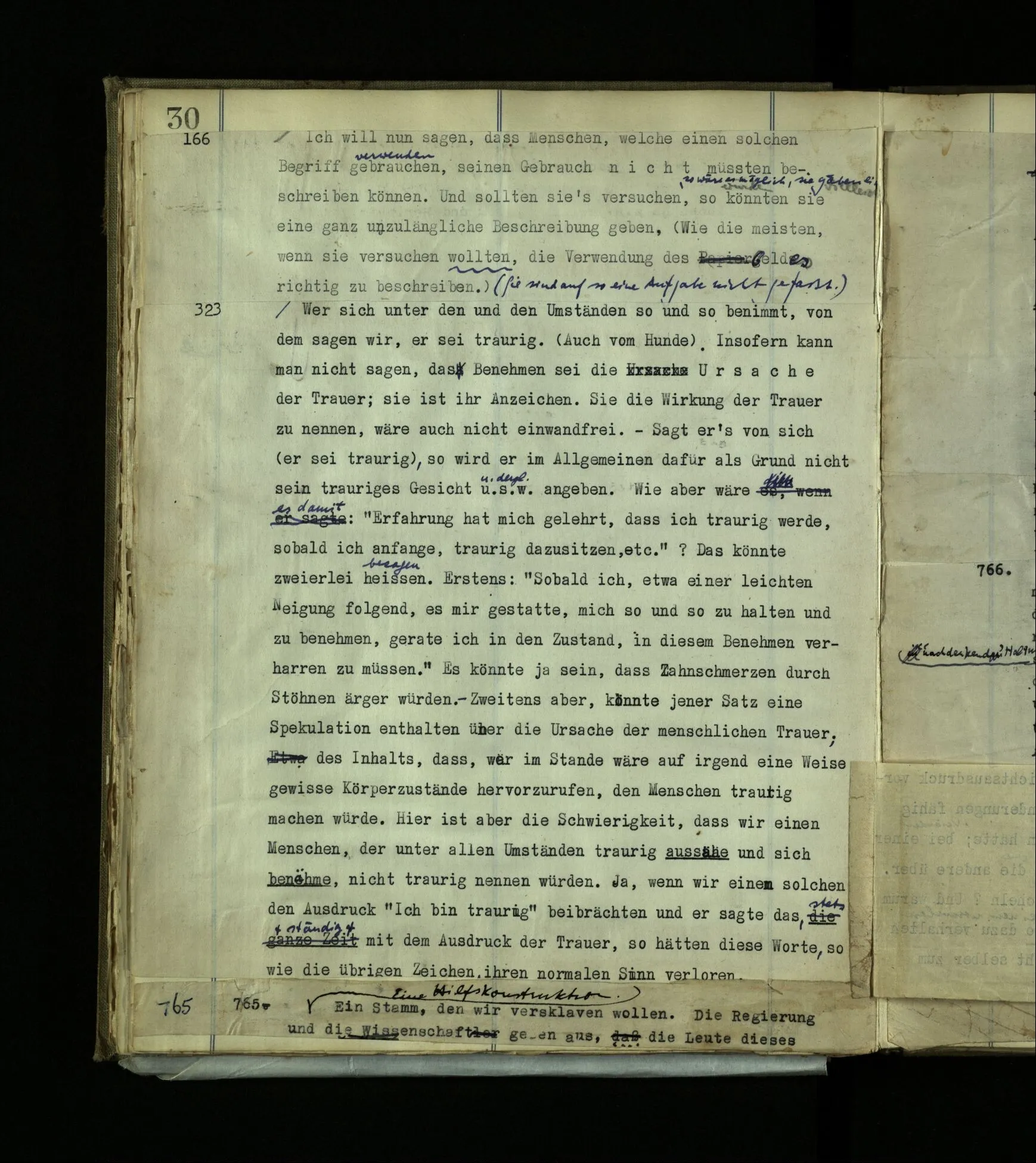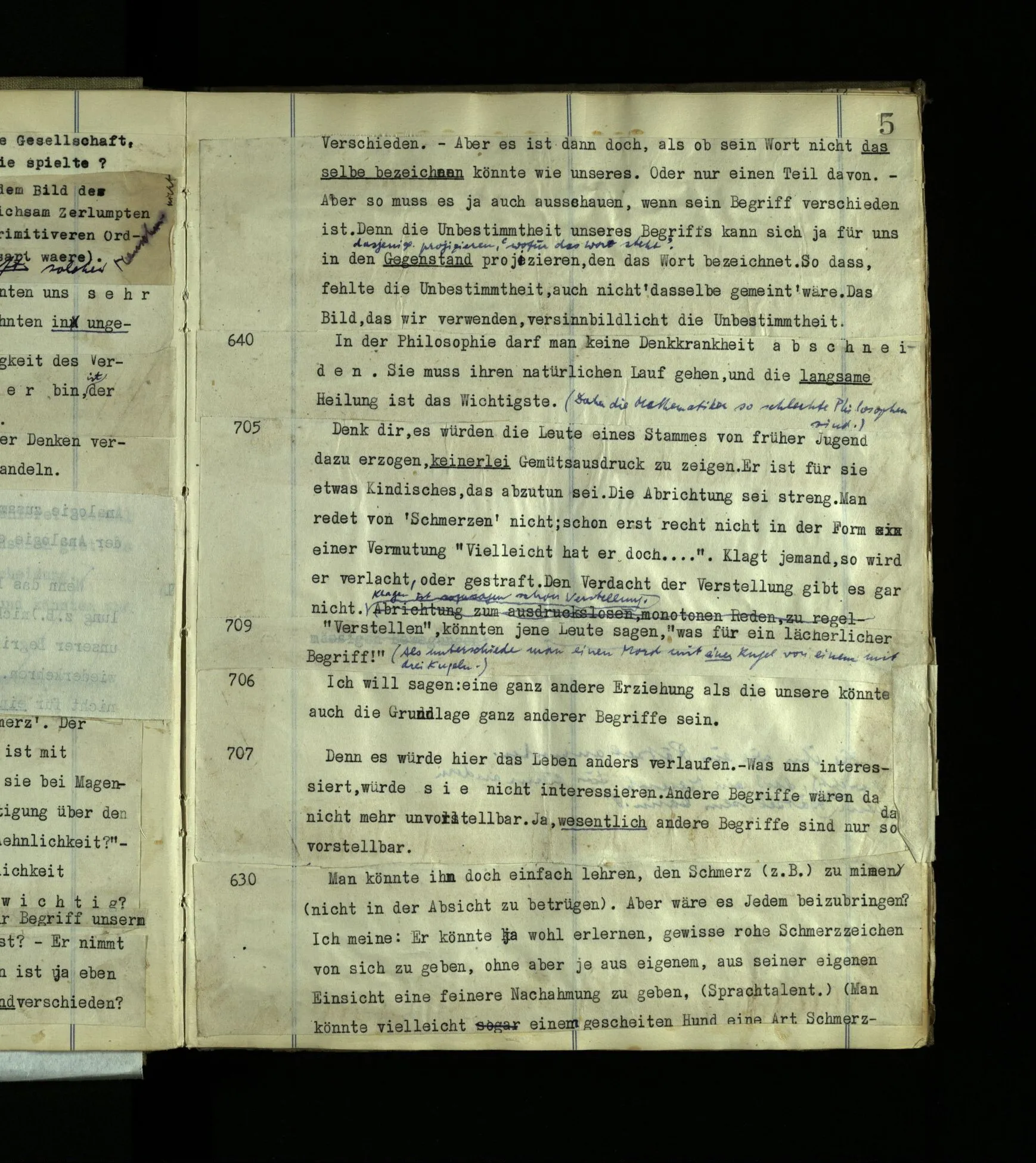 705 Denk dir, es würden die Leute eines Stammes von früher Jugend dazu erzogen, keinerlei Gemütsausdruck zu zeigen. Er ist für sie etwas Kindisches, das abzutun sei. Die Abrichtung sei streng. Man redet von ‘Schmerzen’ nicht; schon erst recht nicht in der Form einer Vermutung “Vielleicht hat er doch …”. Klagt jemand, so wird er verlacht, oder gestraft. Den Verdacht der Verstellung gibt es gar nicht. Klagen ist sozusagen schon Verstellung.