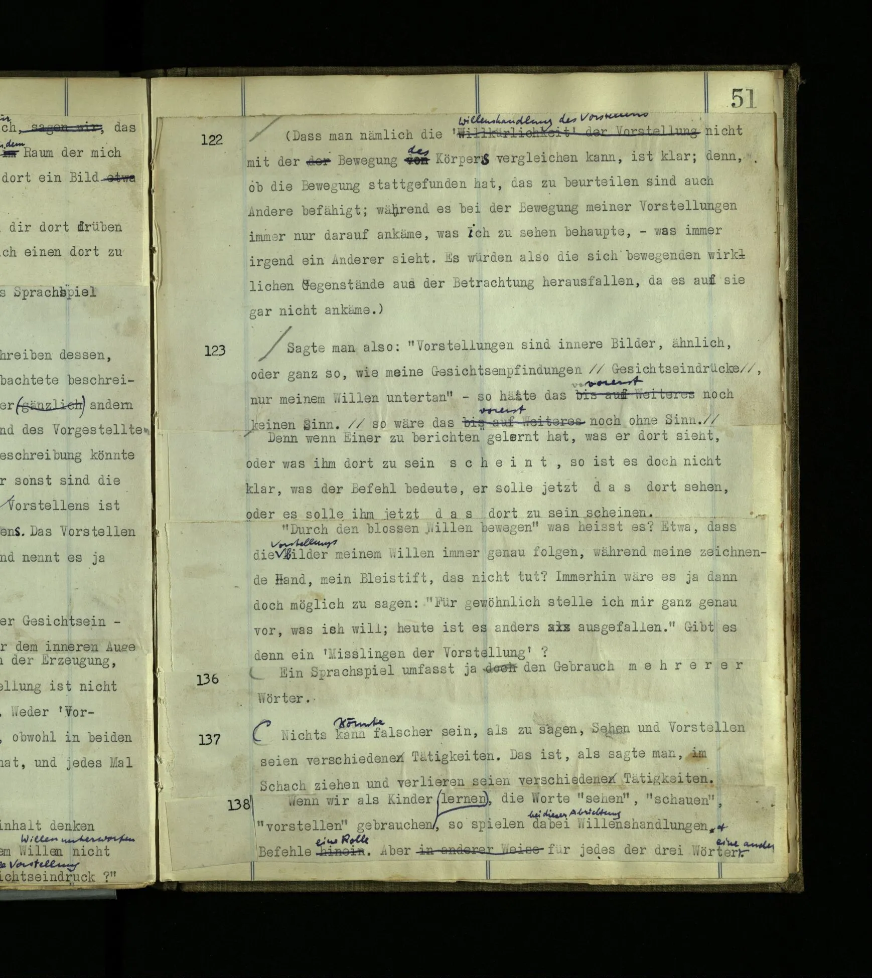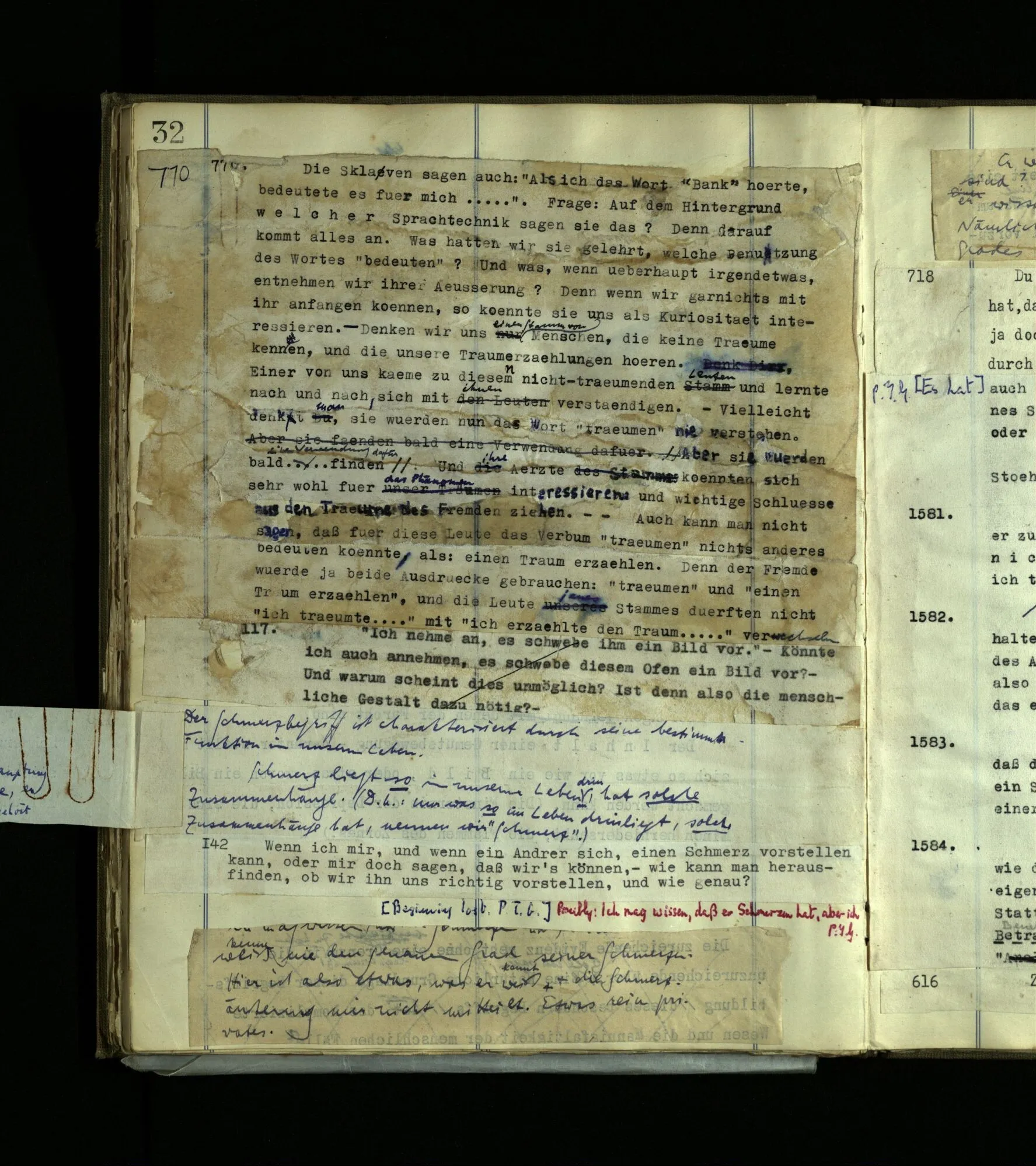 1600. Denke, in einem Tagtraum ließe ich mich sprechen “Ich phantasiere bloß”, wäre das wahr? Denke, ich schreibe so eine Phantasie, oder Erzählung, einen phantasierten Dialog, und in ihm sage ich “Ich phantasiere” – – aber, wenn ich es aufschreibe, – wie zeigt sich’s daß diese Worte Worte der Phantasie sind und daß ich nicht aus der Phantasie herausgetreten bin? Wäre es nicht wirklich möglich, daß der Träumende, sozusagen aus dem Traum heraustretend, im Schlaf spräche “Ich träume”? Es wäre wohl denkbar, daß so ein Sprachspiel existierte. Dies hängt mit dem Problem des ‘Meinens’ zusammen. Denn ich kann im Dialog eines Stücks schreiben “Ich bin gesund” und es also nicht meinen, obwohl es auch wahr ist. Die Worte gehören zu diesem und nicht zu jenem Sprachspiel.