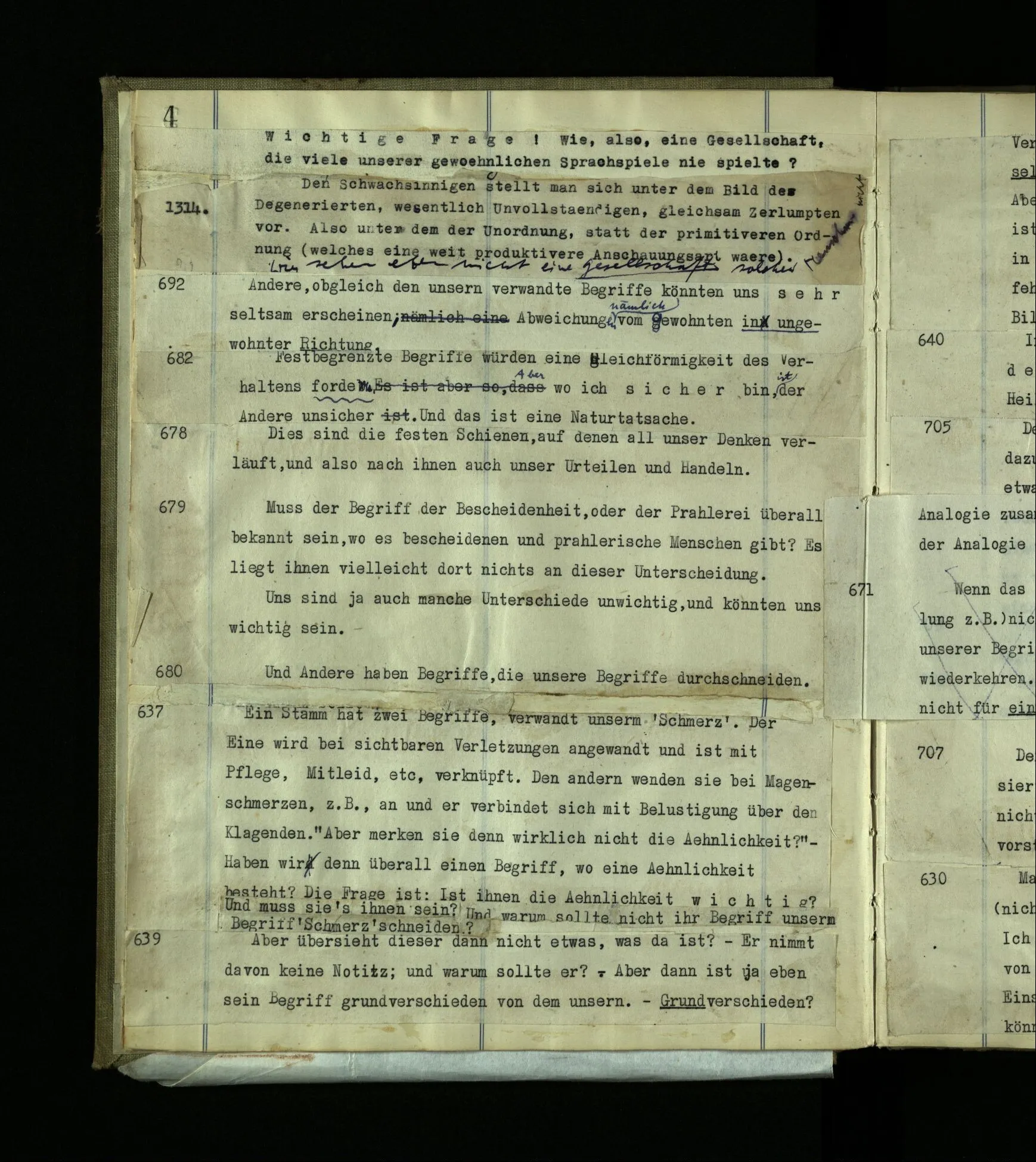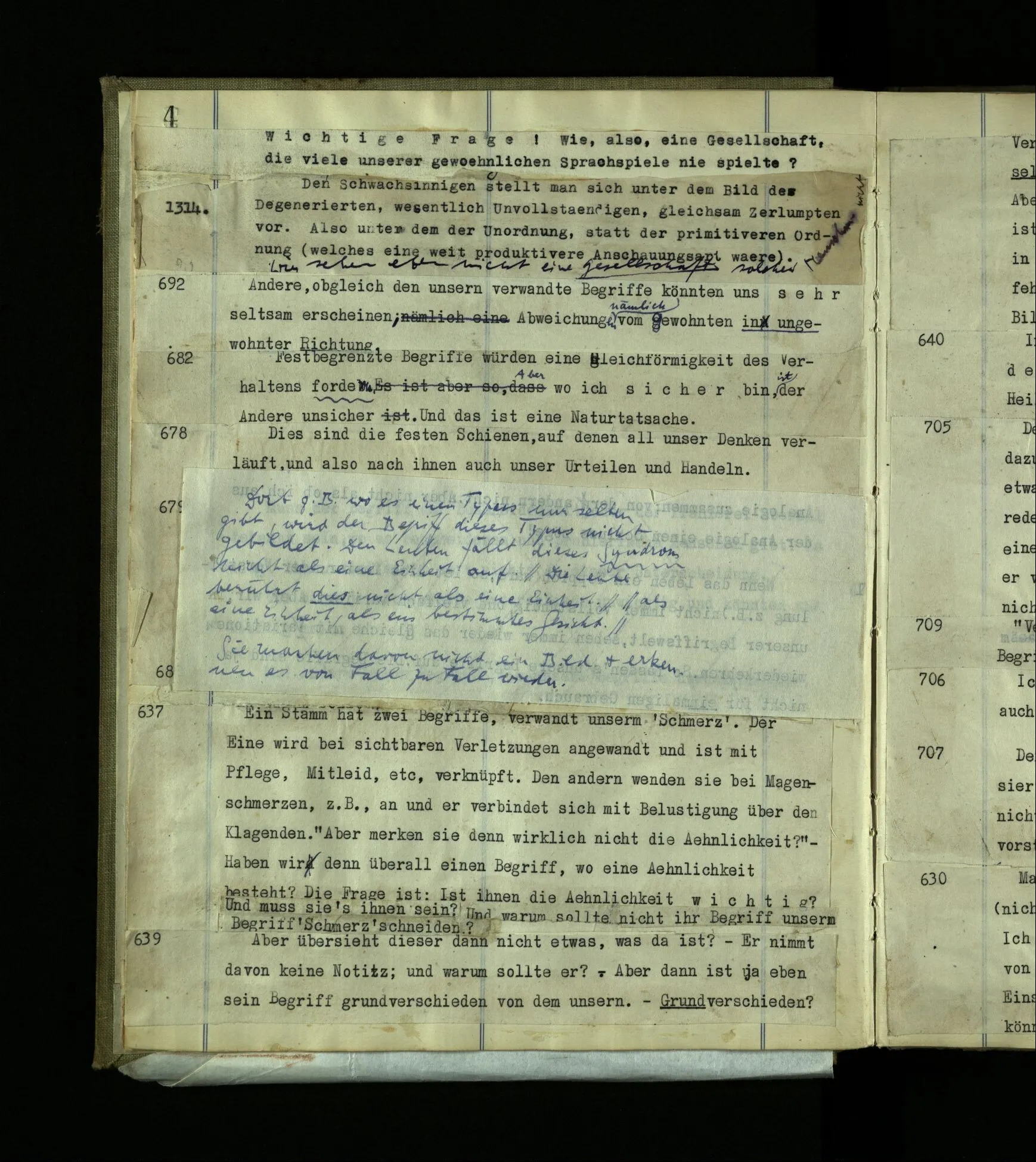 637 Ein Stamm hat zwei Begriffe, verwandt unserm ‘Schmerz’. Der Eine wird bei sichtbaren Verletzungen angewandt und ist mit Pflege, Mitleid, etc., verknüpft. Den anderen wenden sie bei Magenschmerzen, z.B., an und er verbindet sich mit Belustigung über den Klagenden. “Aber merken sie denn wirklich nicht die Ähnlichkeit?” – Haben wir denn überall einen Begriff, wo eine Ähnlichkeit besteht? Die Frage ist: Ist die Ähnlichkeit wichtig? Und muß sie’s ihnen sein? Und warum sollte nicht ihr Begriff unsern Begriff ‘Schmerz’ schneiden?