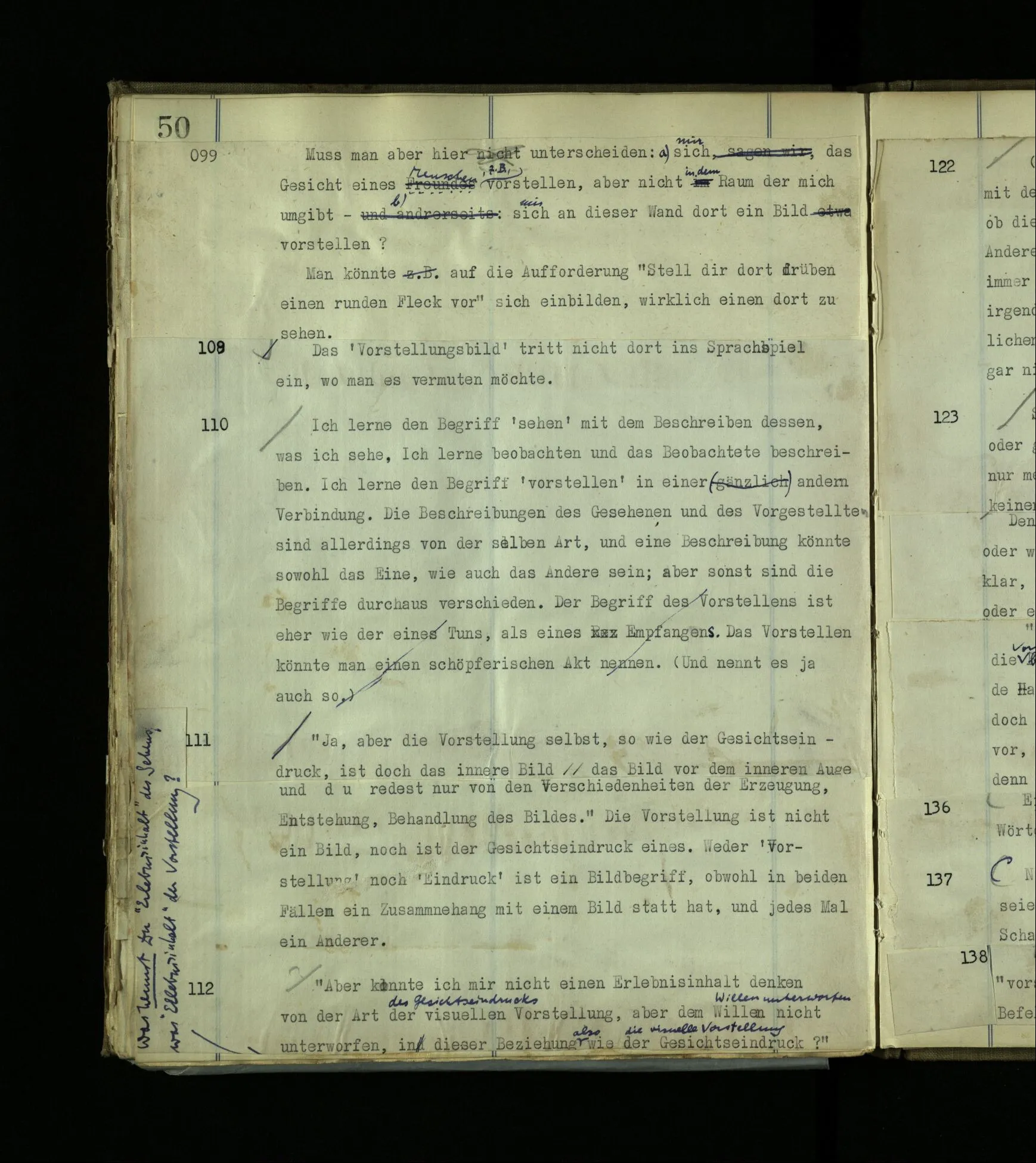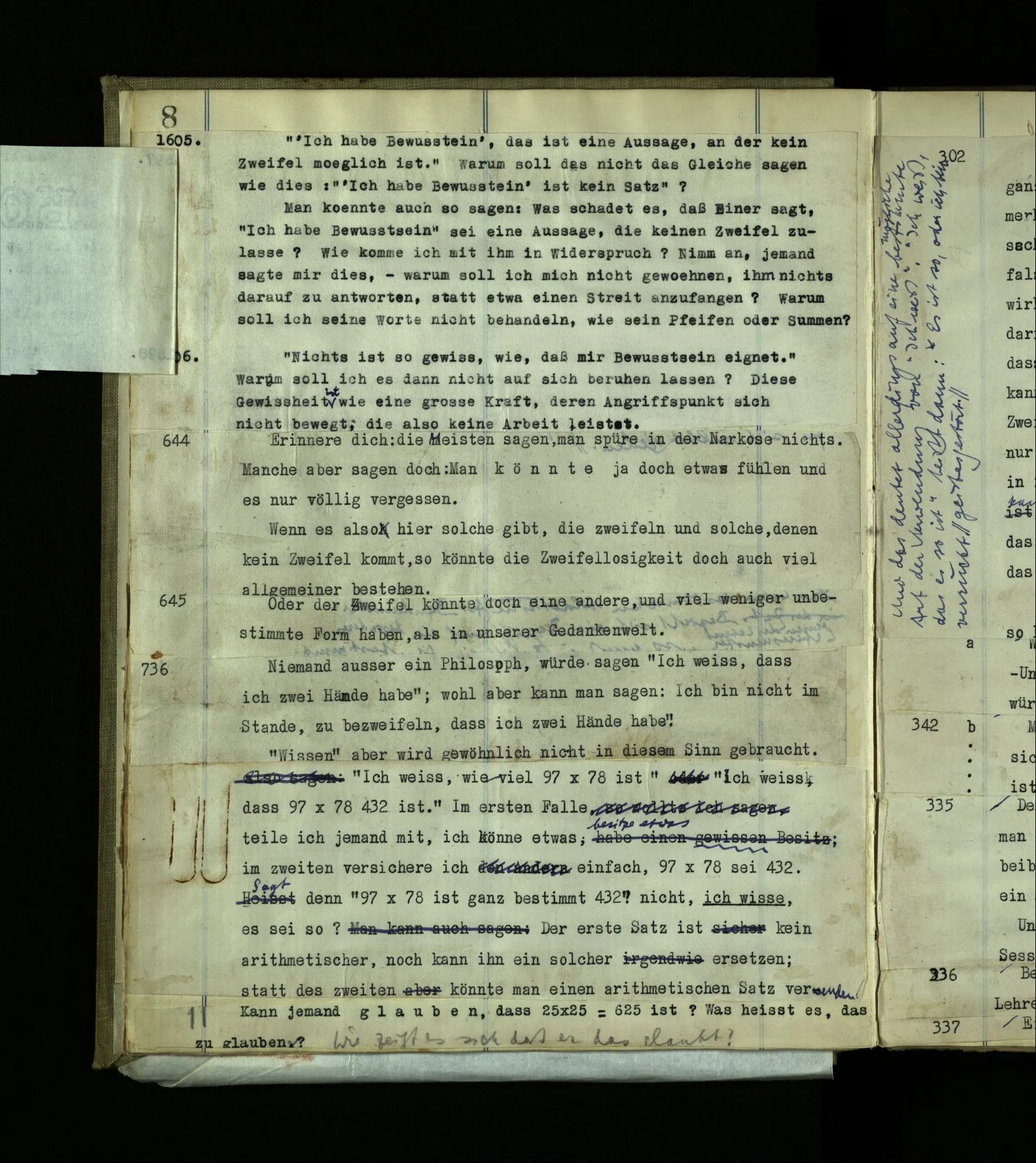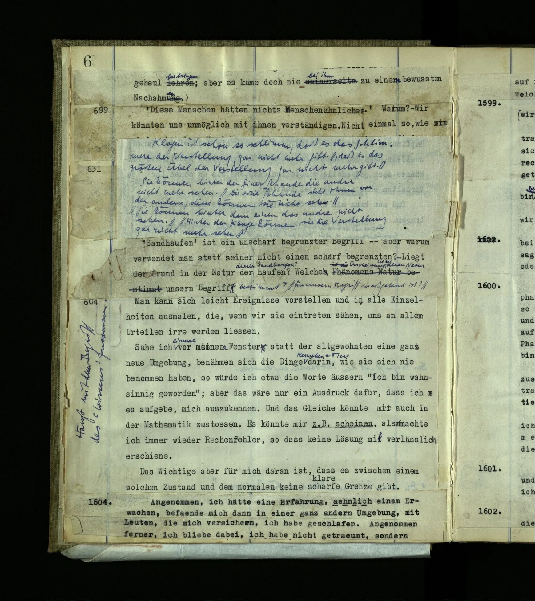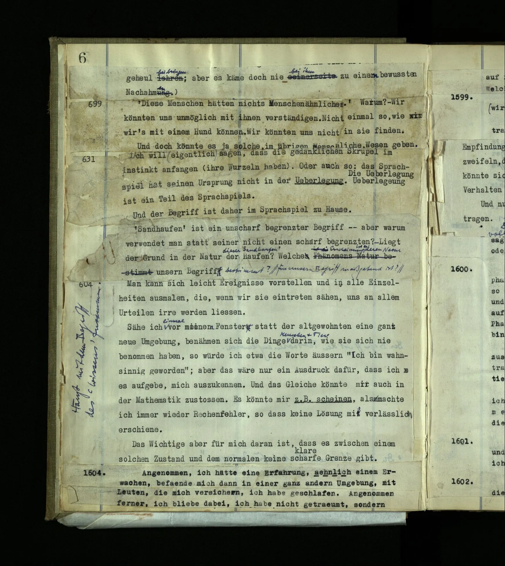 1599. Wie wäre es, wenn mir jemand allen Ernstes sagte, er wisse (wirklich) nicht, ob er träume oder wache? – Kann es diese Situation geben: Einer sagt “Ich glaube, ich träume jetzt”; wirklich wacht er bald danach auf, erinnert sich an jene Äußerung im Traum und sagt “So hatte ich also recht!” – – Diese Erzählung kann doch nur besagen: Einer habe geträumt, er hätte gesagt, er träume. Denke, ein Bewußtloser sagte (etwa in der Narkose) “Ich bin bei Bewußtsein“– würden wir sagen “Er muß es wissen”? Und wenn Einer im Schlaf spräche “Ich schlafe”, – würden wir sagen “Er hat ganz recht”? Spricht Einer die Unwahrheit, der mir sagt: “Ich bin nicht bei Bewußtsein”? (Und die Wahrheit, wenn er’s bewußtlos sagt? Und wie, wenn ein Papagei sagte “Ich verstehe kein Wort”, oder ein Grammophon “Ich bin bloß eine Maschine”?)