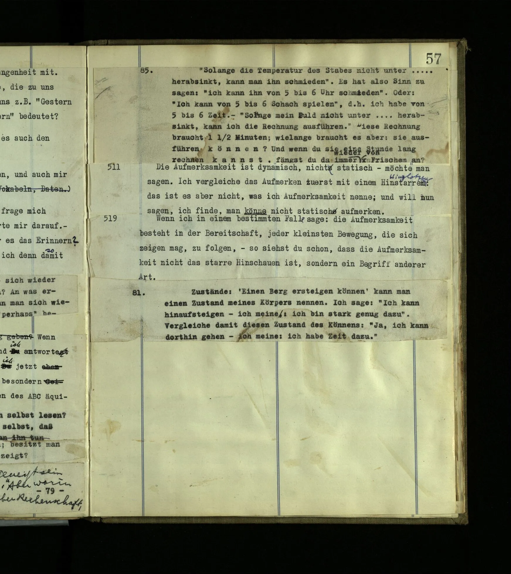 81. Zustände: ‘Einen Berg ersteigen können’ kann man einen Zustand meines Körpers nennen. Ich sage: “Ich kann hinaufsteigen – ich meine: ich bin stark genug dazu”. Vergleiche damit diesen Zustand des Könnens: “Ja, ich kann dorthin gehen – ich meine: ich habe Zeit dazu.”