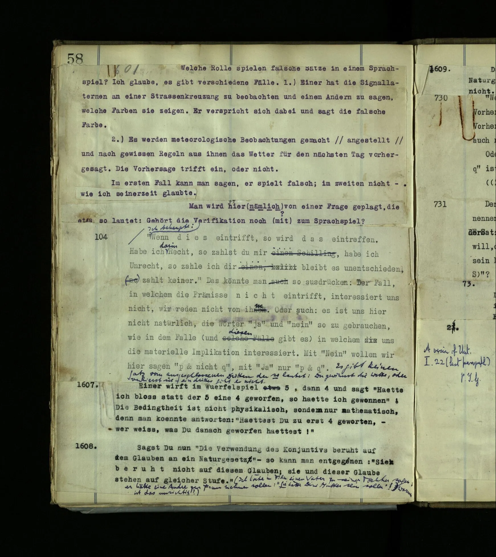 60 Welche Rolle spielen falsche Satze in einem Sprachspiel? Ich glaube, es gibt verschiedene Fälle. 1.) Einer hat die Signallaternen an einer Straßenkreuzung zu beobachten und einem Andern zu sagen, welche Farben sie zeigen. Er verspricht sich dabei und sagt die falsche Farbe. 2.) Es werden meteorologische Beobachtung gemacht und nach gewissen Regeln aus ihnen das Wetter für den nächsten Tag vorhergesagt. Die Vorhersage trifft ein, oder nicht. Im ersten Fall kann man sagen, er spielt falsch; im zweiten nicht – wie ich seinerzeit glaubte. Man wird hier (nämlich) von einer Frage geplagt, die etwa so lautet: Gehört die Verifikation noch (mit) zum Sprachspiel?