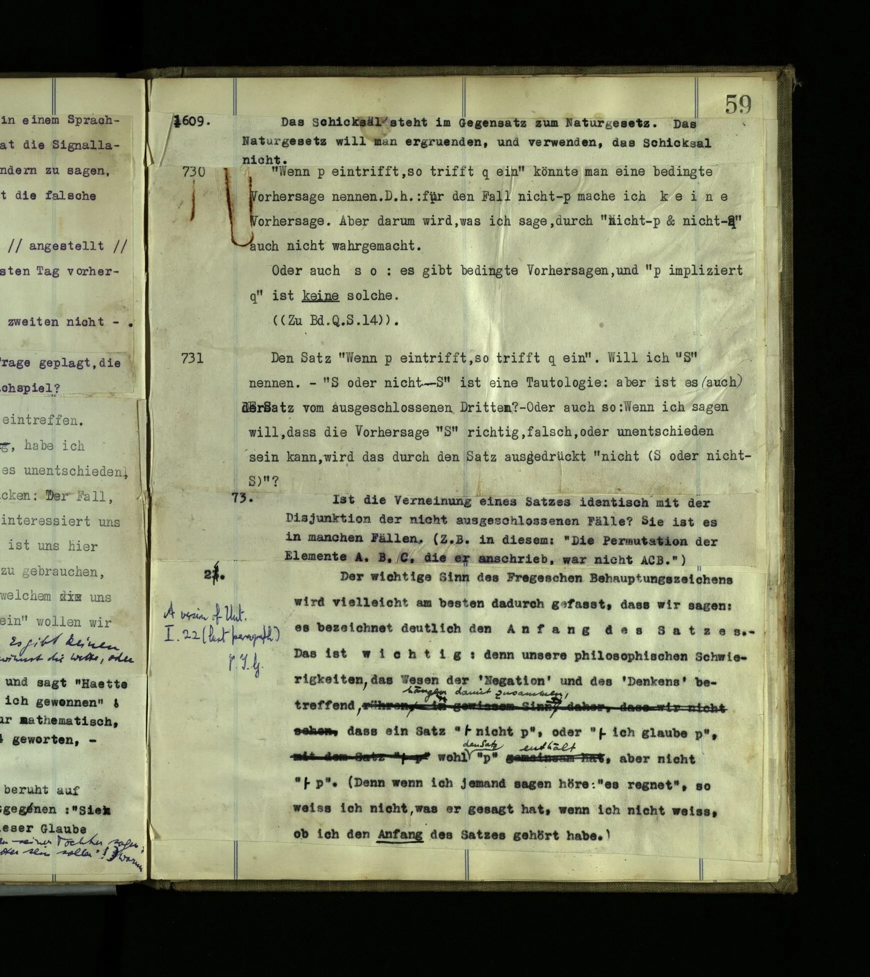 731 Den Satz “Wenn p eintrifft, so trifft q ein”. Will ich “S” nennen. –“S oder nicht-S” ist eine Tautologie: (aber) ist es auch der Satz vom ausgeschlossenen Dritten? – Oder auch so: Wenn ich sagen will, daß die Vorhersage “S” richtig, falsch, oder unentschieden sein kann, wird das durch den Satz ausgedrückt “nicht (S oder nicht-S)”?