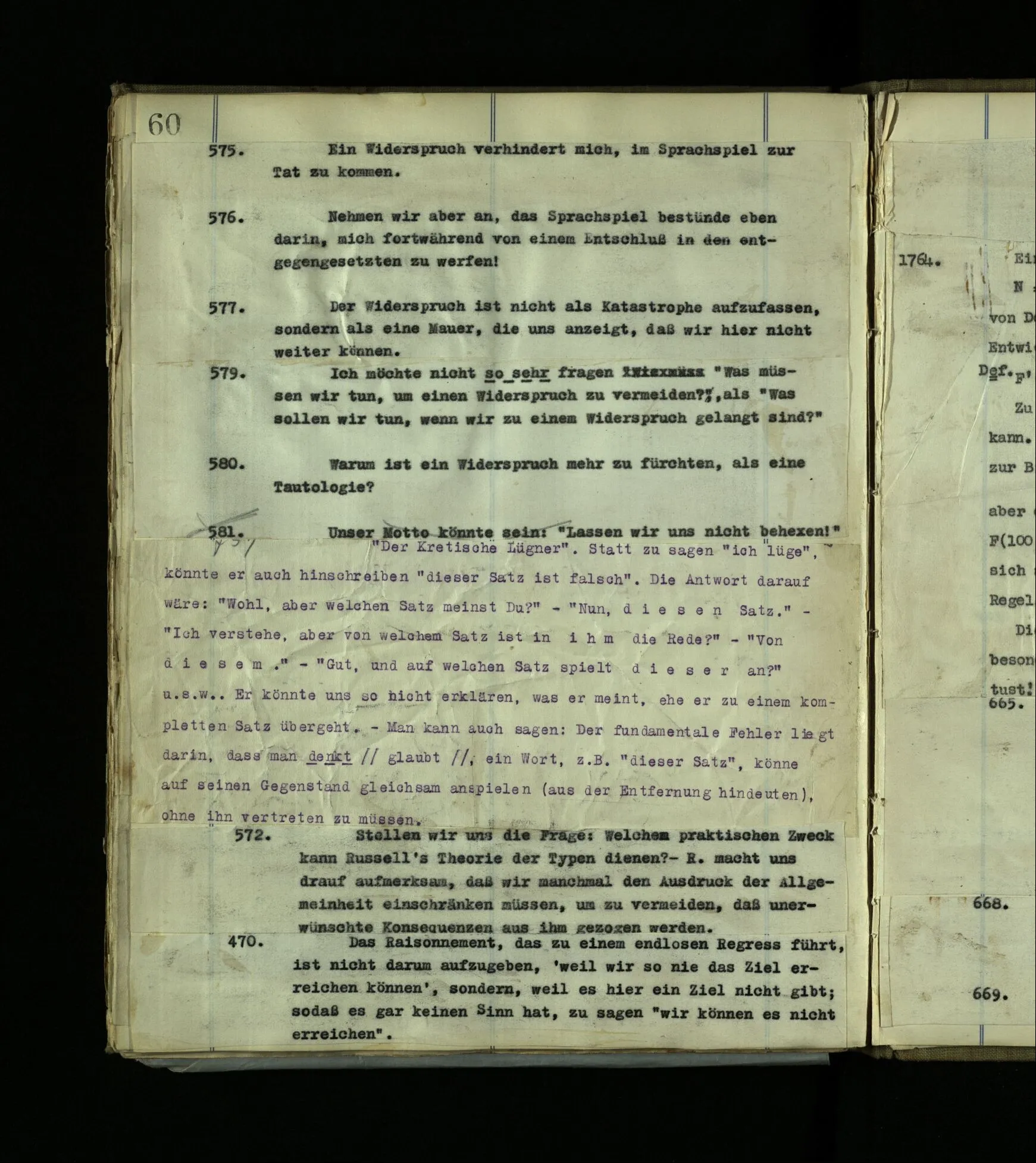 572. Stellen wir, uns die Frage: Welchem praktischen Zweck kann Russell’s Theorie der Typen dienen? – R. macht uns drauf aufmerksam, daß wir manchmal den Ausdruck der Allgemeinheit einschränken müssen, um zu vermeiden, daß unerwünschte Konsequenzen aus ihm gezogen werden.