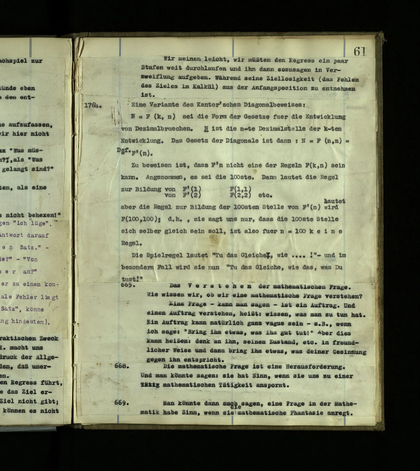 1764. Eine Variante des Cantor’schen Diagonalbeweises: N = F (k,n) sei die Form der Gesetze für die Entwicklung von Dezimalbrüchen. N ist die n-te Dezimalstelle der k-ten Entwicklung. Das Gesetz der Diagonale ist dann: N = F (n,n) ≝ F’(n). Zu beweisen ist, daß F’n nicht eine der Regeln F(k,n) sein kann. Angenommen, es sei die 100ste. Dann lautet die Regel zur Bildung von F’(1) F(1,1) von F’(2) F(2,2) etc.