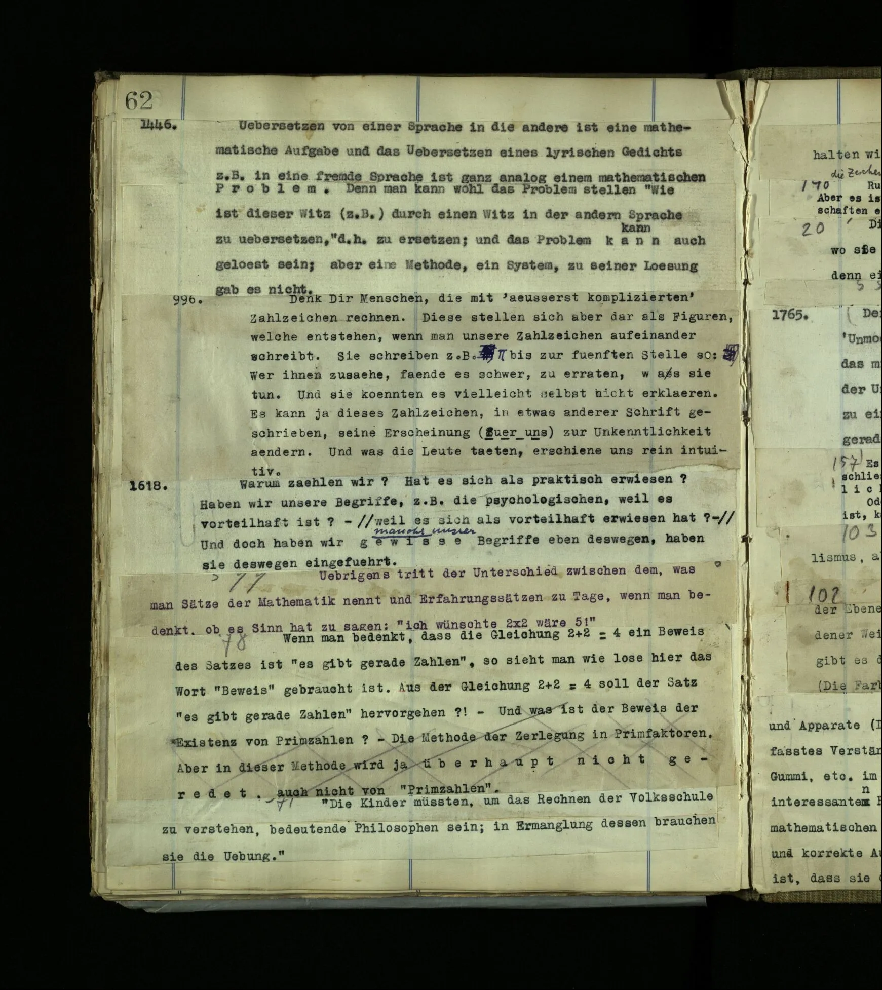1618. Warum zählen wir? Hat es sich als praktisch erwiesen? Haben wir unsere Begriffe, z.B. die psychologischen, weil es vorteilhaft ist? – Und doch haben wir gewisse Begriffe eben deswegen, haben sie deswegen eingeführt. Übrigens tritt der Unterschied zwischen dem, was man Sätze der Mathematik nennt und Erfahrungssätzen zu Tage, wenn man bedenkt, ob es Sinn hat zu sagen: “ich wünschte 2 × 2 wäre 5!” Wenn man bedenkt, daß die Gleichung 2 + 2 = 4 ein Beweis des Satzes ist “es gibt gerade Zahlen”, so sieht man wie lose hier das Wort “Beweis” gebraucht ist. Aus der Gleichung 2 + 2 = 4 soll der Satz “es gibt gerade Zahlen” hervorgehen?! – Und was ist der Beweis der Existenz von Primzahlen? – Die Methode der Zerlegung in Primfaktoren. Aber in dieser Methode wird ja überhaupt nicht geredet, auch nicht von “Primzahlen”. “Die Kinder müßten, um das Rechnen der Volksschule zu verstehen, bedeutende Philosophen sein, in Ermanglung dessen brauchen sie die Übung.” Wenn wir eine Erklärung, etwa des logischen Folgens, lesen, so halten wir uns an das, was Er schreibt. Wir halten uns an die Worte; an die Zeichen