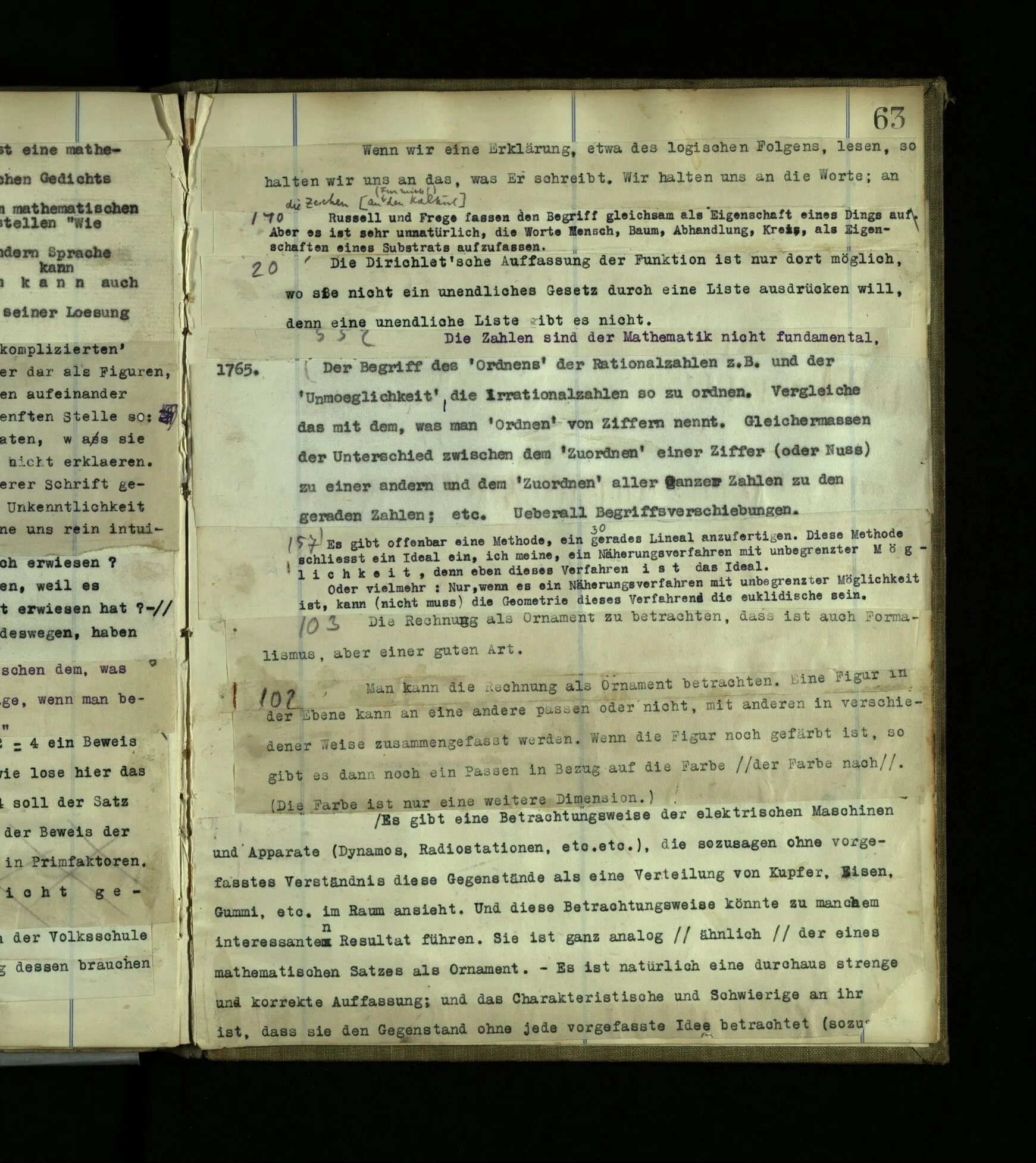 1765. Der Begriff des ‘Ordnens’ der Rationalzahlen z.B. und der ‘Unmöglichkeit’, die Irrationalzahlen so zu ordnen. Vergleiche das mit dem, was man ‘Ordnen’ von Ziffern nennt. Gleichermaßen der Unterschied zwischen dem ‘Zuordnen’ einer Ziffer (oder Nuß) zu einer andern und dem ‘Zuordnen’ aller ganzer Zahlen zu den geraden Zahlen; etc. Überall Begriffsverschiebungen.