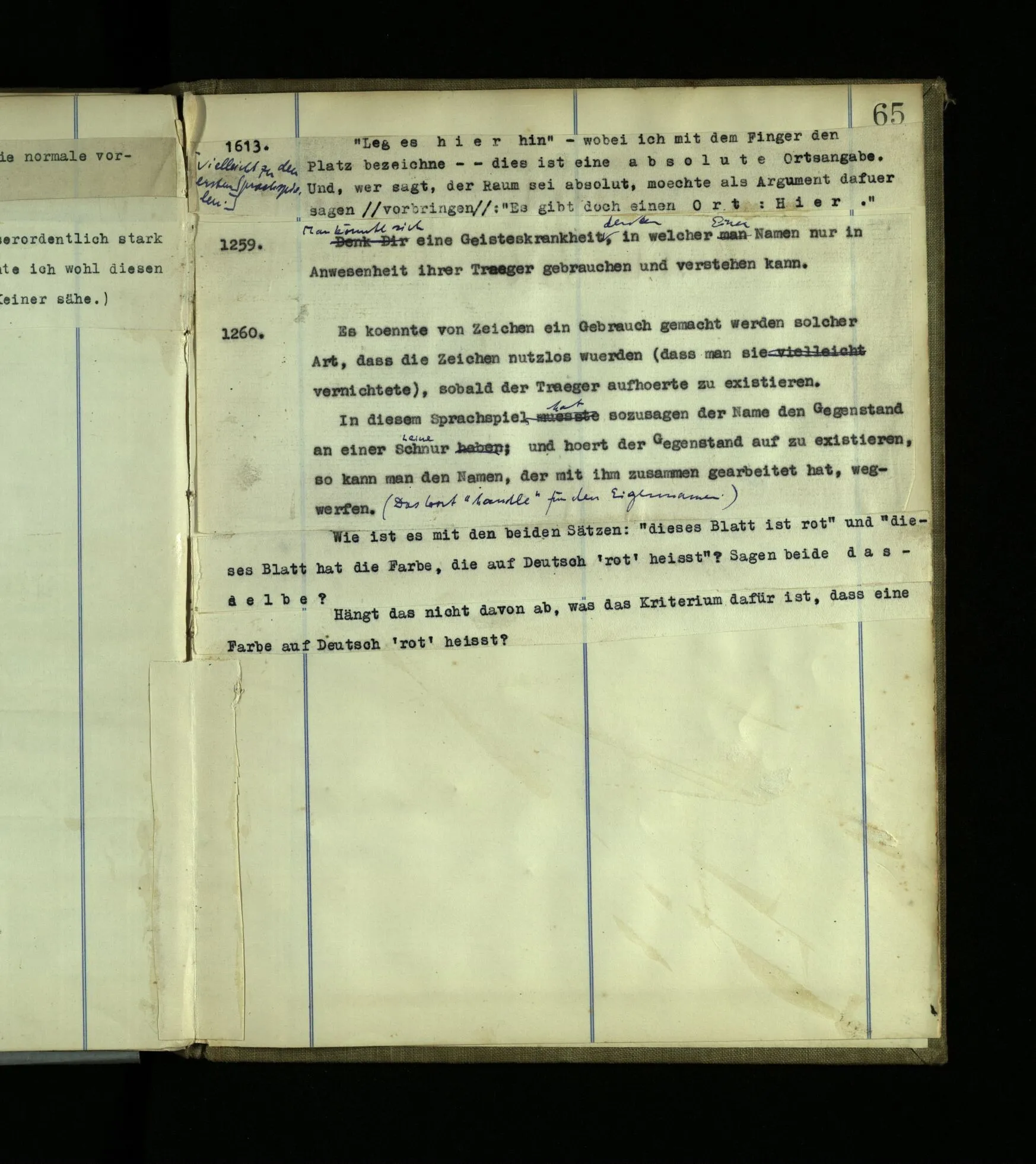 1259. Man könnte sich eine Geisteskrankheit denken, in welcher Einer Namen nur in Anwesenheit ihrer Träger gebrauchen und verstehen kann.