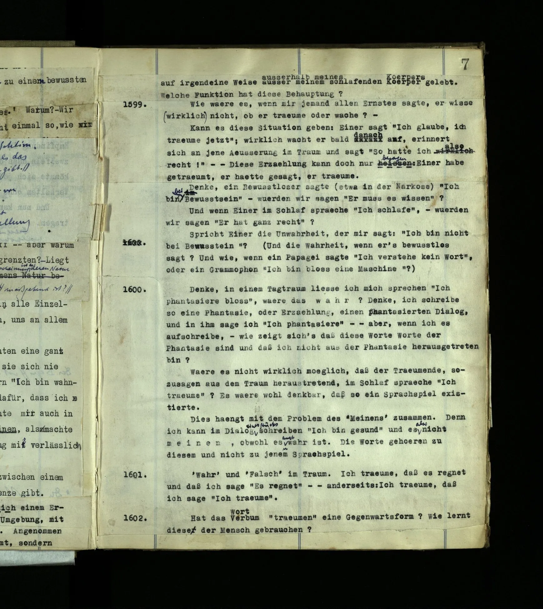 1601. ‘Wahr’ und ‘Falsch’ im Traum. Ich träume, daß es regnet und daß ich sage “Es regnet” – – anderseits: Ich träume, daß ich sage “Ich träume”.
