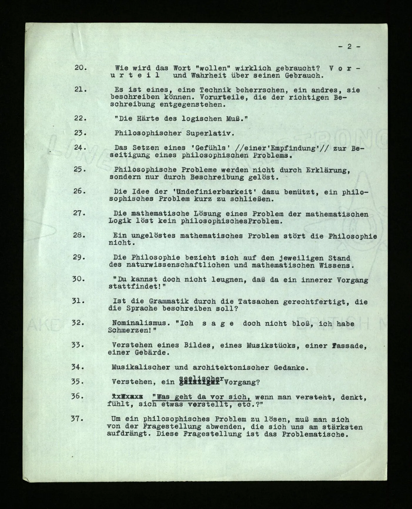 37. Um ein philosophisches Problem zu lösen, muß man sich von der Fragestellung abwenden, die sich uns am stärksten aufdrängt. Diese Fragestellung ist das Problematische. Jede philosophische Frage ist eine ‘fragwürdige Frage’
