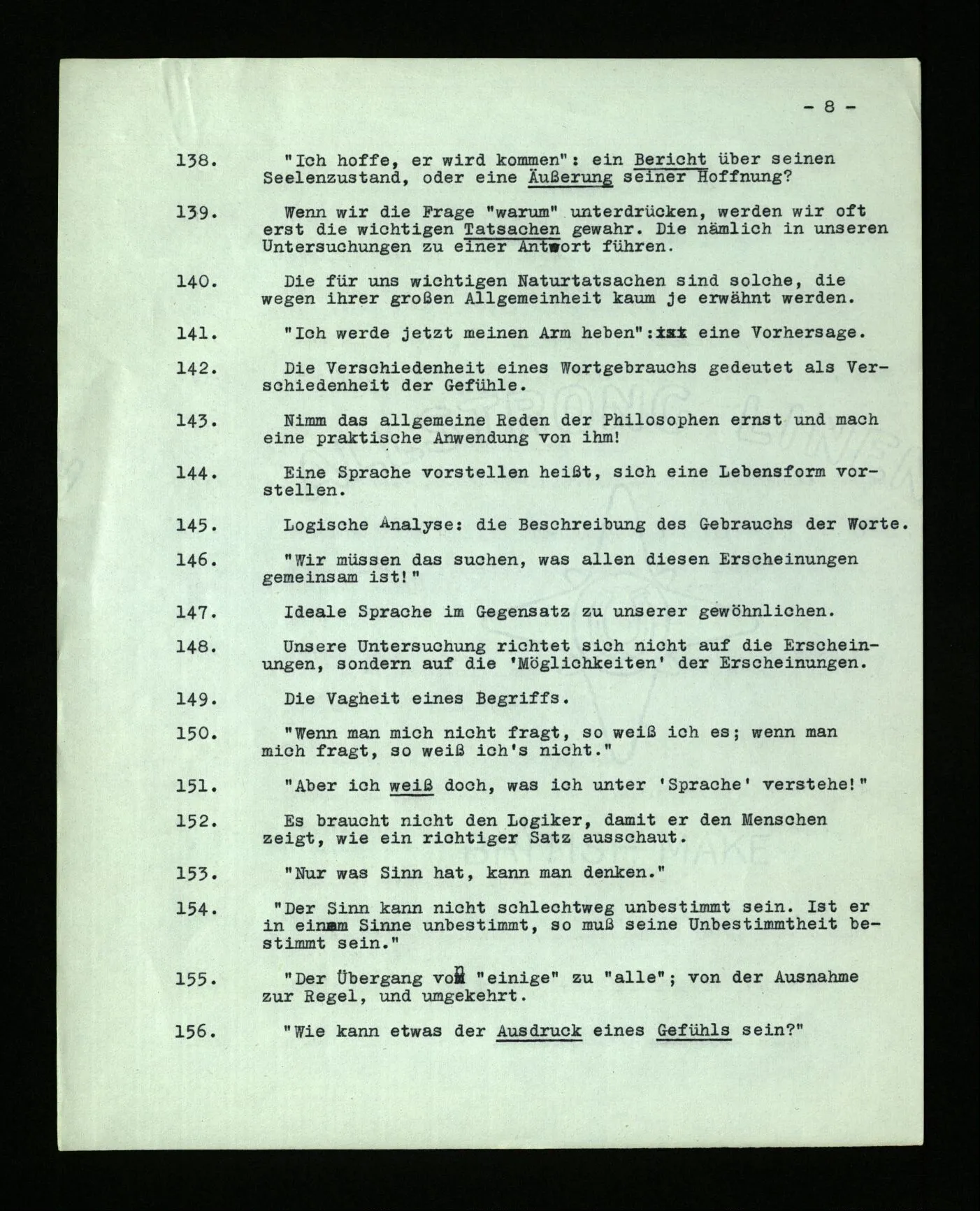 139. Wenn wir die Frage “warum” unterdrücken, werden wir oft erst die wichtigen Tatsachen gewahr. Die nämlich in unseren Untersuchungen zu einer Antwort führen.
