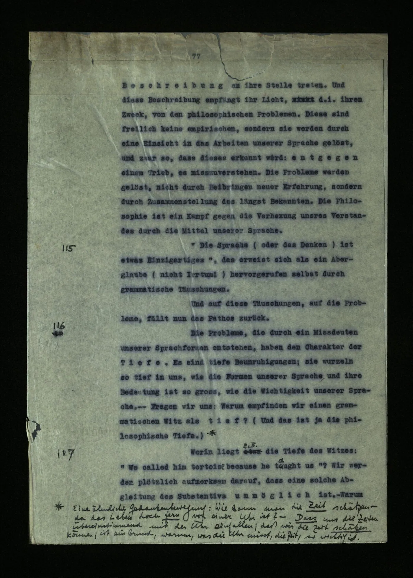 115 “Die Sprache (oder das Denken) ist etwas Einzigartiges”, das erweist sich als ein Aberglaube (nicht Irrtum!) hervorgerufen selbst durch grammatische Täuschungen. Und auf diese Täuschungen, auf die Probleme, fällt nun das Pathos zurück.