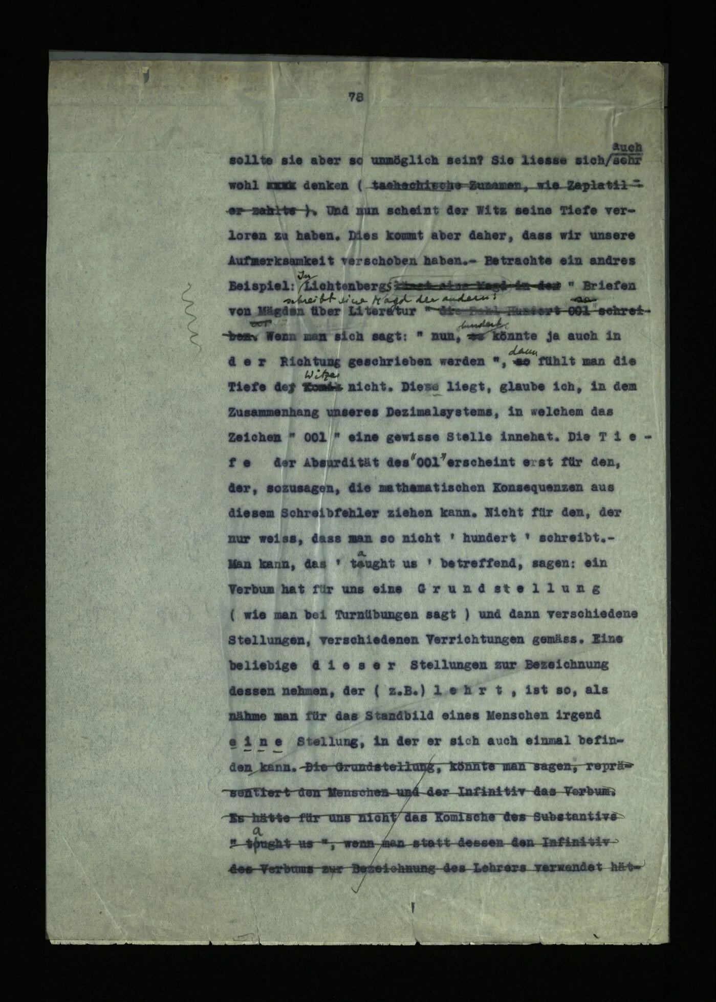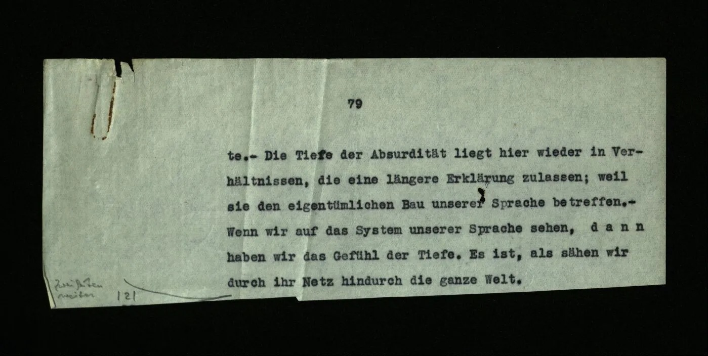 117 Worin liegt z.B. die Tiefe des Witzes: “We called him tortoise because he taught us”? Wir werden plötzlich aufmerksam darauf, daß eine solche Ableitung des Substantivs unmöglich ist. – Warum Eine ähnliche Gedankenbewegung: Wie kann man die Zeit schätzen, da das Leben doch fern von einer Uhr ist? – Daß uns die Zeit übereinstimmend mit der Uhr einfallen; daß wir die Zeit schätzen können; ist ein Grund, warum, was die Uhr meint, die Zeit, so wichtig ist. sollte sie aber so unmöglich sein? Sie ließe sich auch sehr wohl denken. Und nun scheint der Witz seine Tiefe verloren zu haben. Dies kommt aber daher, daß wir unsere Aufmerksamkeit verschoben haben. – Betrachte ein andres Beispiel: In Lichtenbergs “Briefen von Mägden über Literatur” schreibt eine Magd der anderen die Zahl Hundert so 001 Wenn man sich sagt: “nun, hundert könnte ja auch in der Richtung geschrieben werden”, dann fühlt man die Tiefe des Witzes nicht. Diese liegt, glaube ich, in dem Zusammenhang unseres Dezimalsystems, in welchem das Zeichen “001” eine gewisse Stelle innehat. Die Tiefe der Absurdität des “001” erscheint erst für den, der, sozusagen, die mathematischen Konsequenzen aus diesem Schreibfehler ziehen kann. Nicht für den, der nur weiß, daß man so nicht ‘hundert’ schreibt. – Man kann, das ‘taught us’ betreffend, sagen: ein Verbum hat für uns eine Grundstellung (wie man bei Turnübungen sagt) und dann verschiedene Stellungen, verschiedenen Verrichtungen gemäß. Eine beliebige dieser Stellungen zur Bezeichnung dessen nehmen, der (z.B.) lehrt, ist so, als nähme man für das Standbild eines Menschen irgend eine Stellung, in der er sich auch einmal befinden kann. Die Tiefe der Absurdität liegt hier wieder in Verhältnissen, die eine längere Erklärung zulassen; weil sie den eigentümlichen Bau unserer Sprache betreffen. – Wenn wir auf das System unserer Sprache sehen, dann haben wir das Gefühl der Tiefe. Es ist, als sähen wir durch ihr Netz hindurch die ganze Welt.